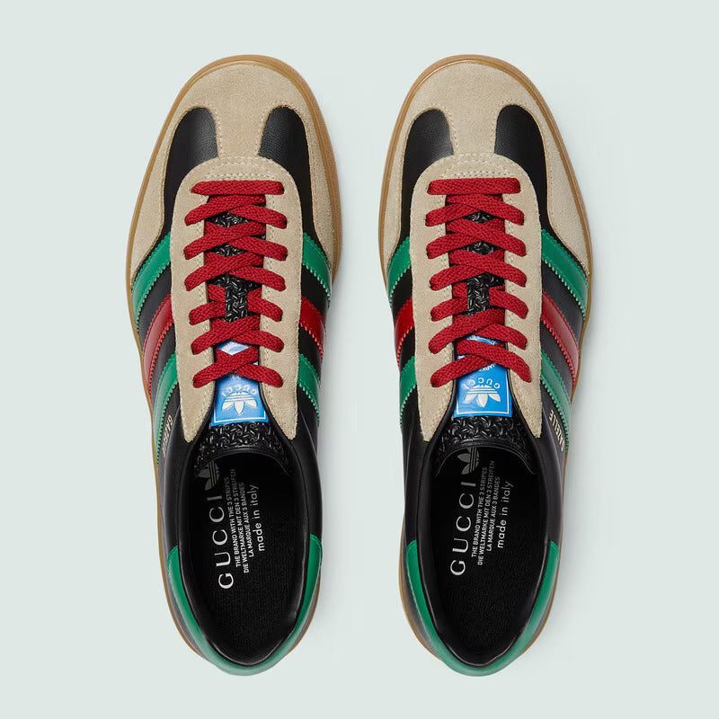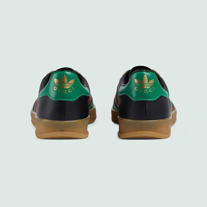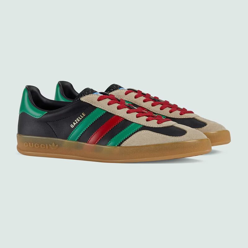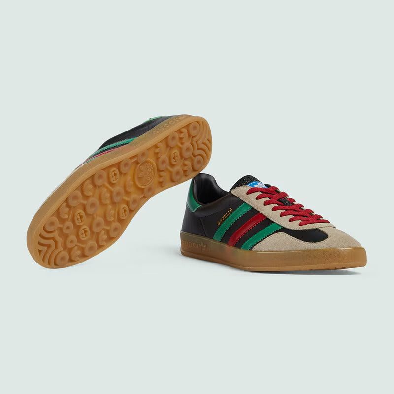 adidas and Gucci venture into a collection, where the Web juxtaposes with the three white stripes, and the GG monogram combines with the trefoil. Inspired by the ‘80s and ‘90s, emblematic House’s motifs mix with those of the historic sportswear brand adidas resulting in a series of hybrid looks. This Gazelle sneaker is enriched with Gucci Trefoil details.
