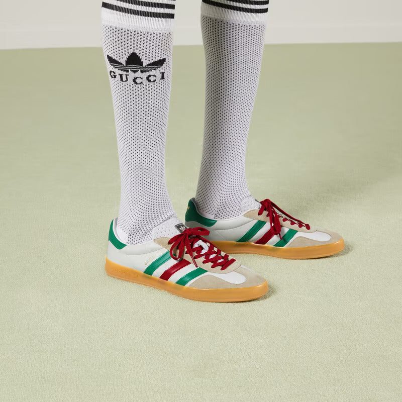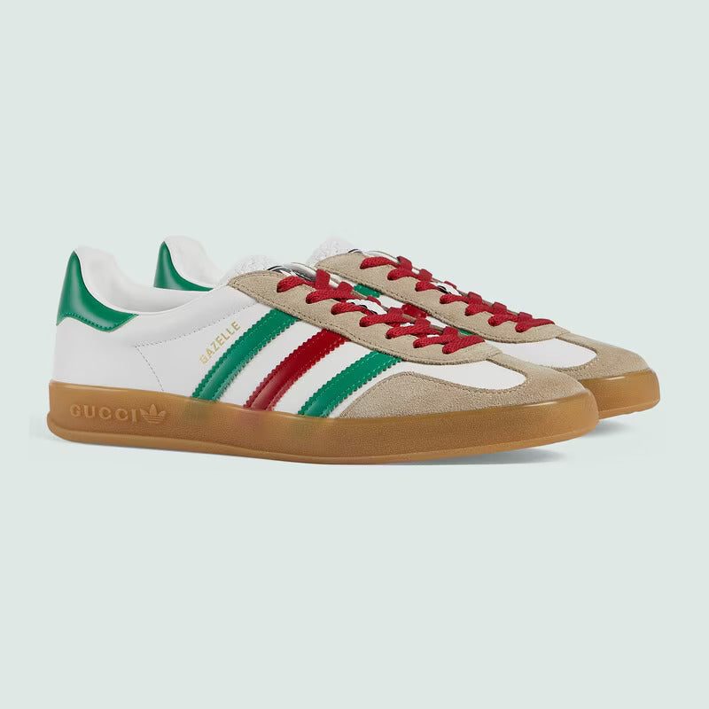 adidas and Gucci venture into a collection, where the Web juxtaposes with the three white stripes, and the GG monogram combines with the trefoil. Inspired by the ‘80s and ‘90s, emblematic House’s motifs mix with those of the historic sportswear brand adidas resulting in a series of hybrid looks. This Gazelle sneaker is enriched with Gucci Trefoil details.