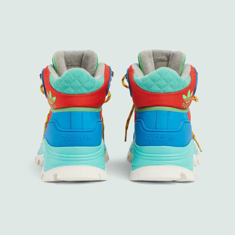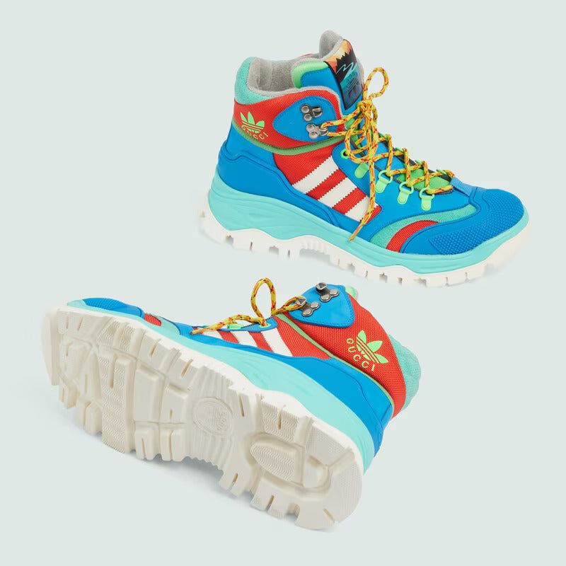 A second chapter in the adidas and Gucci collection, where the Web continues to juxtapose with the three white stripes and the GG monogram combines with the Trefoil. Inspired by the '80s and '90s, emblematic House’s motifs mix with those of the historic sportswear brand adidas resulting in a series of hybrid looks. This men's lace-up boot features a unqiue Gucci Trefoil vintage mountain label.