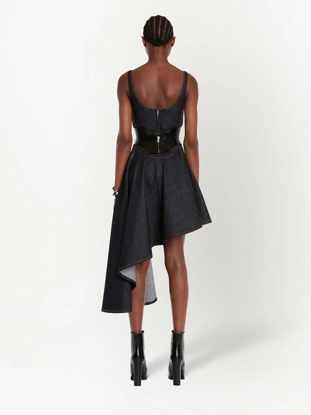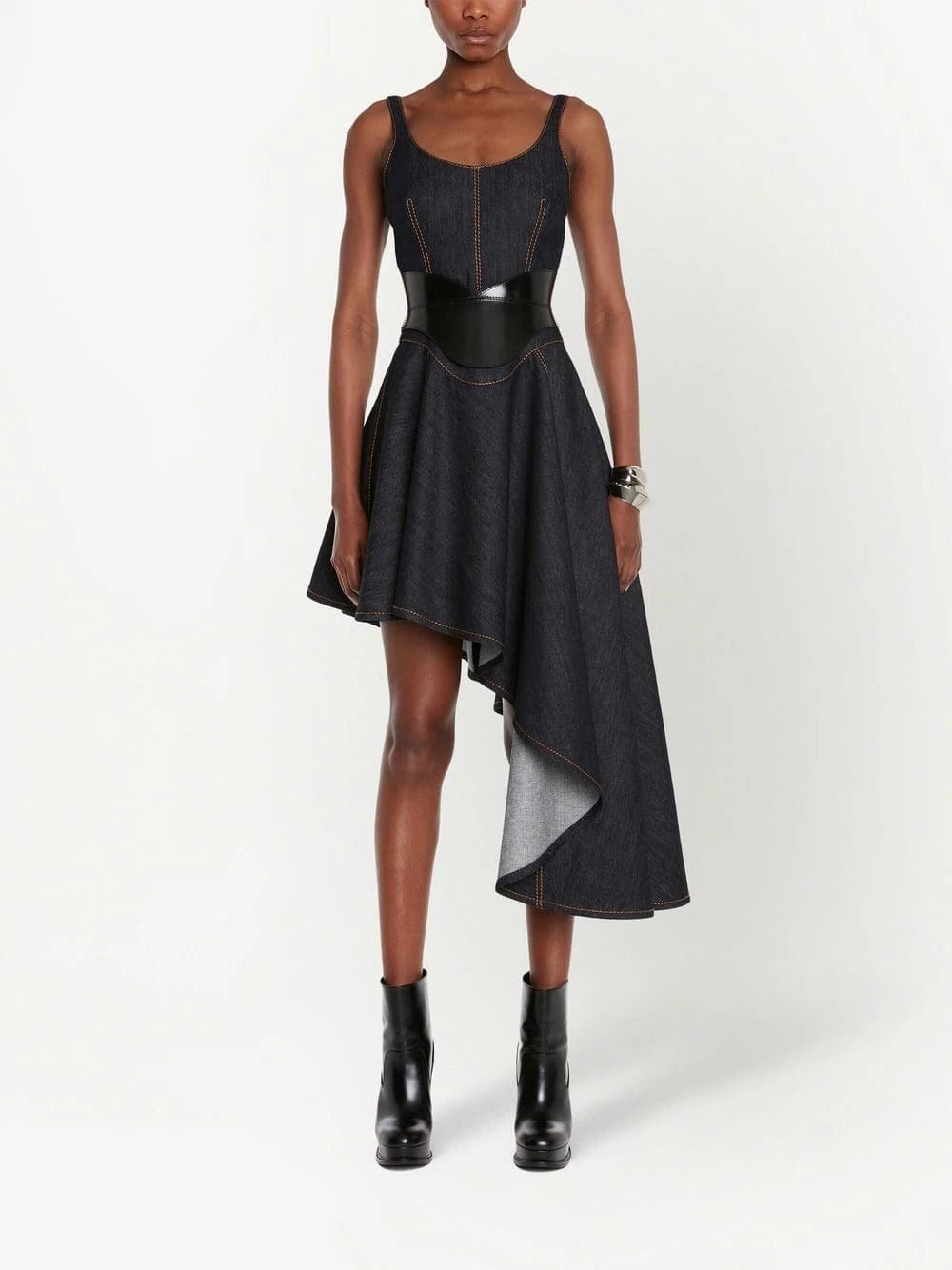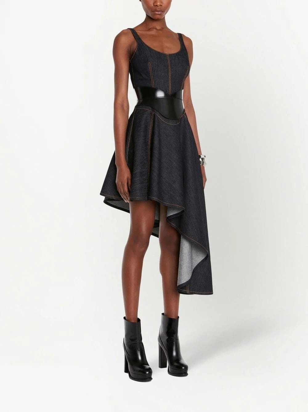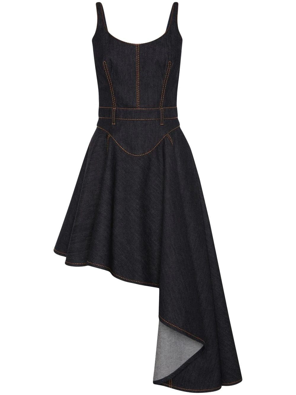 Renowned for masterful tailoring, Alexander McQueen presents this denim dress for SS23 in a classic dark wash. The corset style and asymmetric hem offer the finishing touches to the garment.