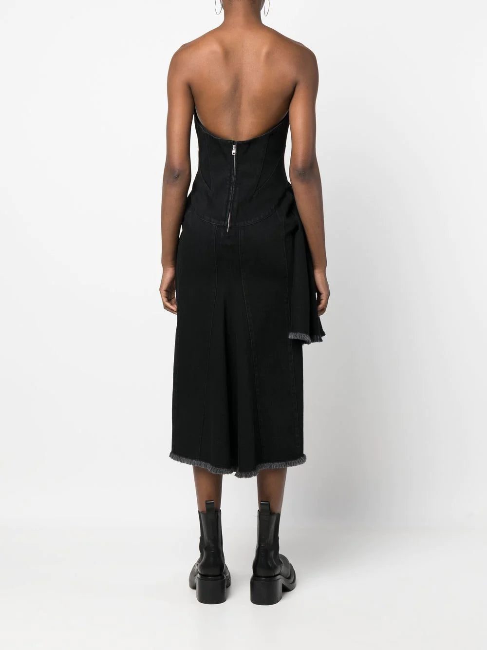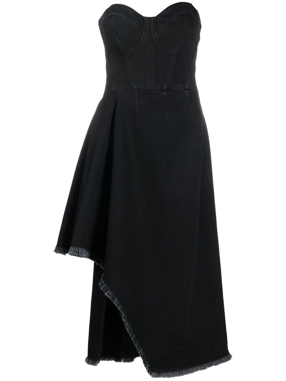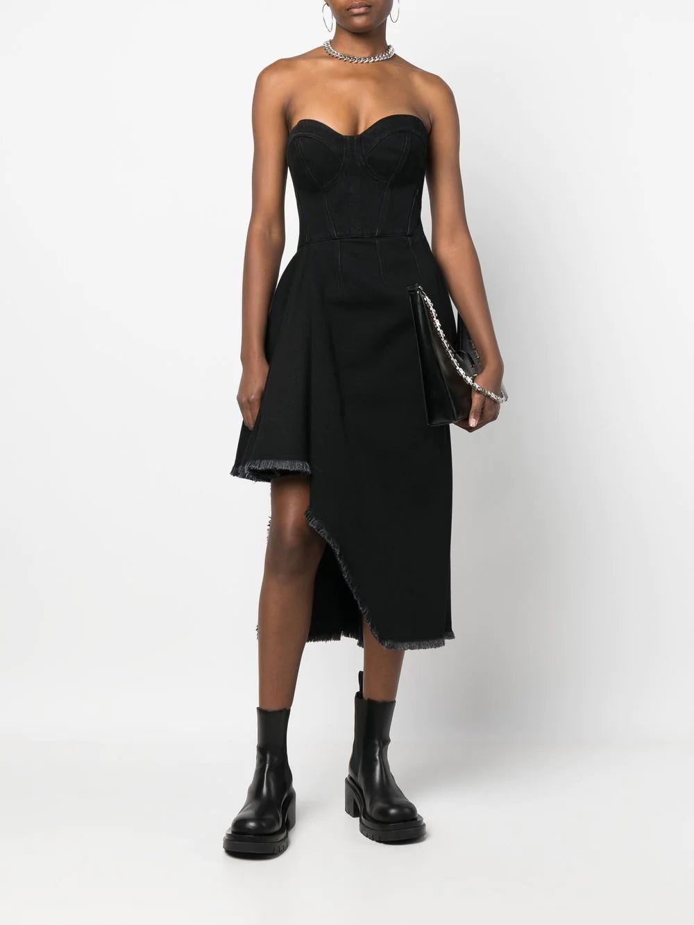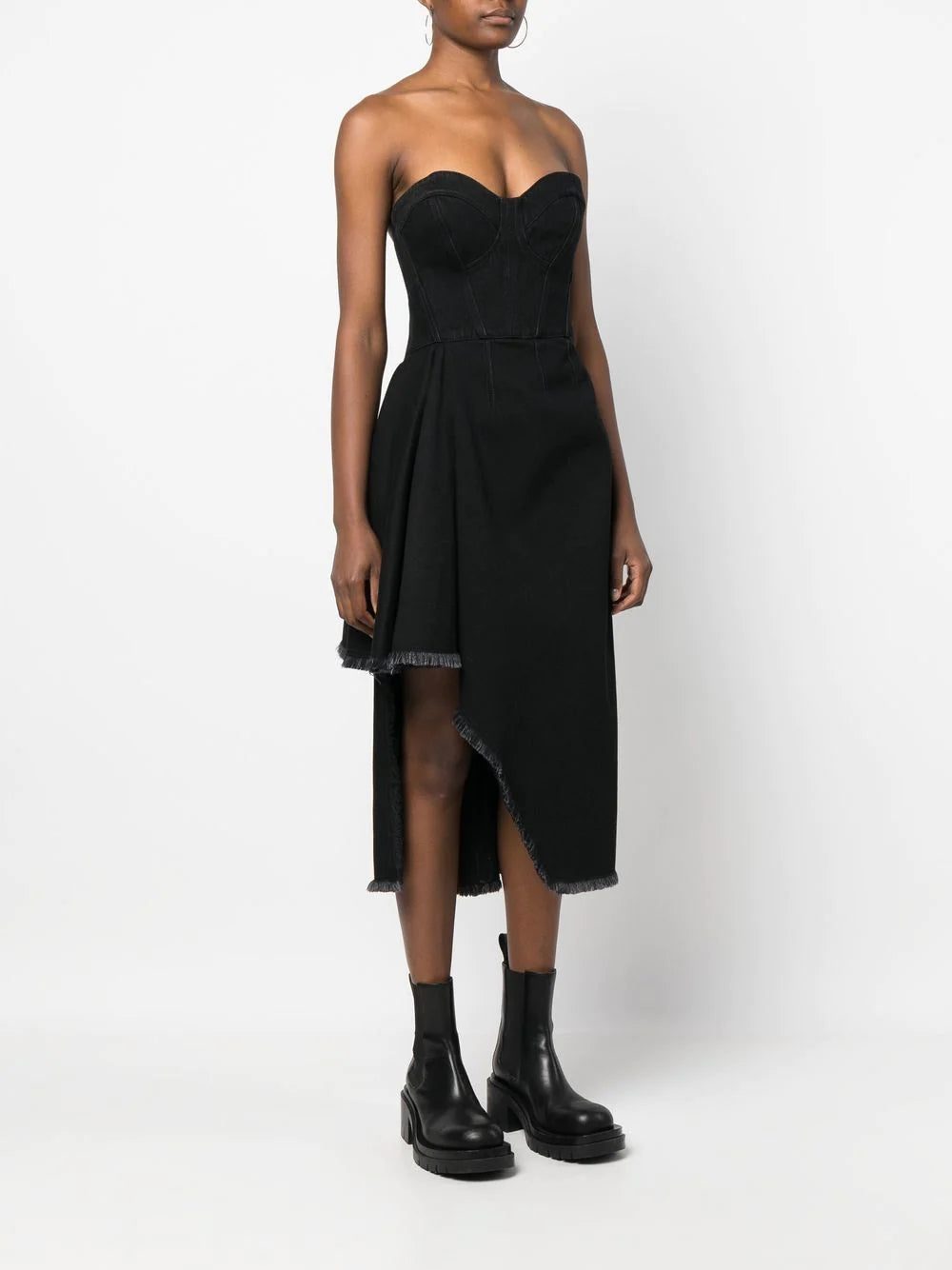 asymmetric denim dress from Alexander McQueen featuring black, cotton, sweetheart neck, strapless, corset style, rear zip fastening, flared skirt, asymmetric hem and frayed edge.