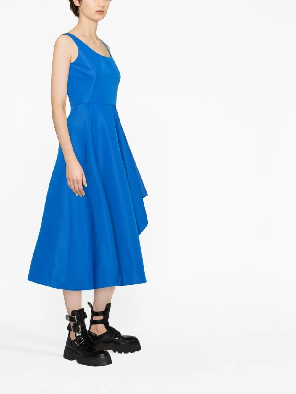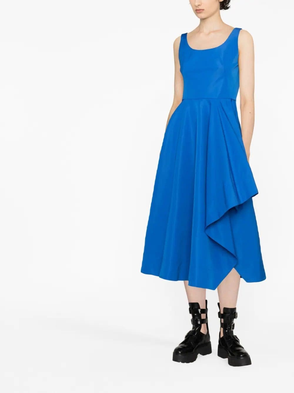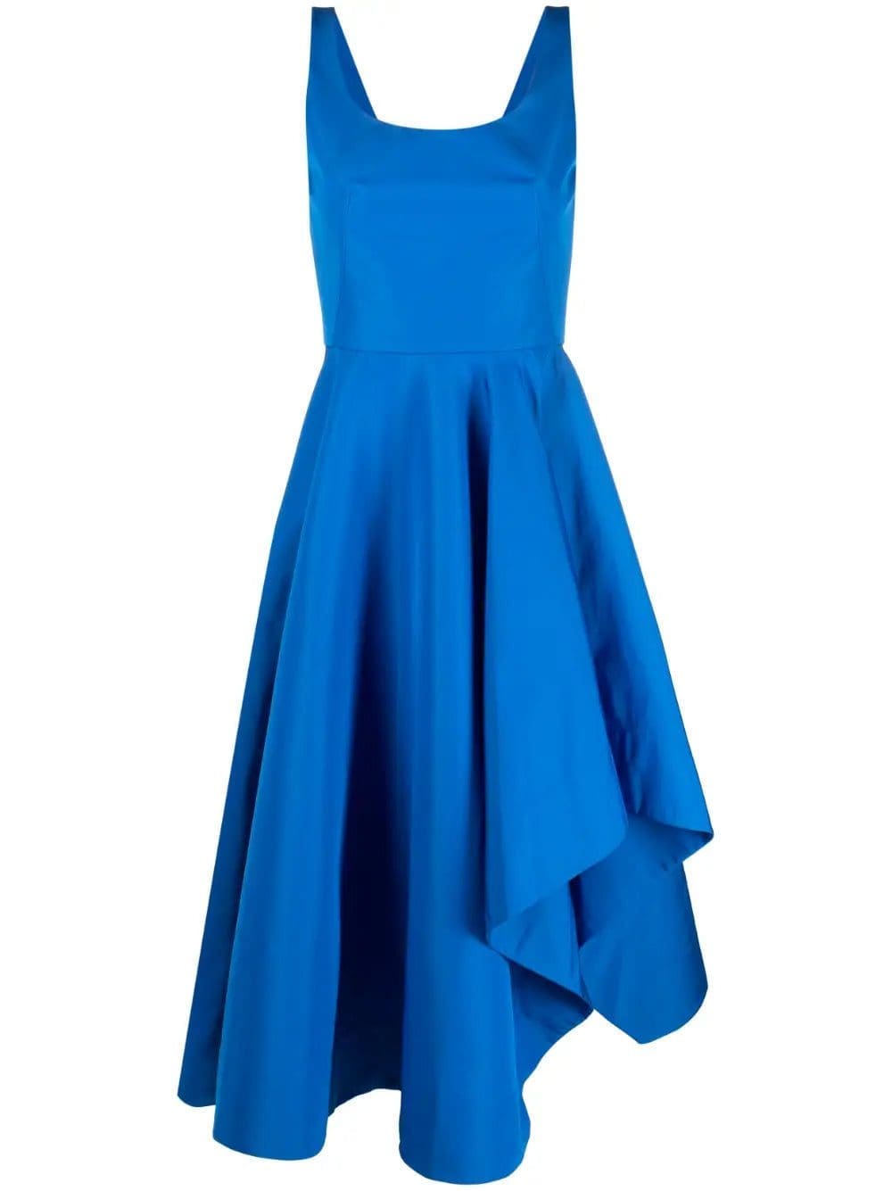 In a bright navy blue hue, this Alexander McQueen dress showcases a romantic, asymmetric shape that has become a signature of the House. Designed with a darted bodice, it falls to a voluminous draped skirt.