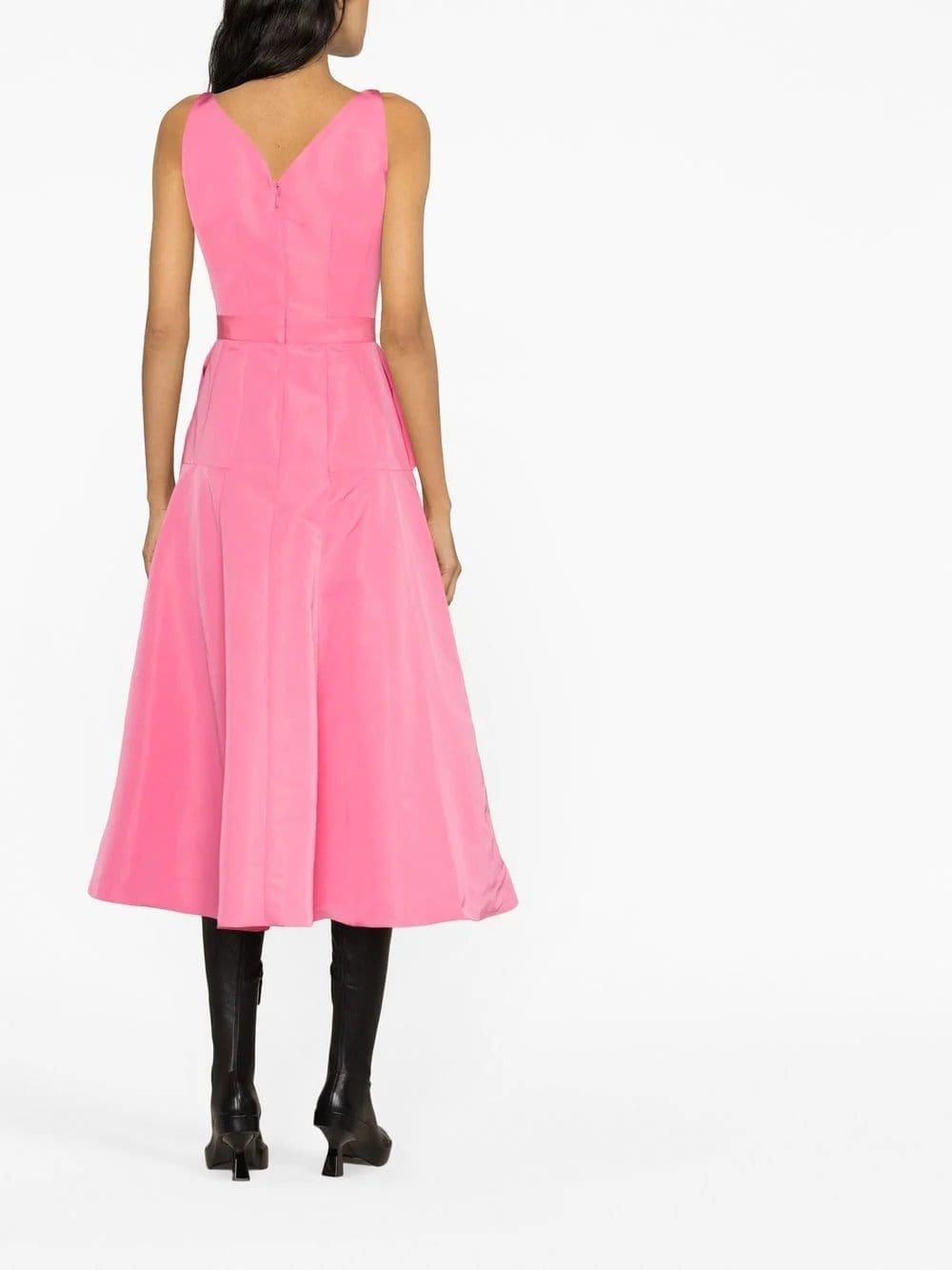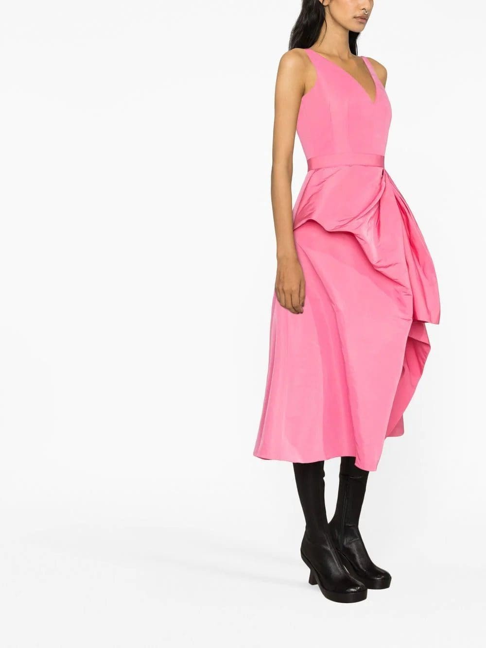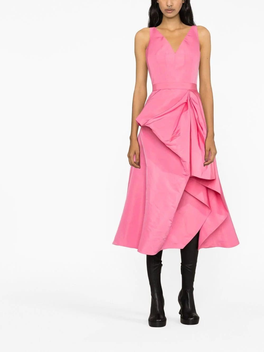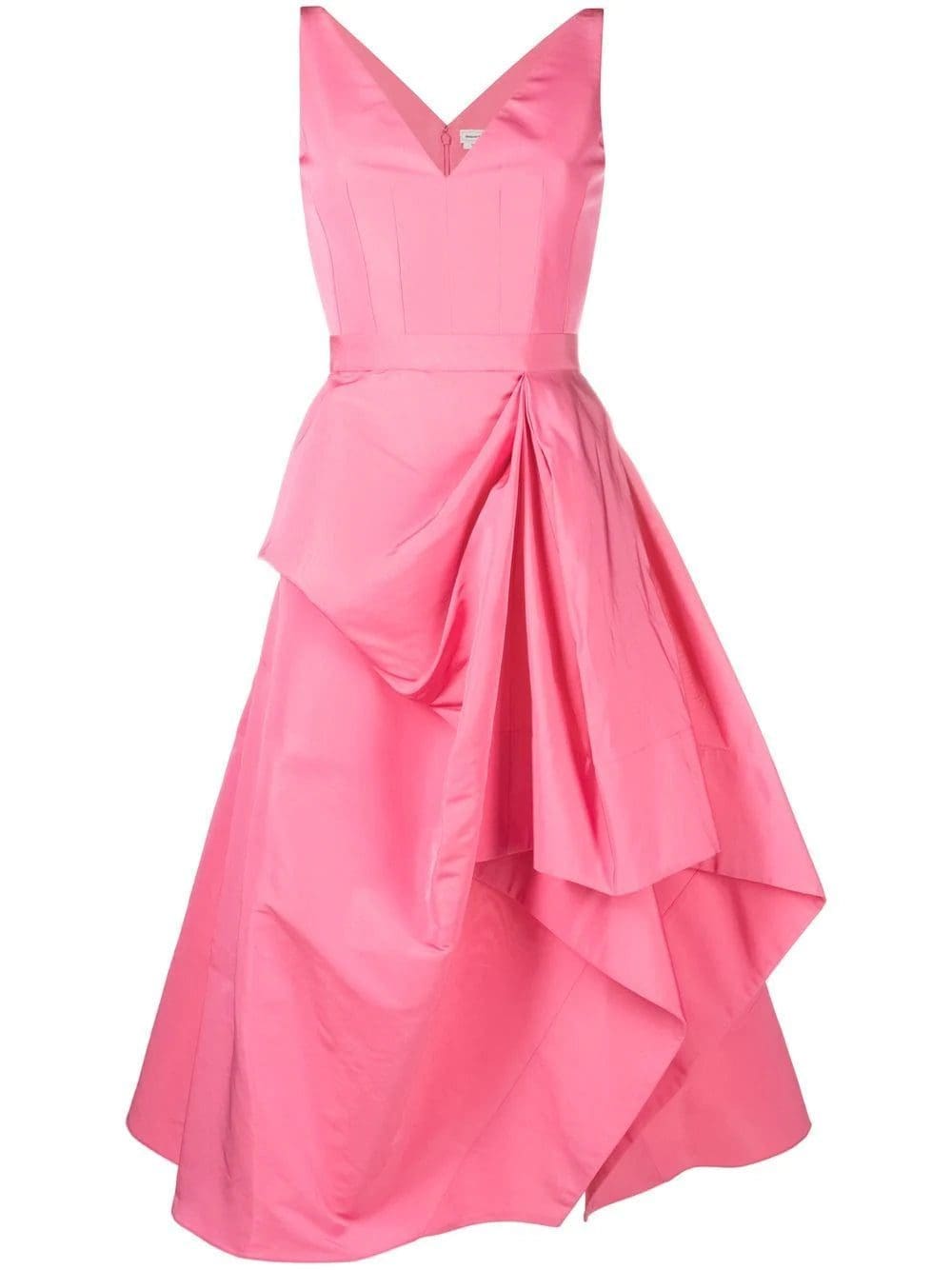 This midi dress by Alexander McQueen showcases the brand's signature draped detailing. It's imagined in bright pink and features off-centre gathering at the hip that falls to a tulip-like flared skirt.