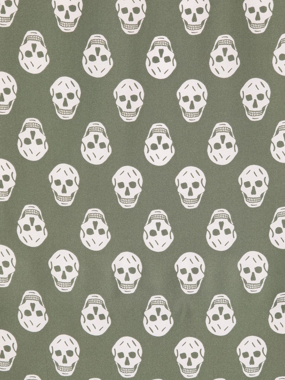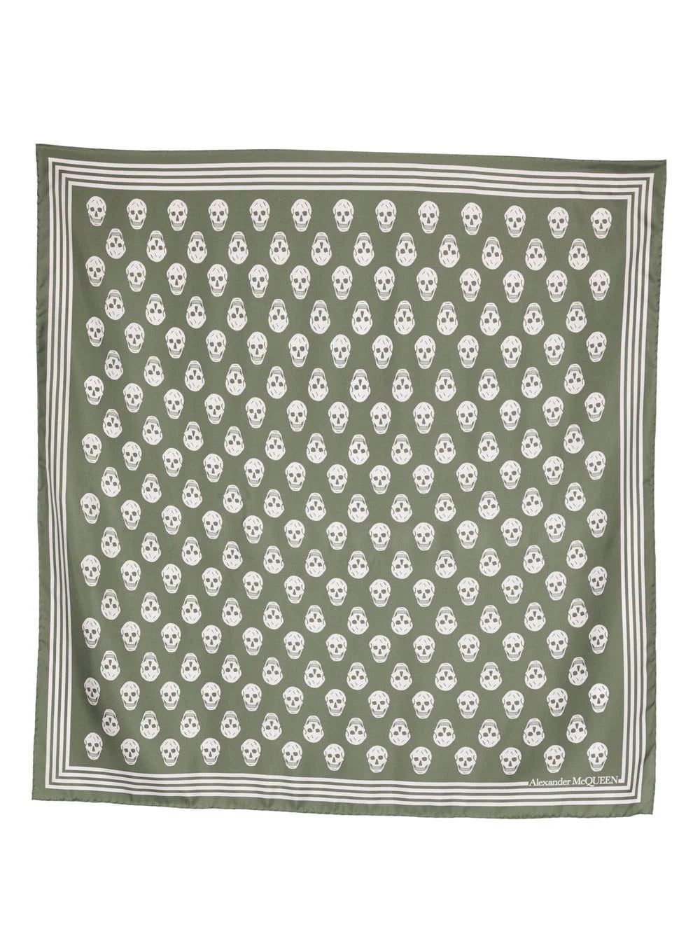 Biker silk scarf from Alexander McQueen featuring sage green, white, silk, skull print, logo print to the front and finished edge.