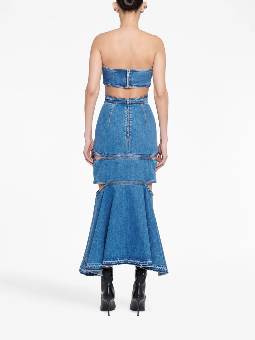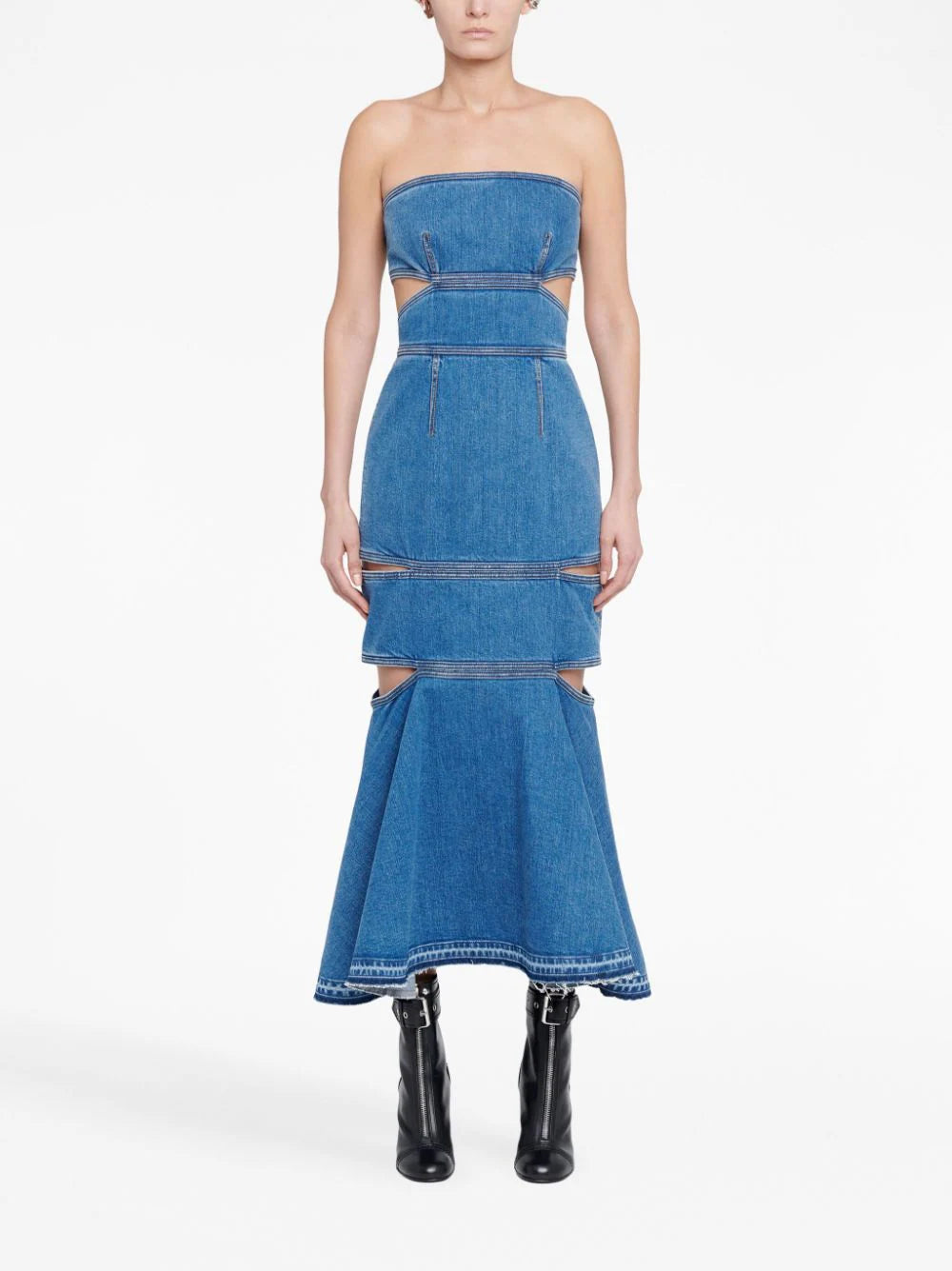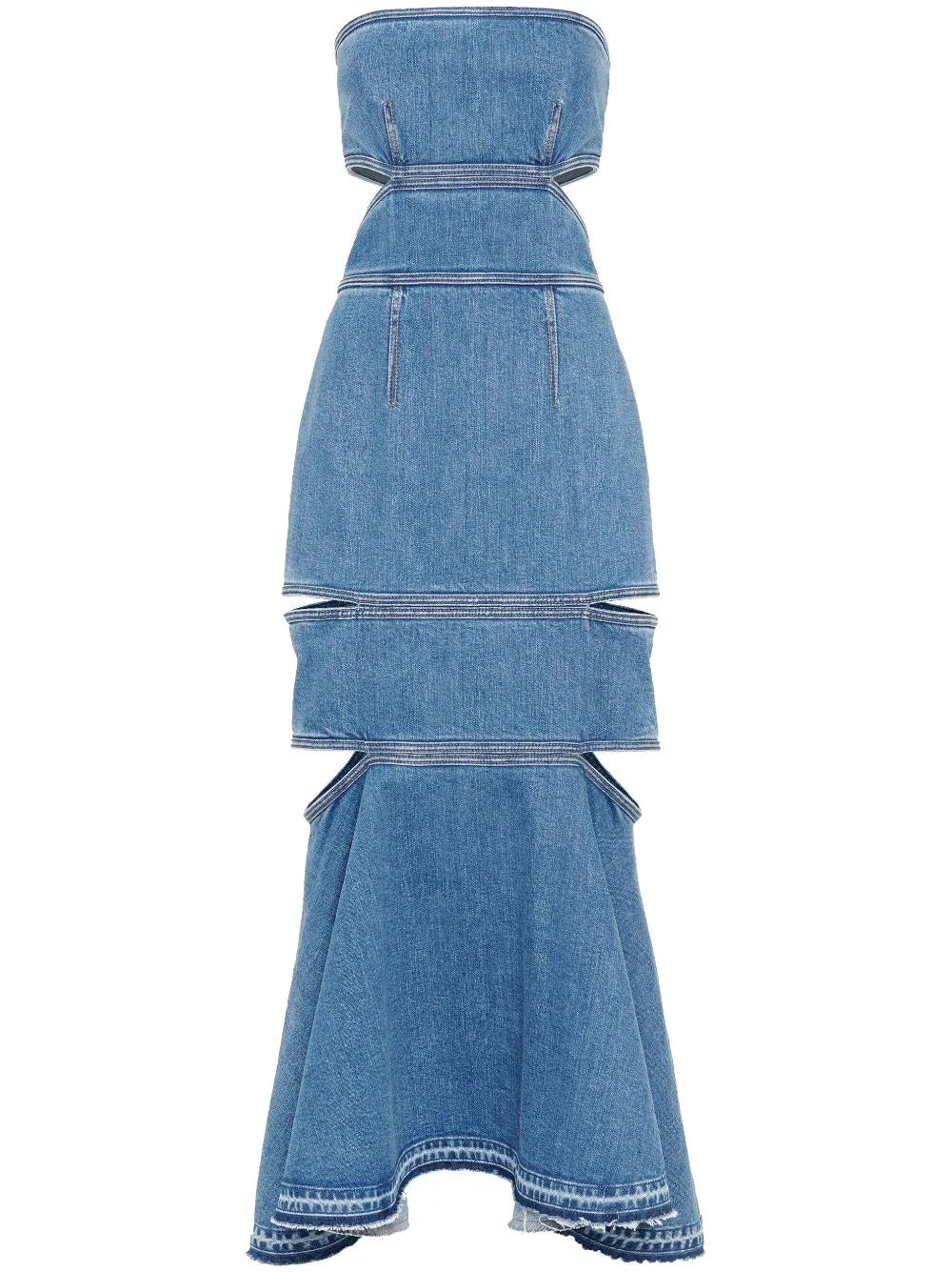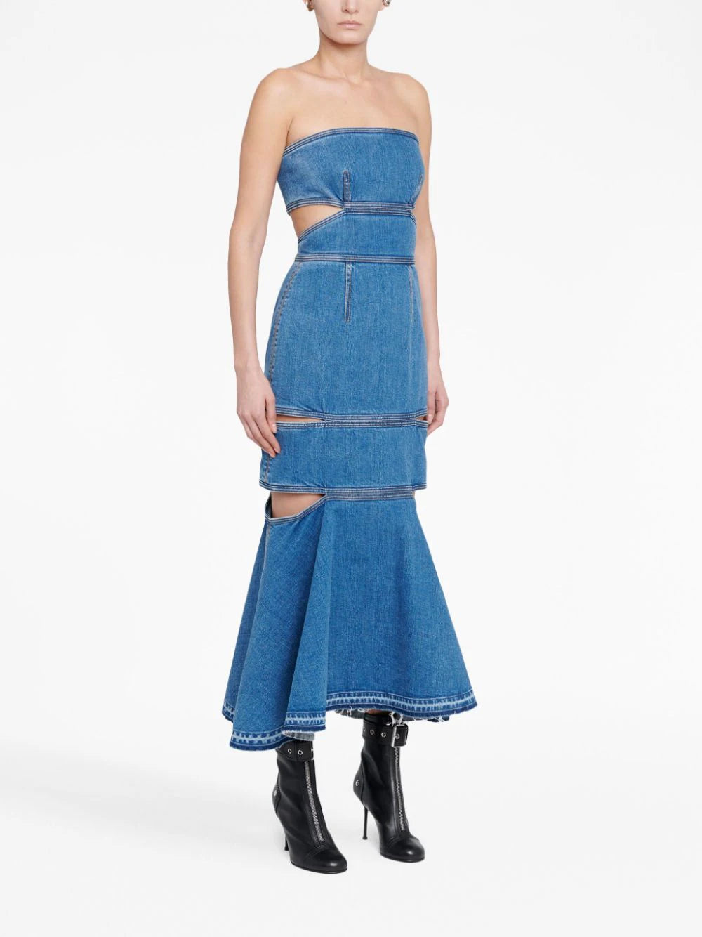 Alexander McQueen’s midi dress is slashed with daring cut-outs across the back and sides that reveal touches of skin. Presented in blue stonewashed denim, it features a close-fitting design that is finished with a voluminous peplum hem.