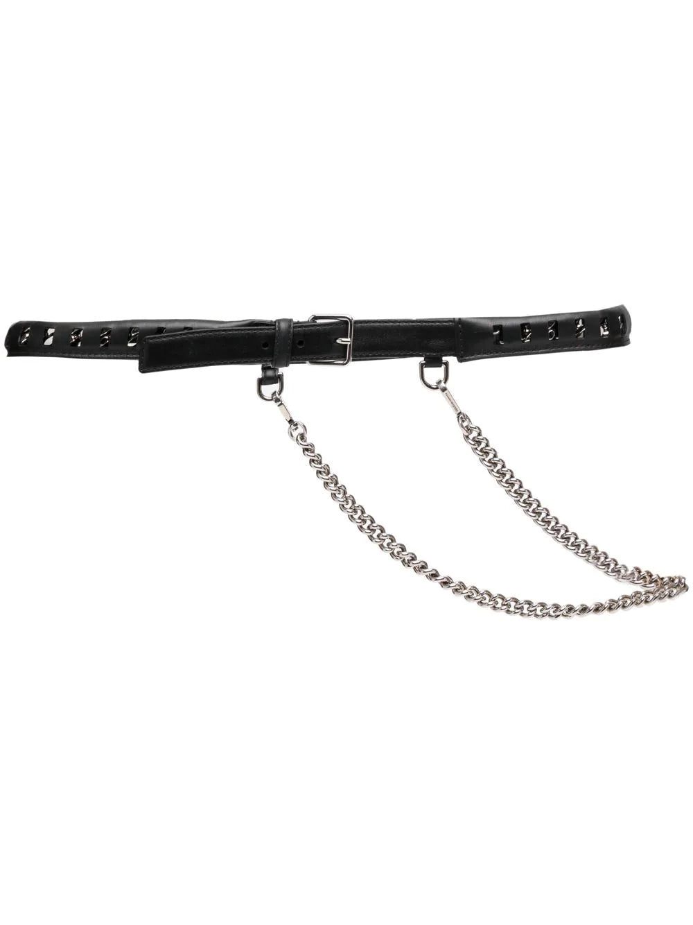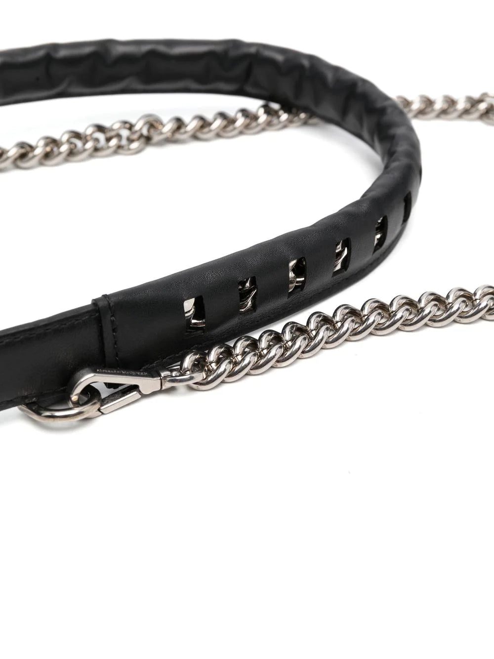 chain-link & leather belt from Alexander McQueen featuring black, calf leather, chain-link detailing, cut-out detailing, silver-tone hardware, buckle fastening and adjustable fit.