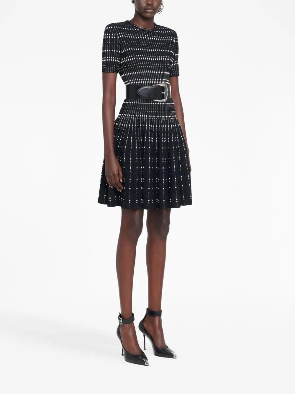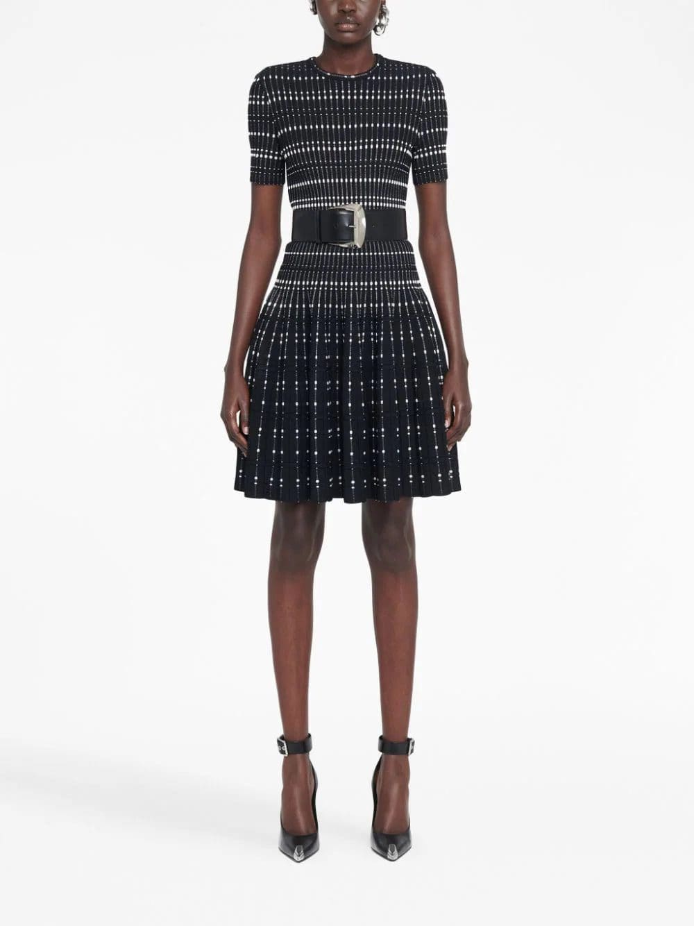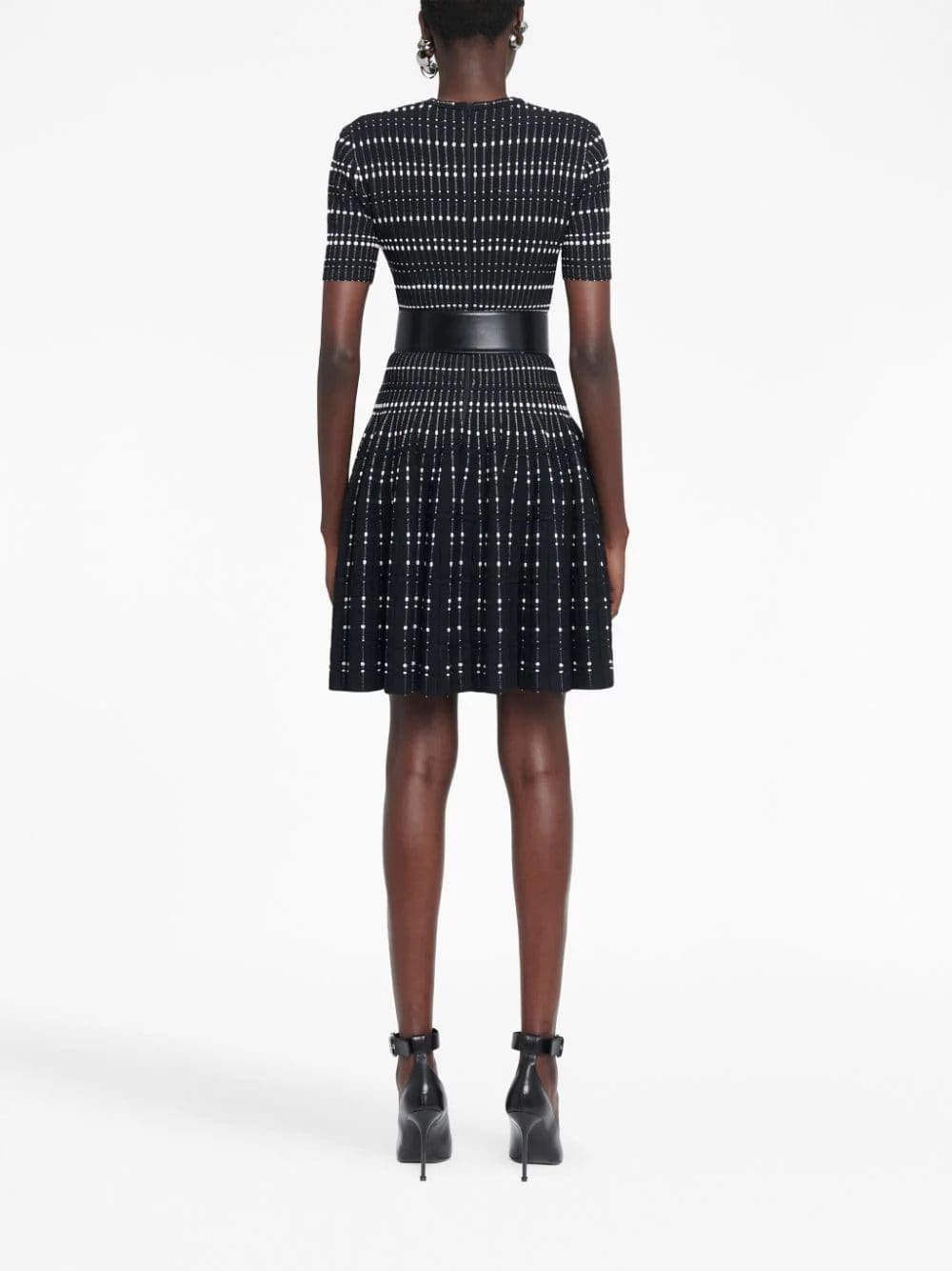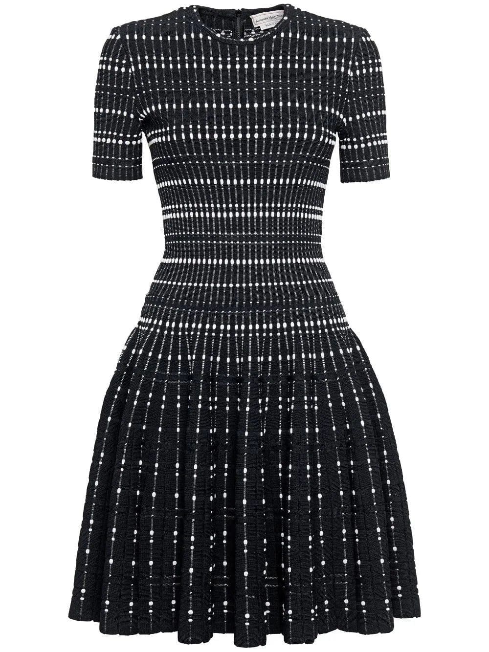 Alexander McQueen's impeccable use of tailoring is paired with signature gothic influences on this minidress. Imagined in a black and white colourway, the garment is detailed with a contrasting thread inlay.