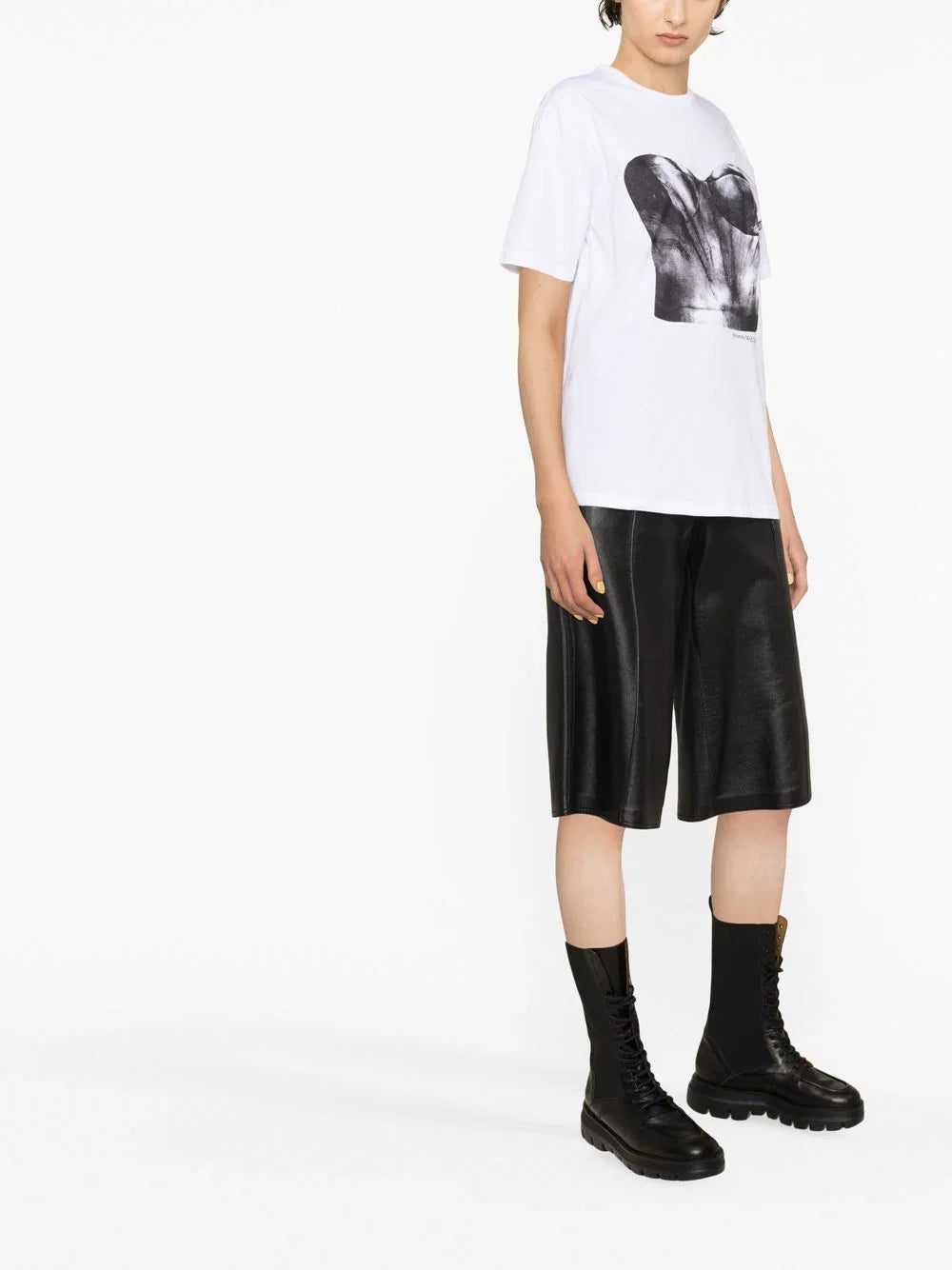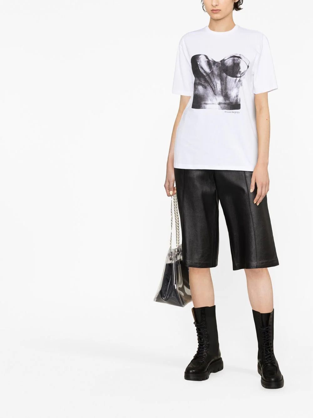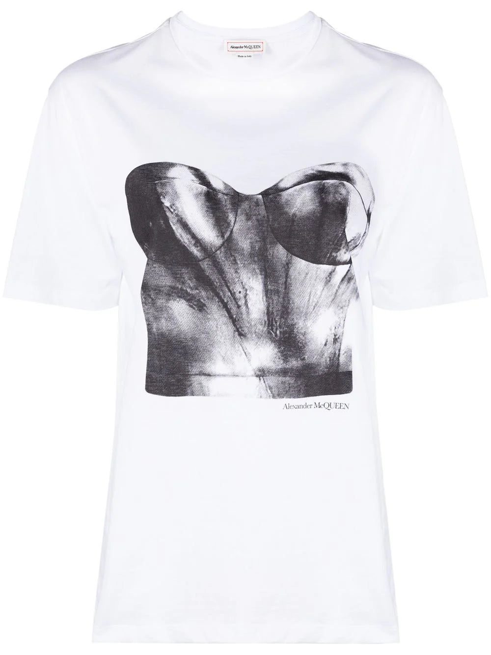 This T-shirt from Alexander McQueen nods to the label’s archival inspiration. Crafted from white cotton jersey, it’s printed with a photographic print of a classic corset.