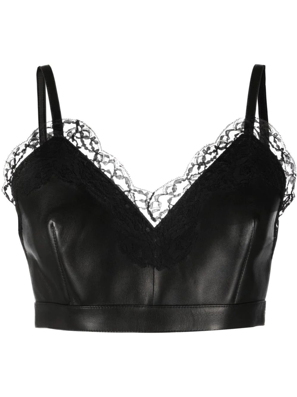 Alexander McQueen's cropped top offers a contemporary take on classic camisoles. Crafted from smooth black leather, it's trimmed with wispy lace at the V-neckline.
