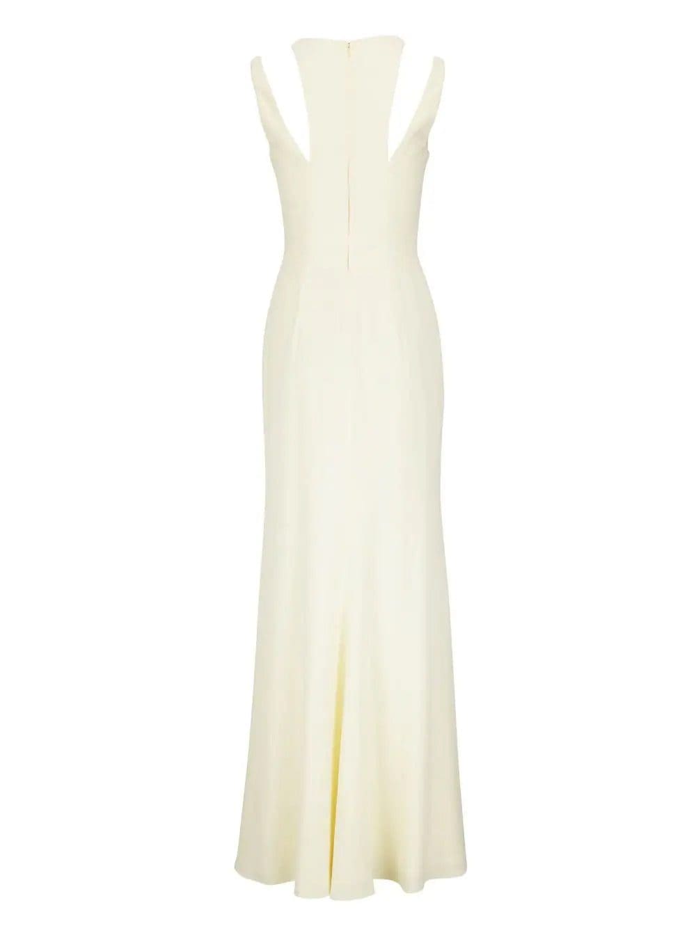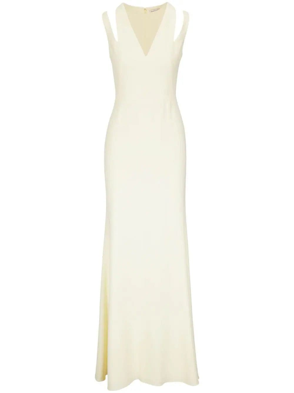 cut-out sleeveless gown from Alexander McQueen featuring cream white, cut-out detailing, V-neck, concealed rear zip fastening, sleeveless, fluted skirt and floor-length.