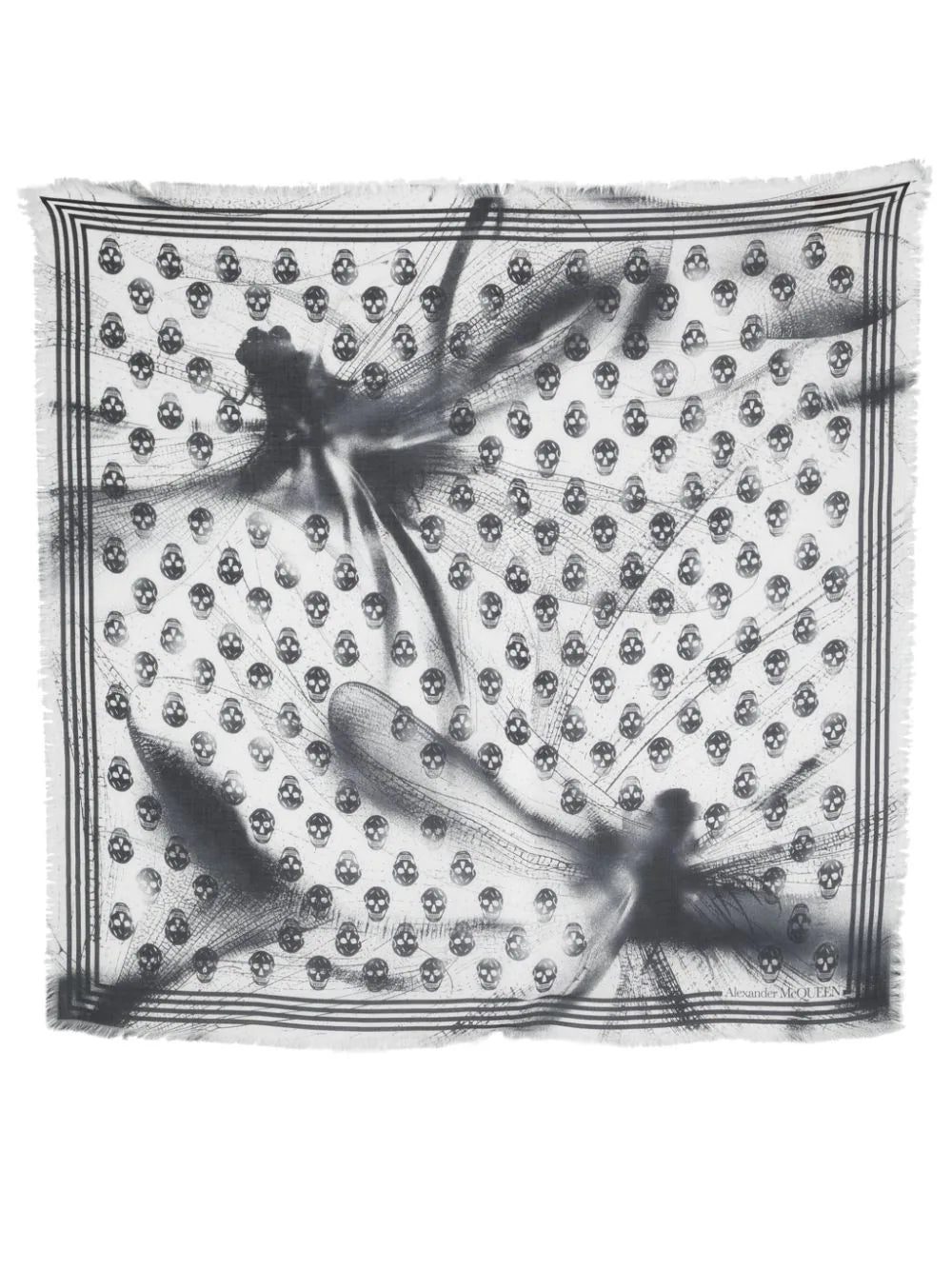 British label Alexander McQueen offers a romantic take on dark and dramatic themes - this modal scarf features an all-over skull motif with a Dragonfly print on top. It’s finished with fringed edges and an Alexander McQueen logo at the corner.