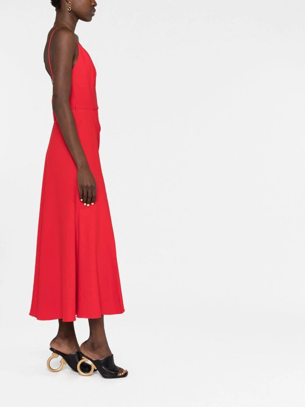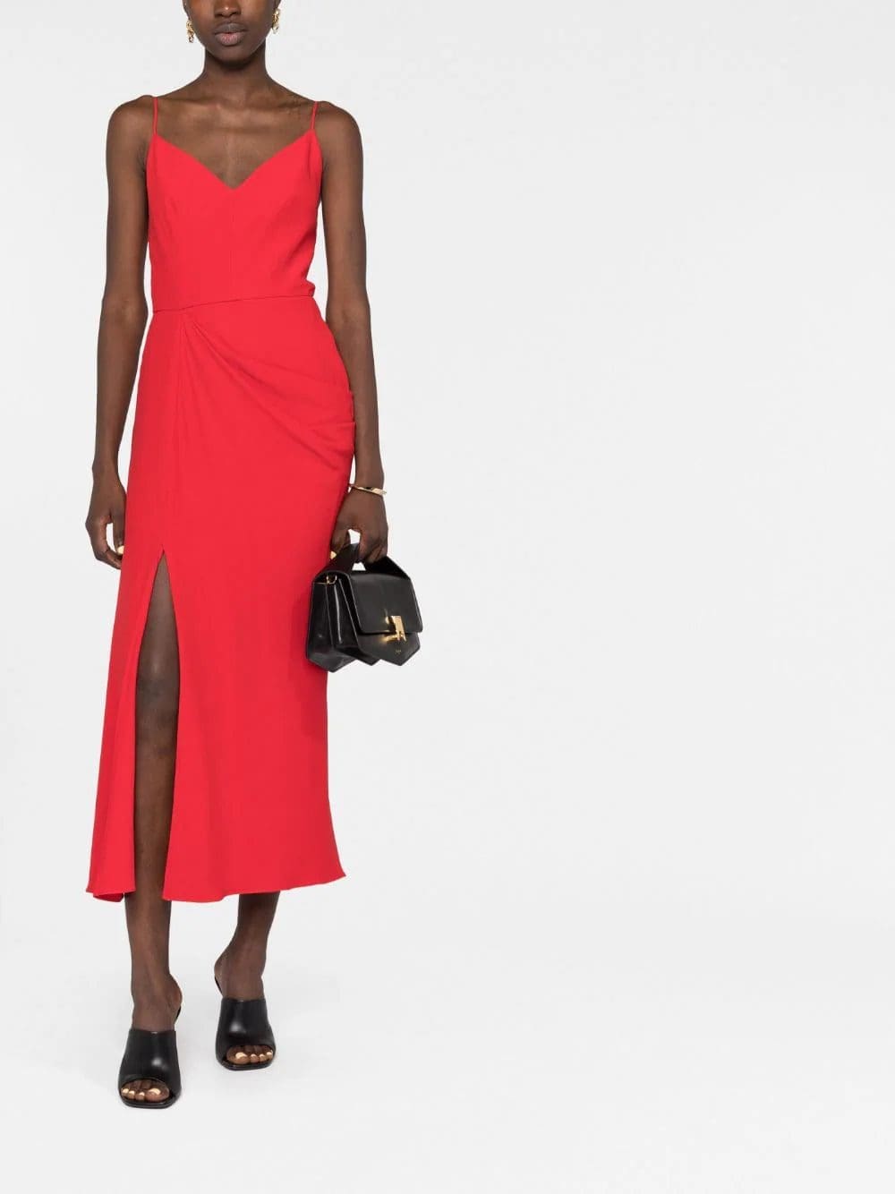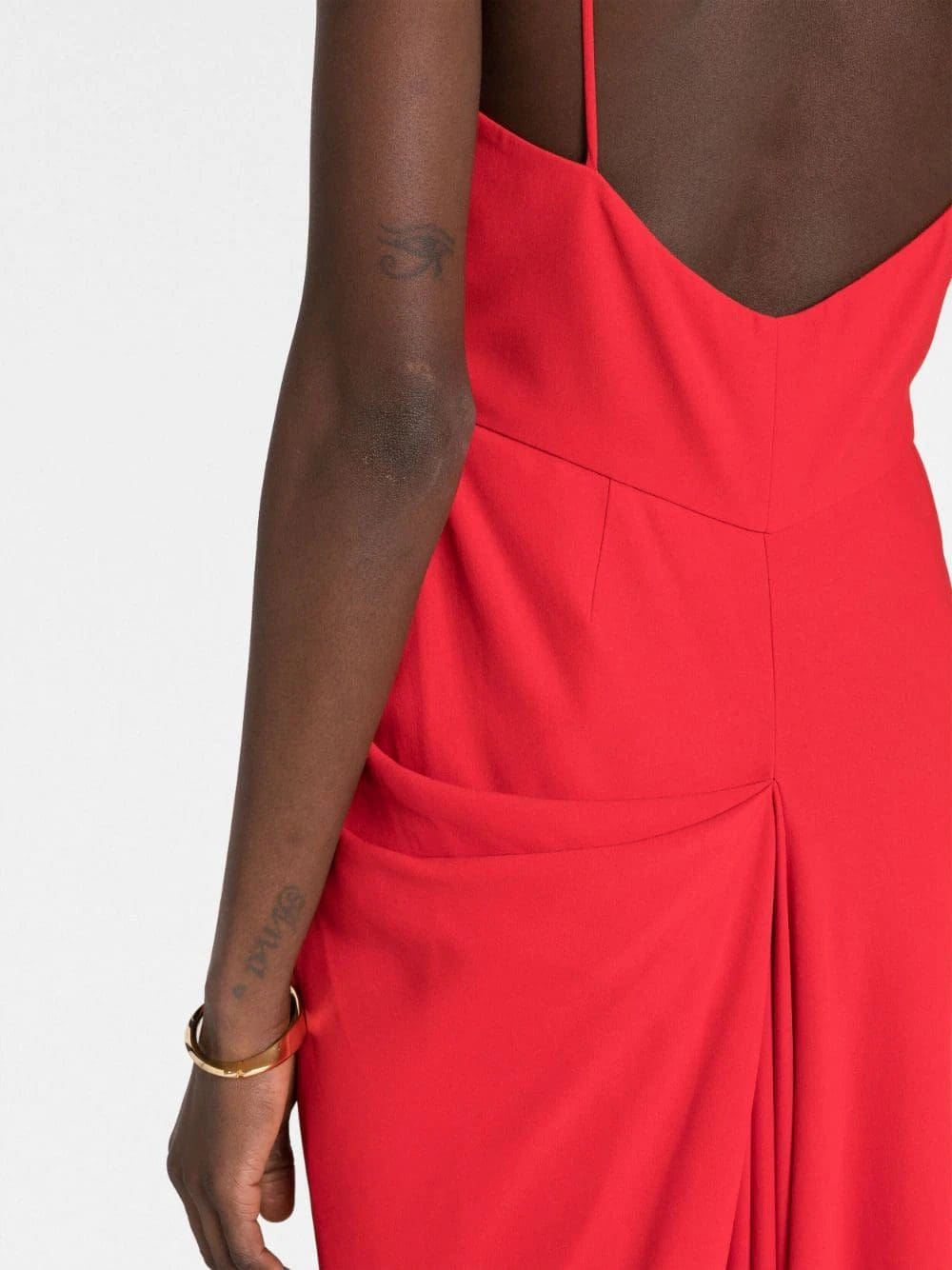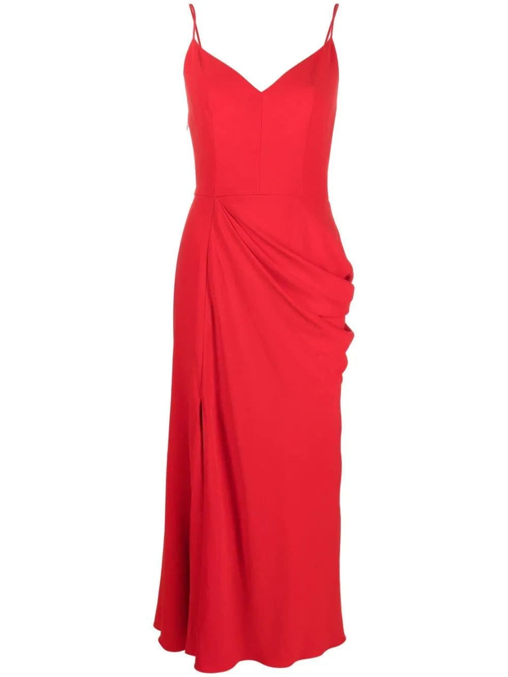 The simple silhouette of this mid-length dress is elevated by draped detailing that wraps around the body and hangs like a curtain. Paired with its vivid scarlet hue and a front, thigh-high slit, this dress is understated yet alluring.