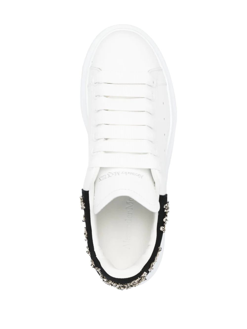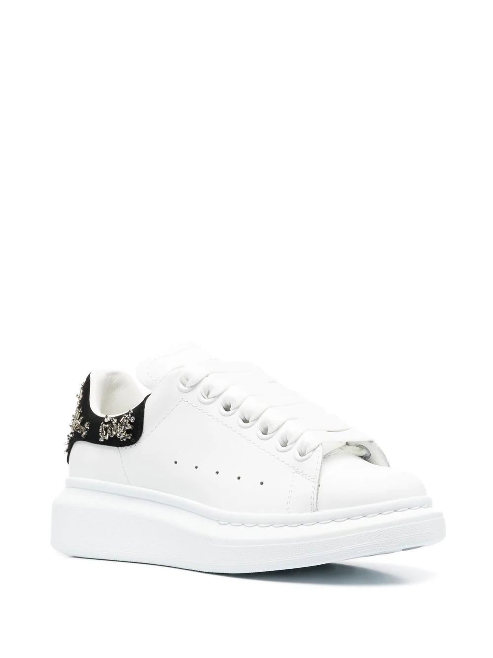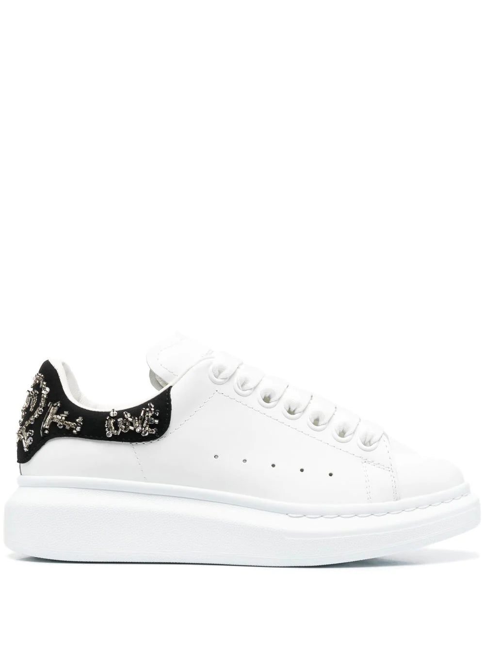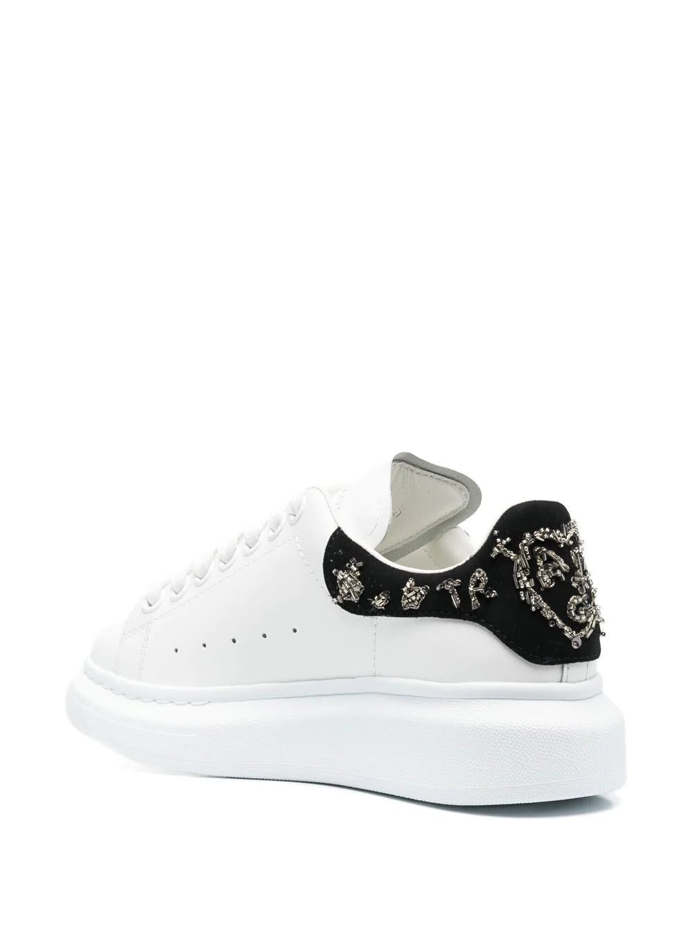 embellished low-top sneakers from Alexander McQueen featuring black/white, calf leather, bead detailing, logo-debossed tongue, round toe, front lace-up fastening, branded leather insole and rubber outsole.