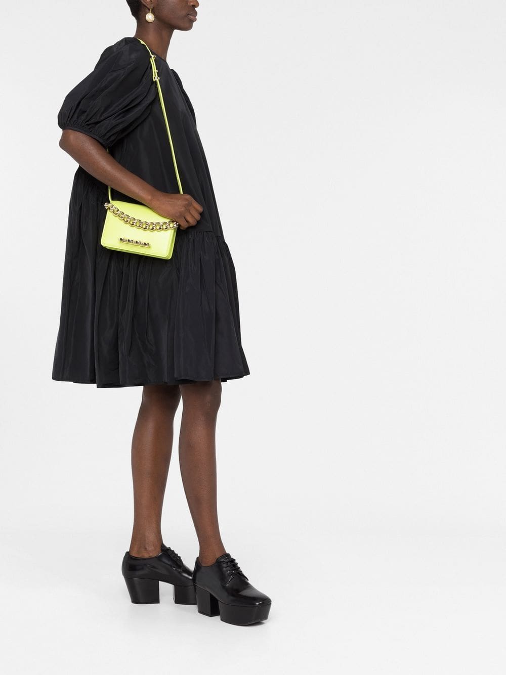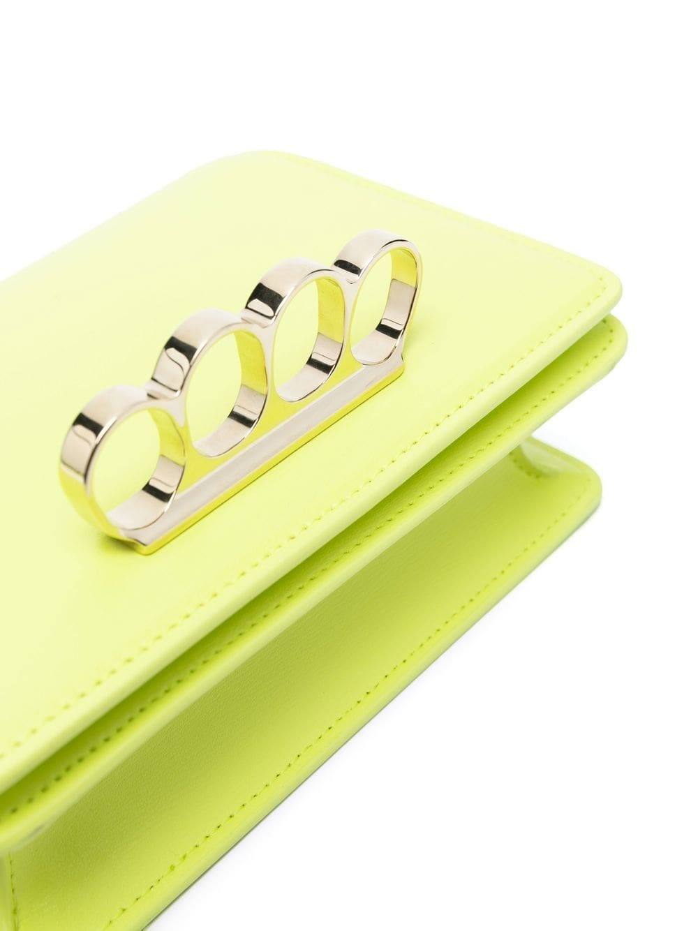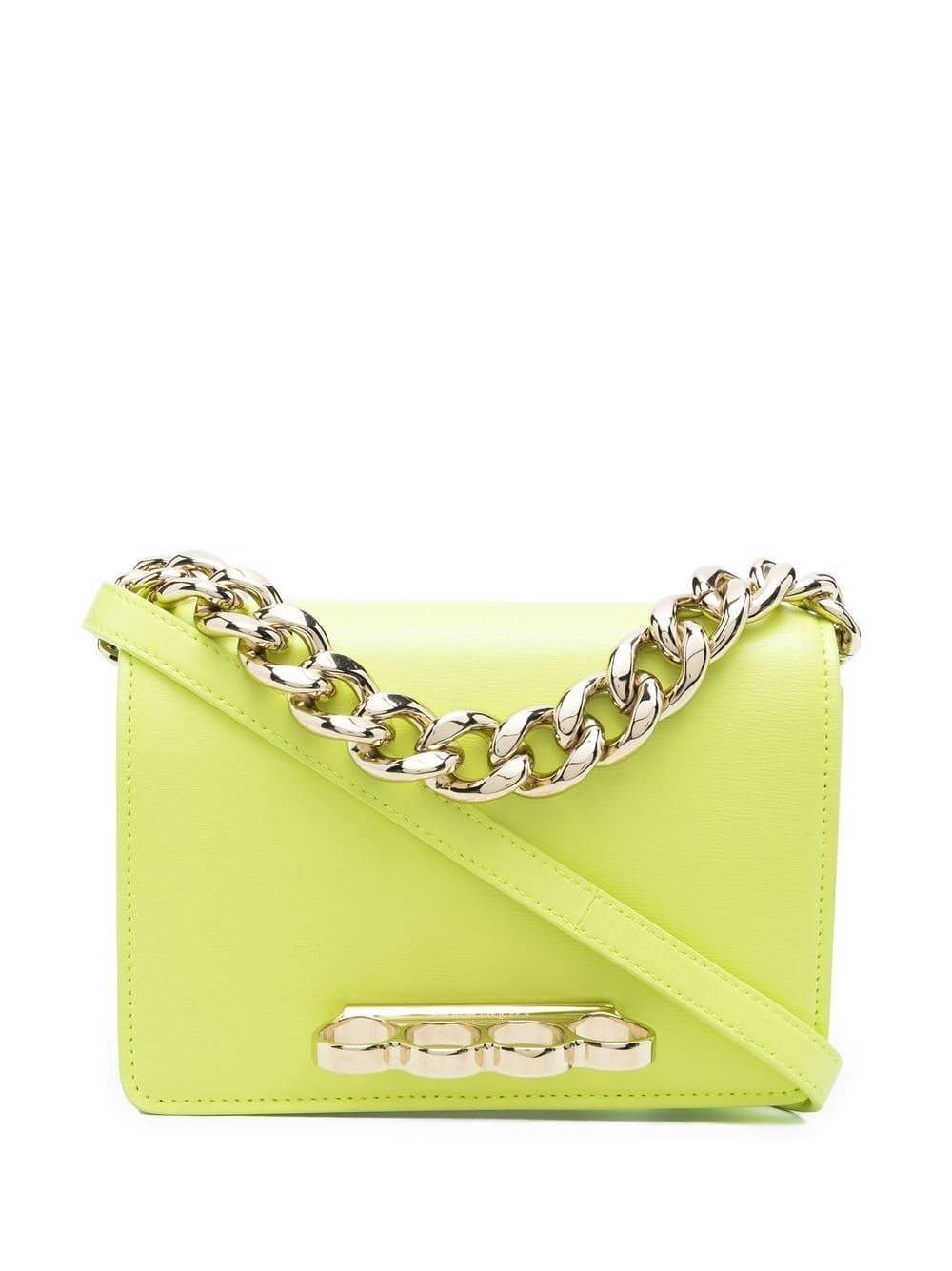 Alexander McQueen's rebellious nature is summed up in their Four Ring bag collection. Crafted from buoyant yellow calf leather, this mini iteration combines the brand's signature Four Ring handle with chunky chain link detailing for a powerful finish.