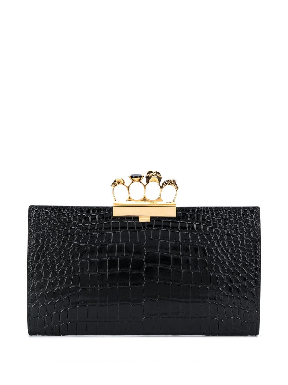 Carry your essentials in style with this black Four Ring clutch bag from Alexander McQueen. Complete with an iconic skull embellishment and an embossed finish, this one's a staple party accessory. In true McQueen style.