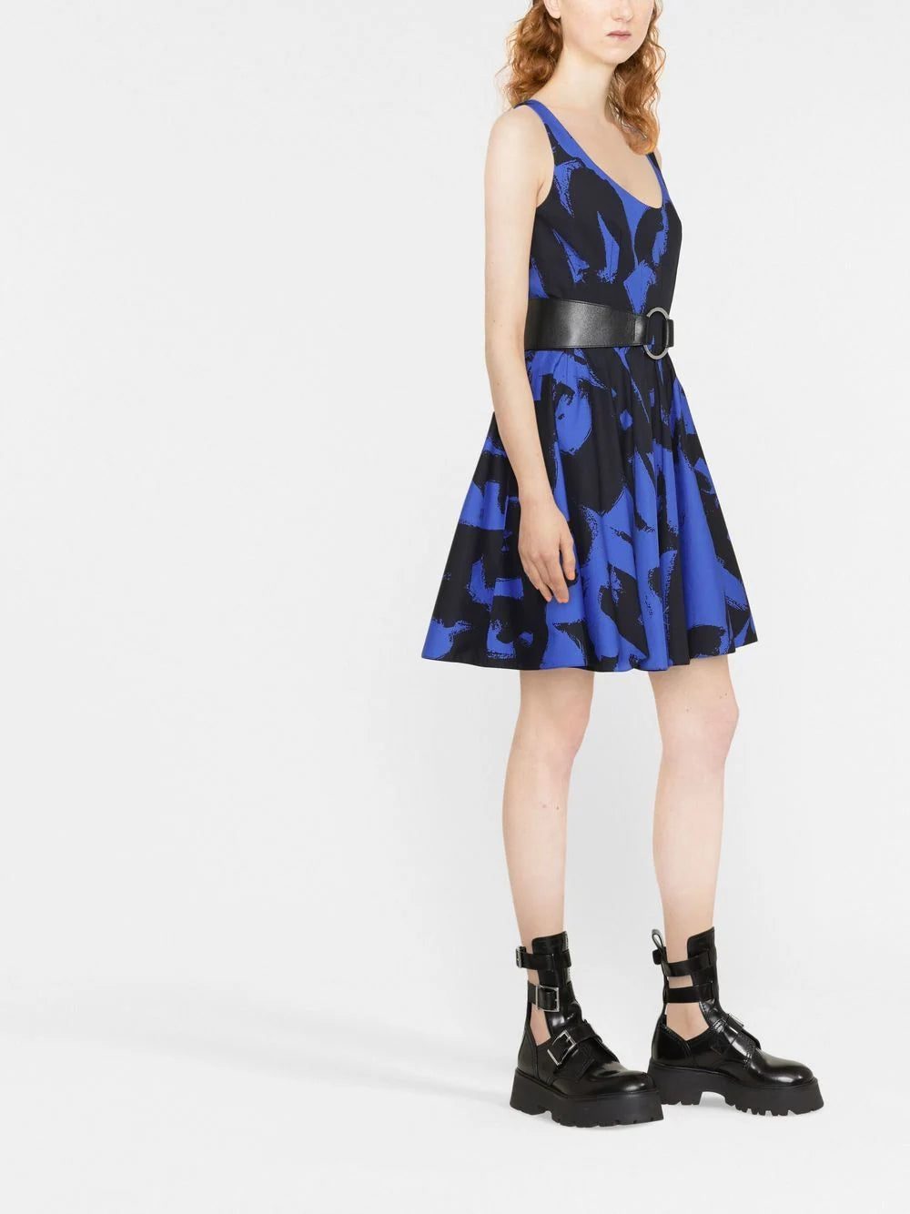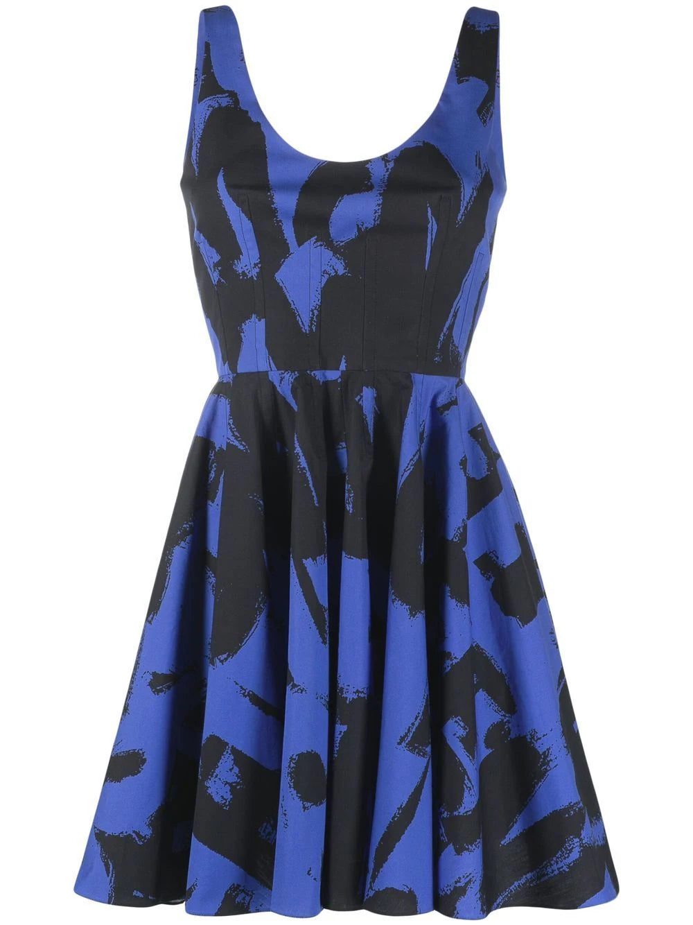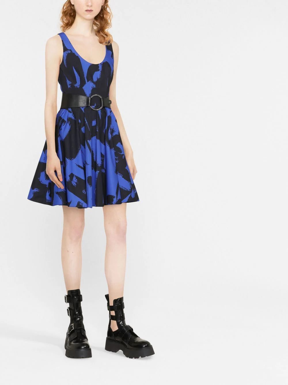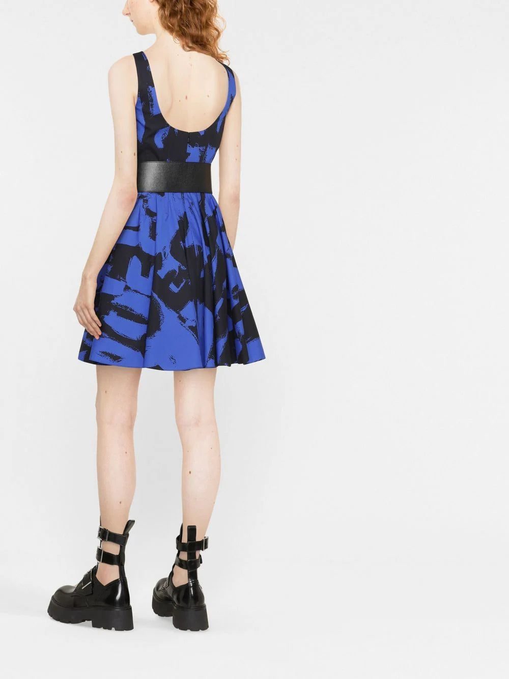 Showcasing Alexander McQueen's gritty edgy, this dress features bold logo lettering in a graffiti-inspired font. The black and blue colourway and flared silhouette further contribute to this punky look.