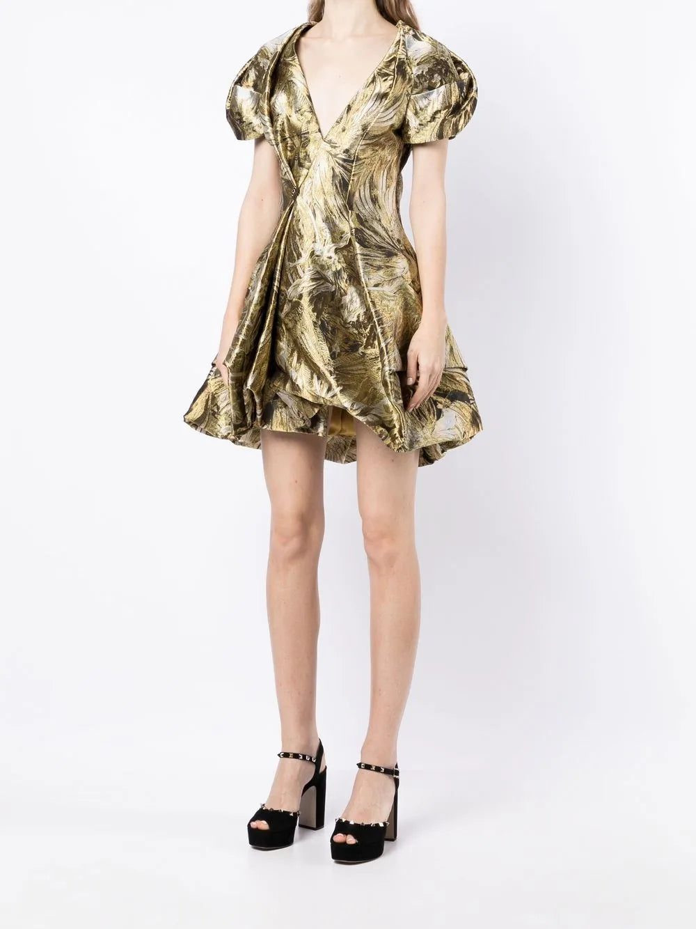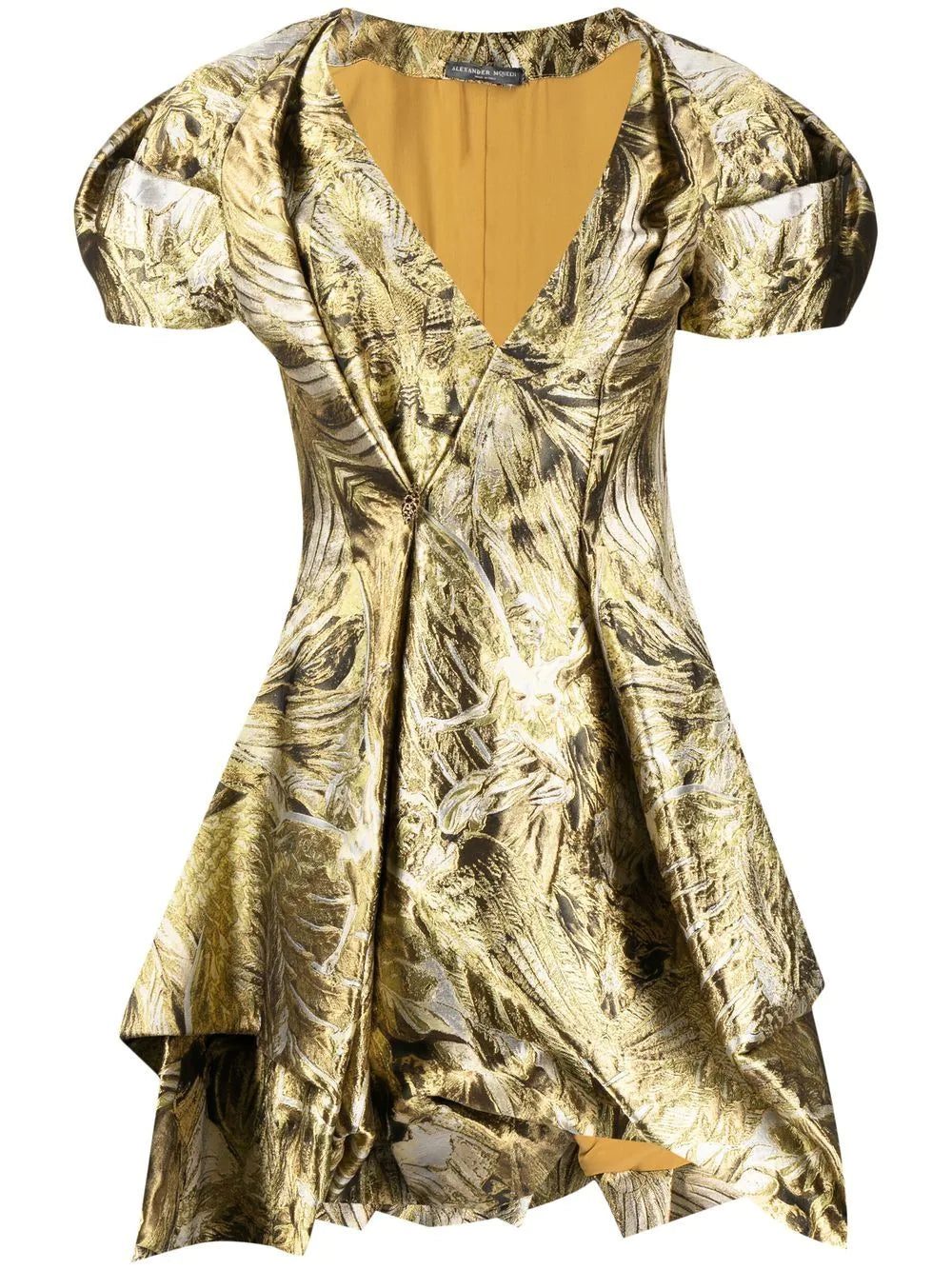 Speaking to its signature 'gothic glamour' aesthetic, Alexander McQueen presents this mini dress. Designed in a gold-tone hue, this thigh-length piece is distinguished by the all-over jacquard pattern and the folded edges.