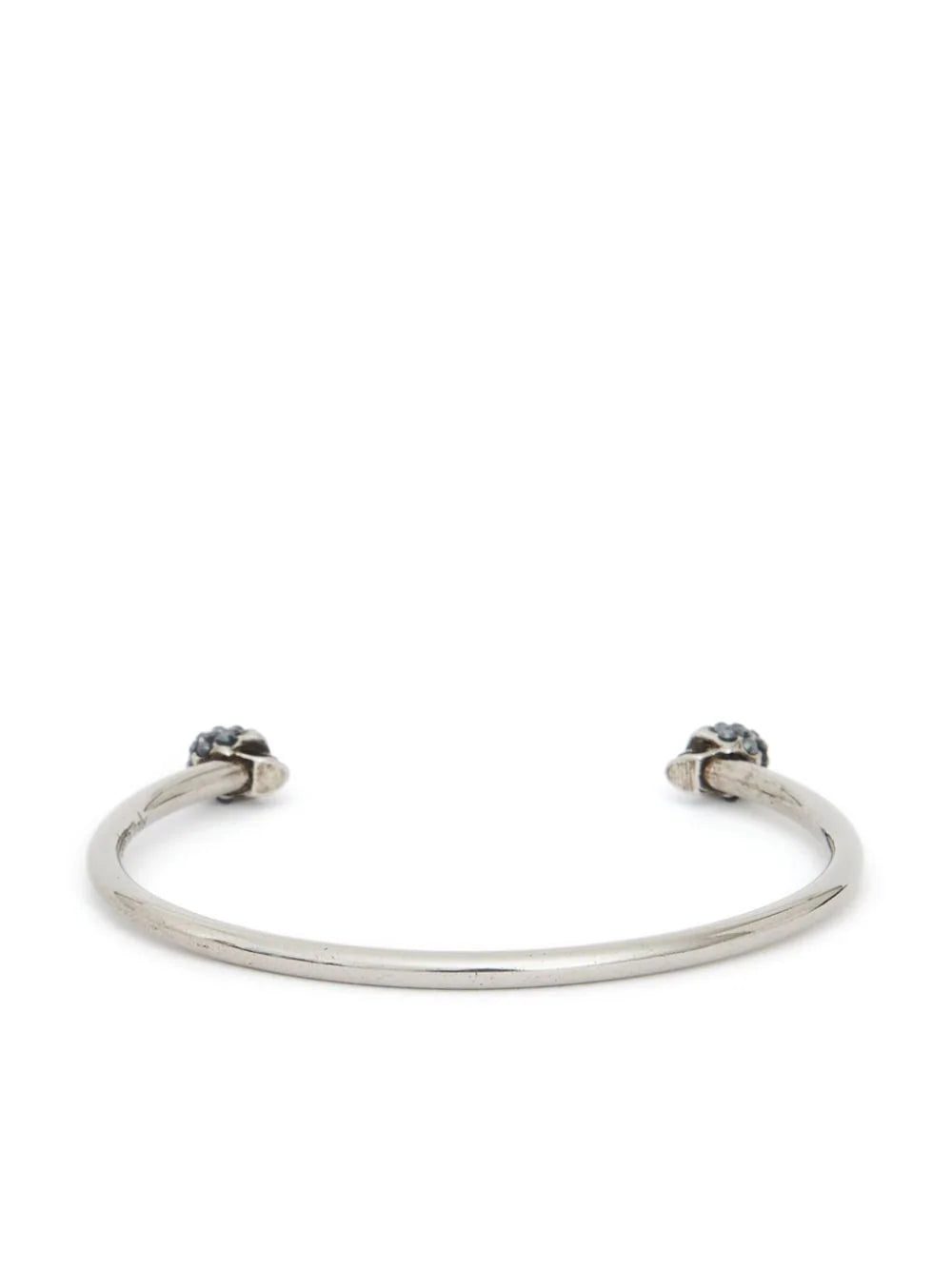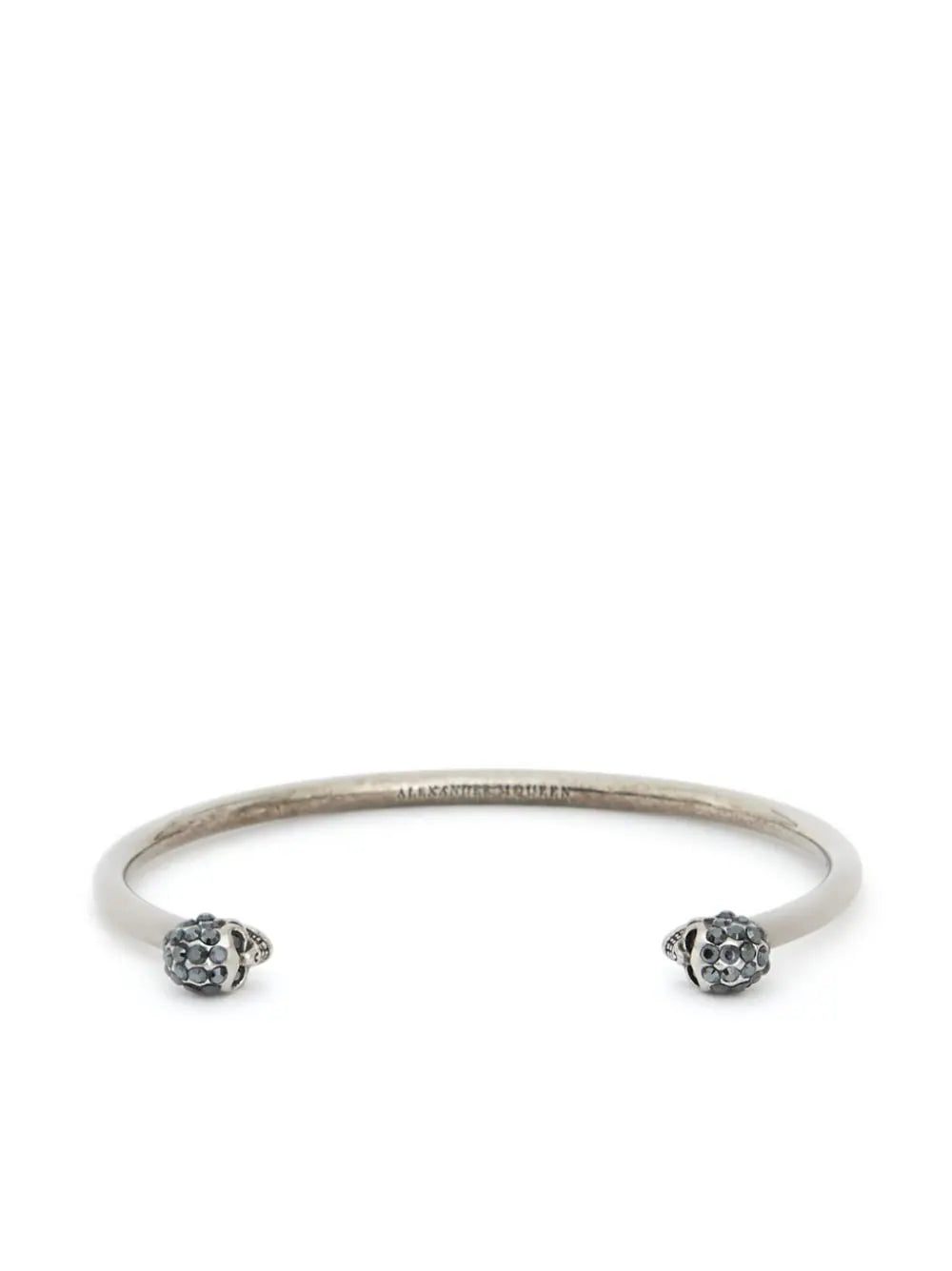 Alexander McQueen's signature skull trademark has been captivatingly revamped with this Jewelled Twin Skull bracelet. In silver-tone brass, this old glam-inspired bracelet features two Swarovski crystal embellished skulls and an engraved logo.