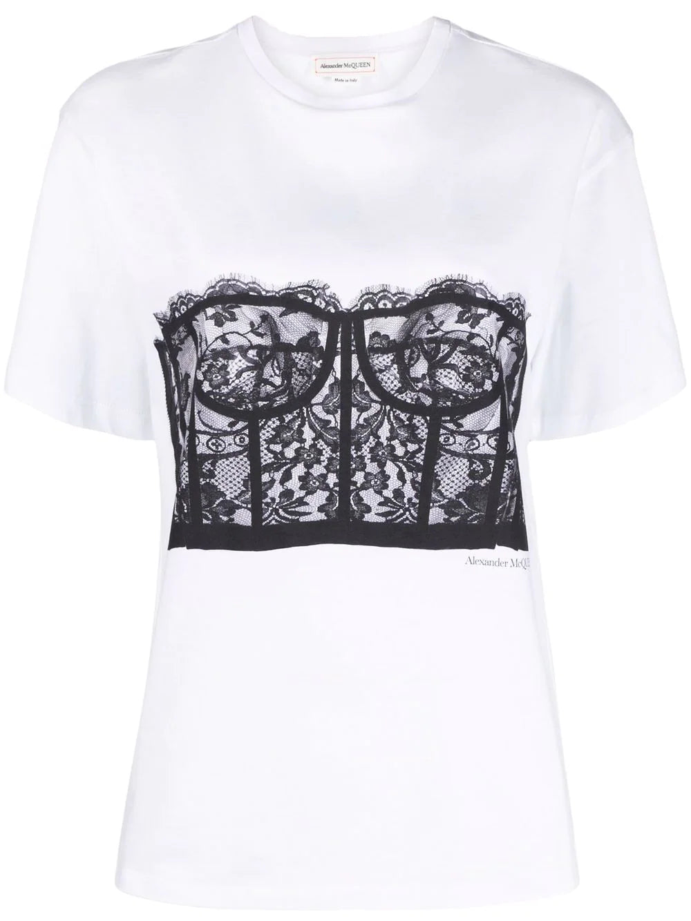 A lace corset print with an Alexander McQueen signature takes the focus of this short-sleeve T-shirt. The design is crafted from cotton in white colour.