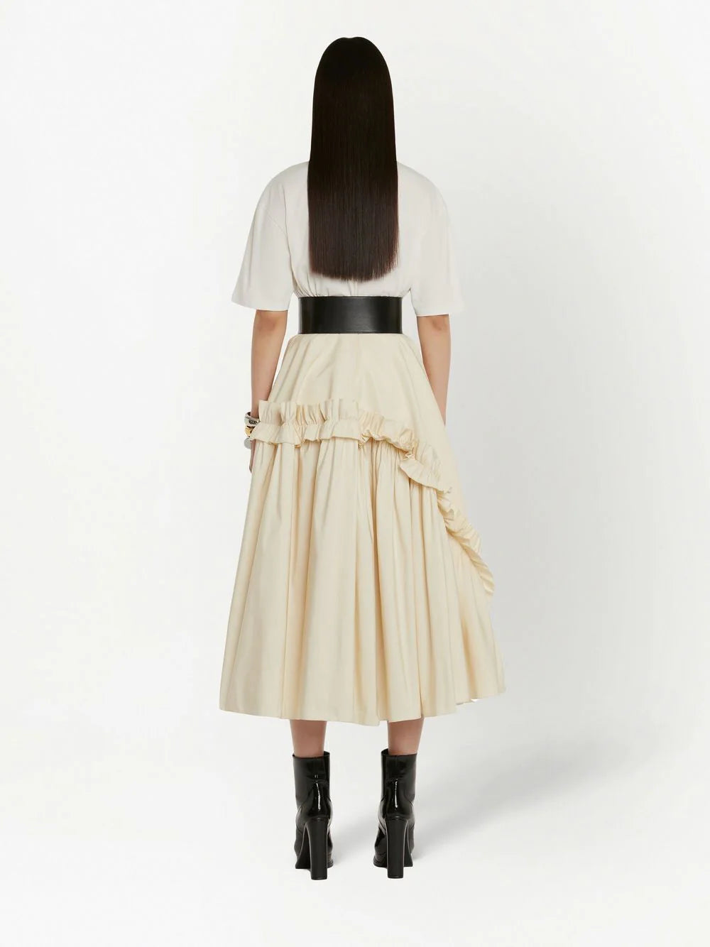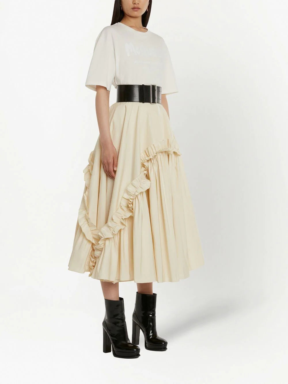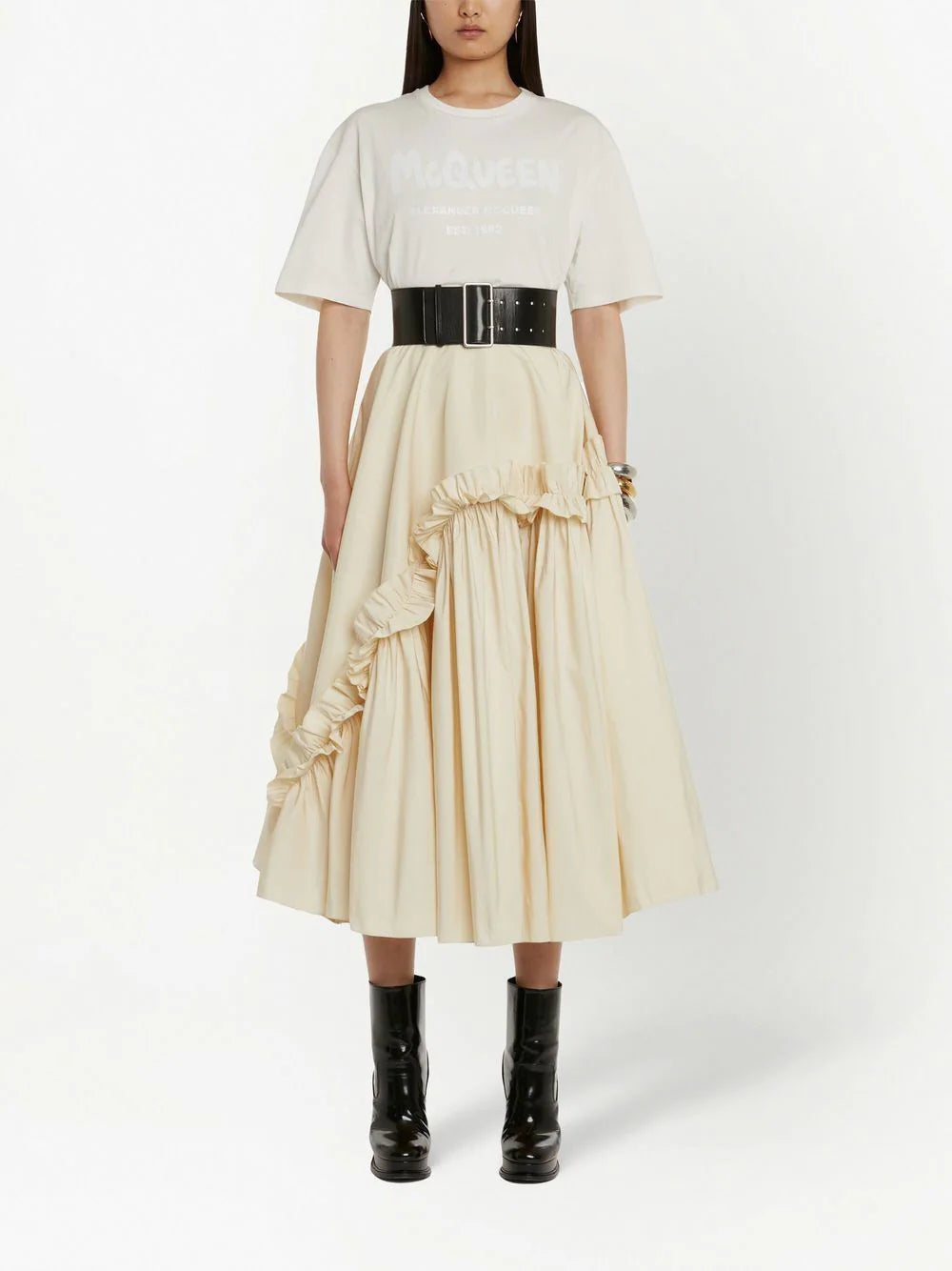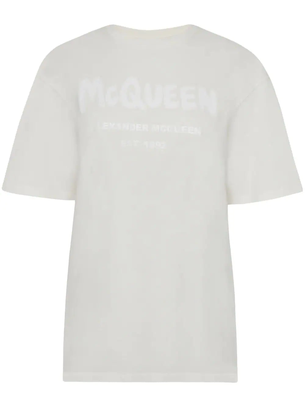 logo-print cotton T-shirt from Alexander McQueen featuring off-white, cotton, signature Graffiti print, logo print at the chest, crew neck, short sleeves and straight hem.