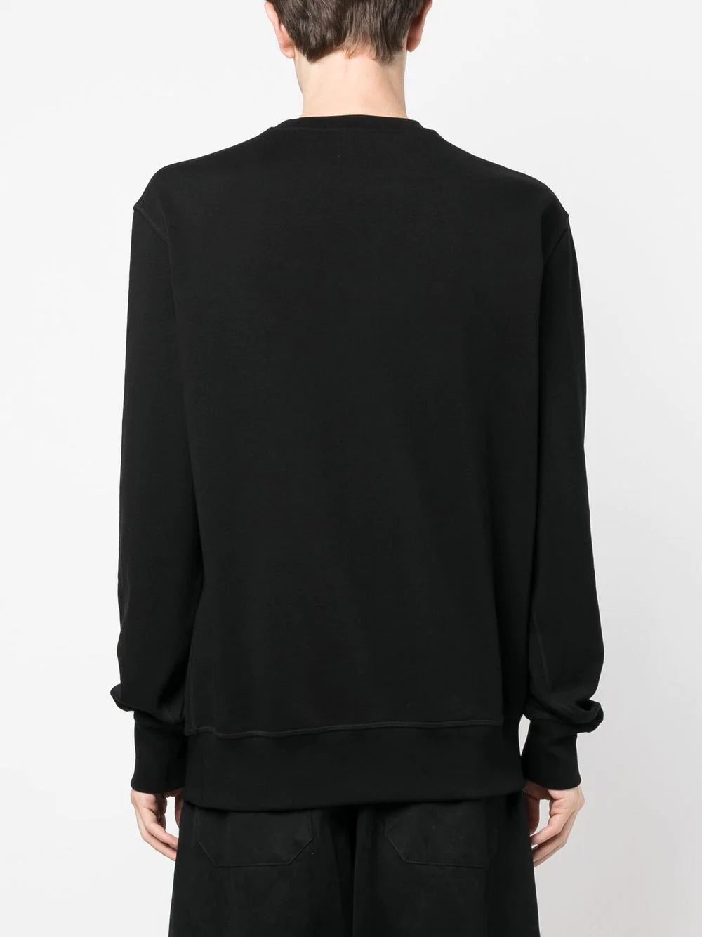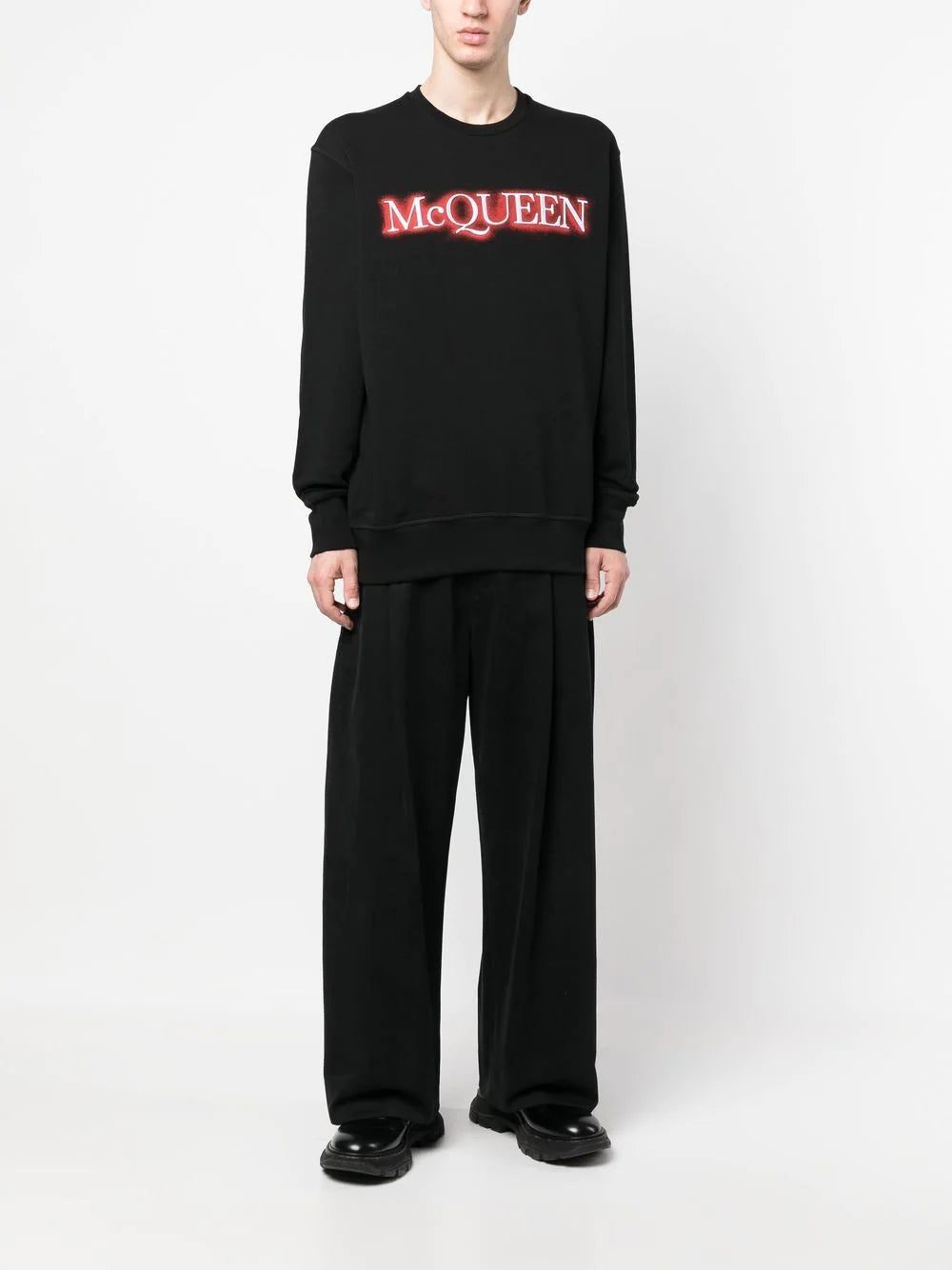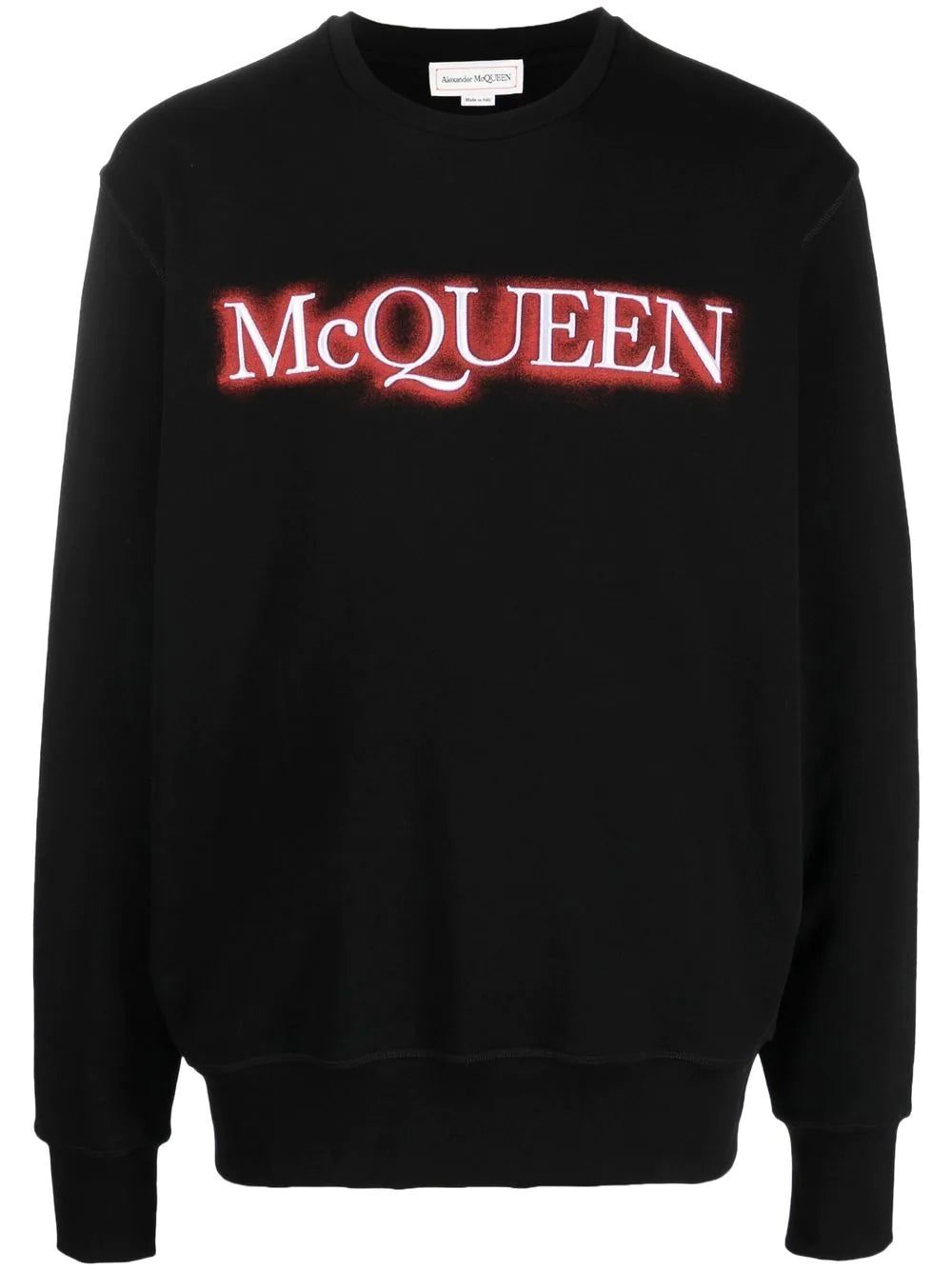 Alexander McQueen's sweatshirt is solely decorated with the brand's signature at the chest. The contrasting white letters traced with a red spray effect pop against the black background.
