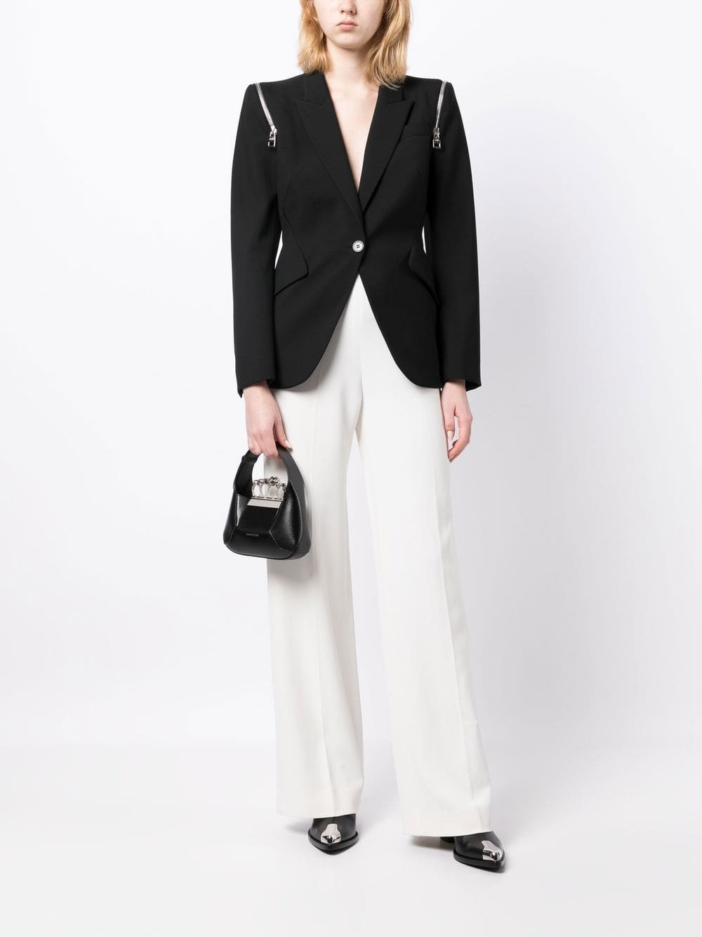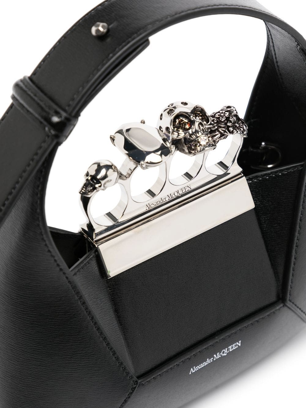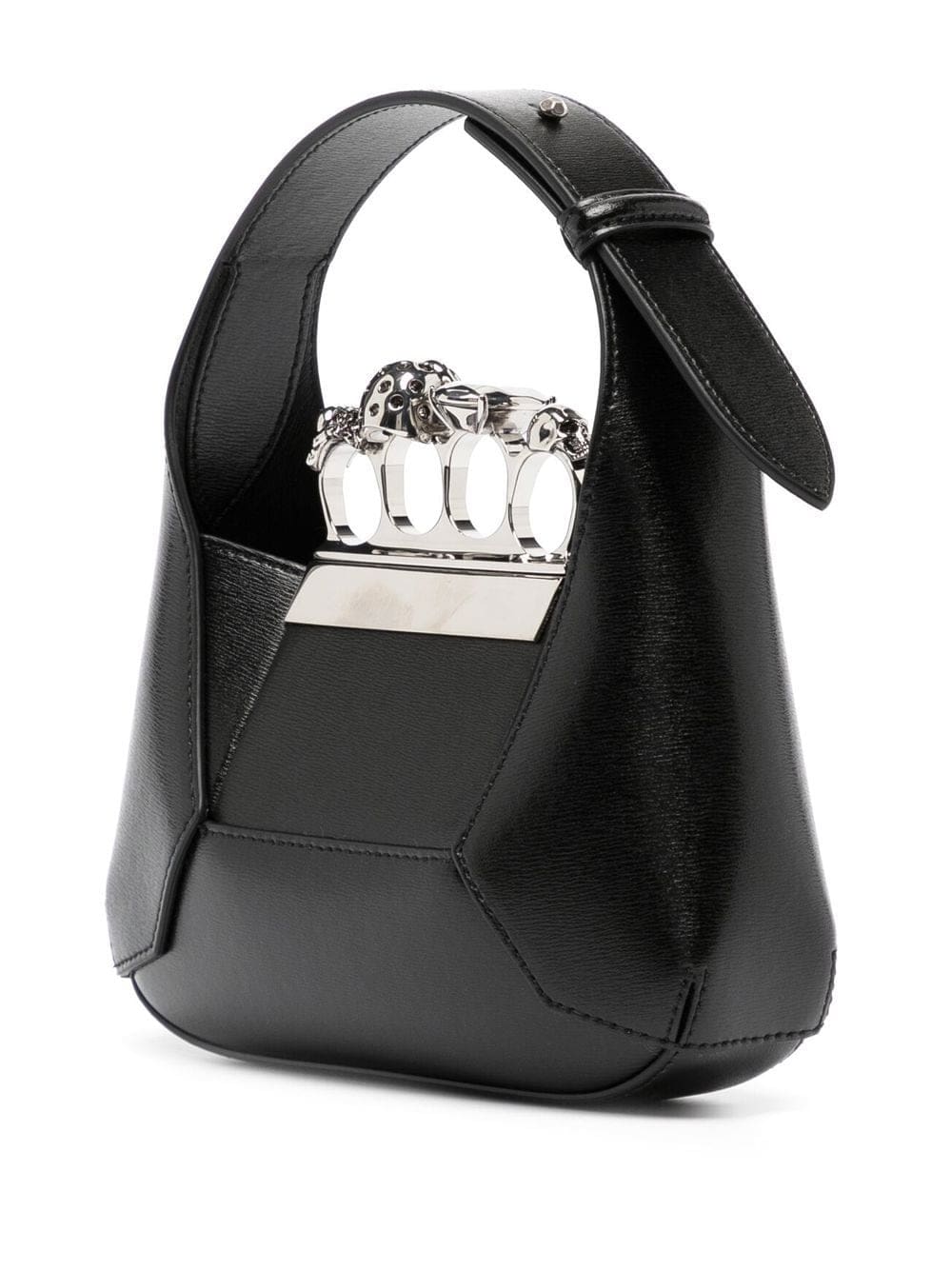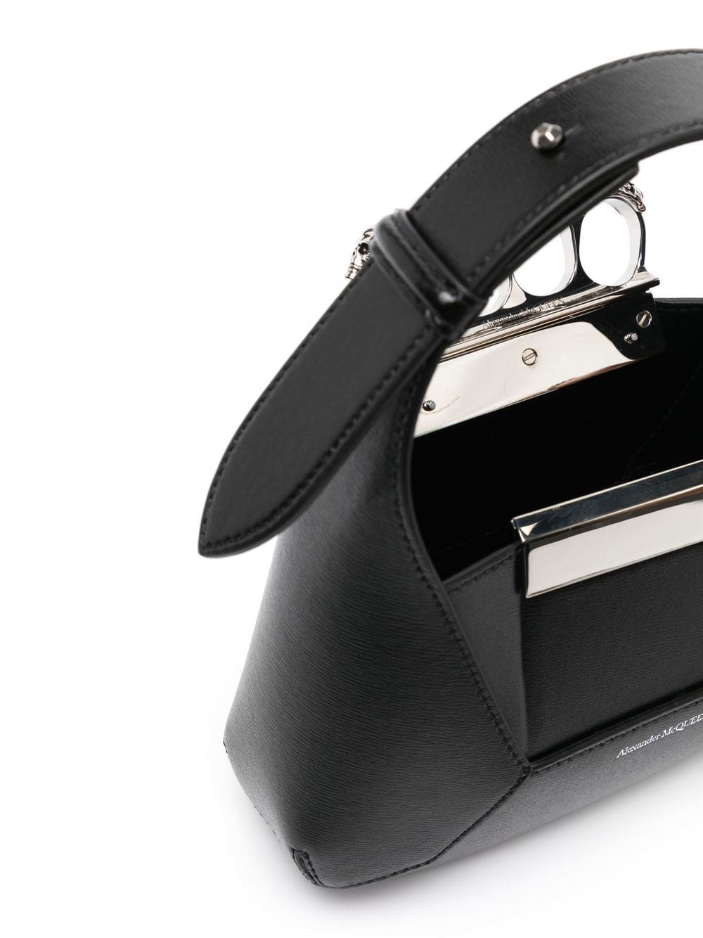 black leather panelled design knuckleduster detail crystal embellishment silver-tone logo lettering single flat top handle detachable chain-link shoulder strap main compartment