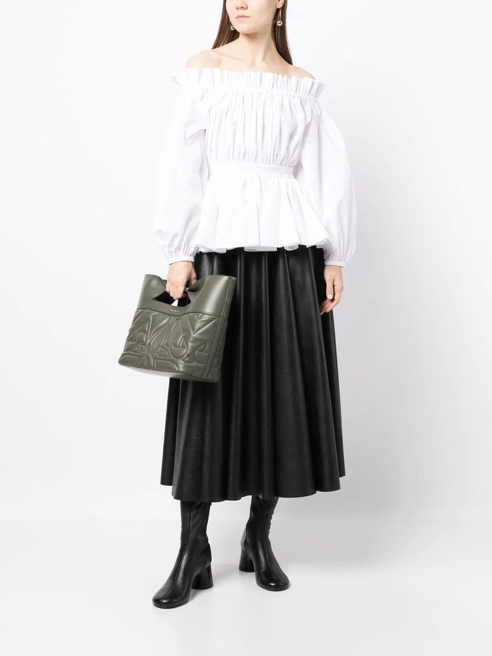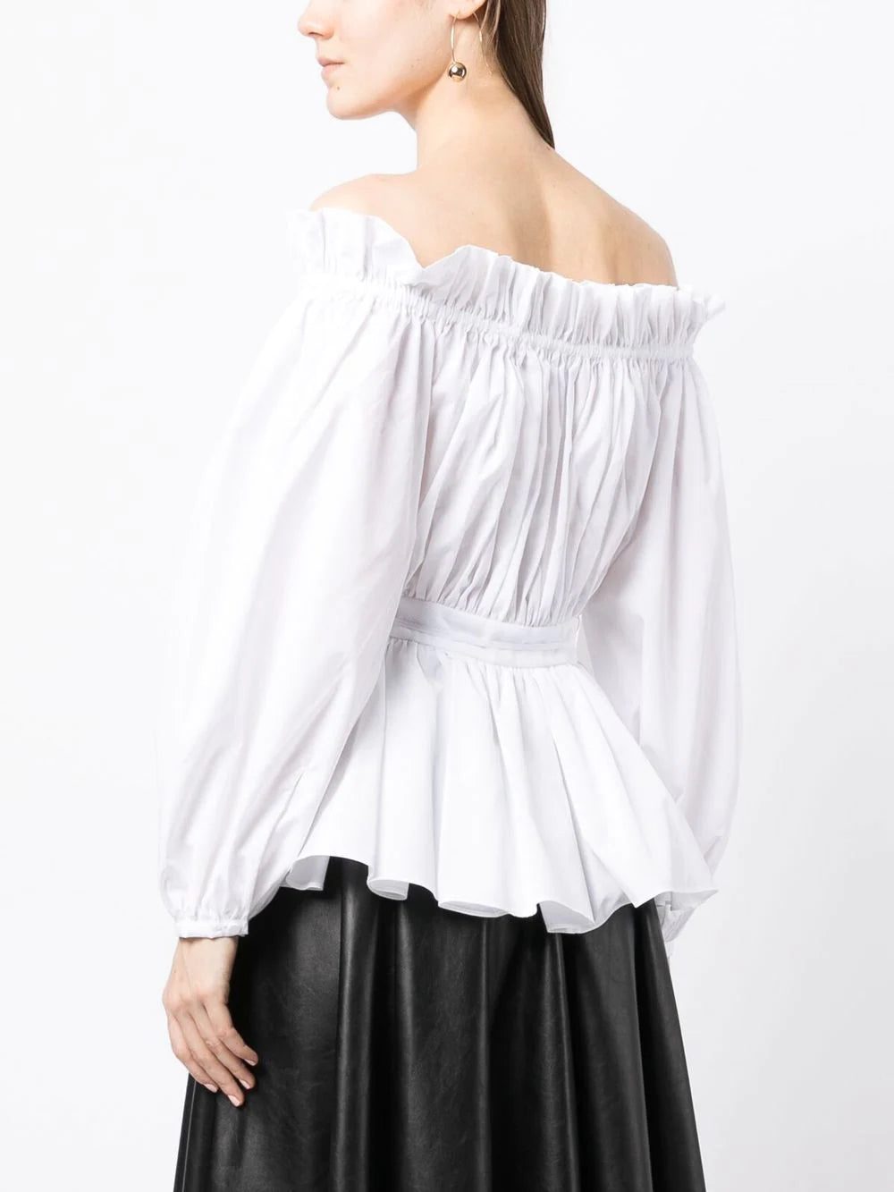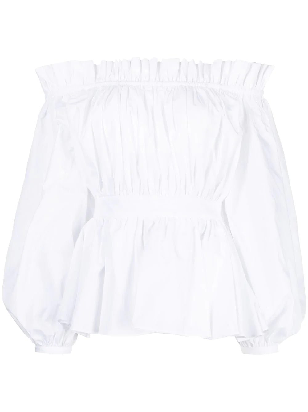 off-shoulder cotton blouse from Alexander McQueen featuring white, cotton, off-shoulder, gathered detailing, peplum waist, long sleeves and buttoned cuffs.