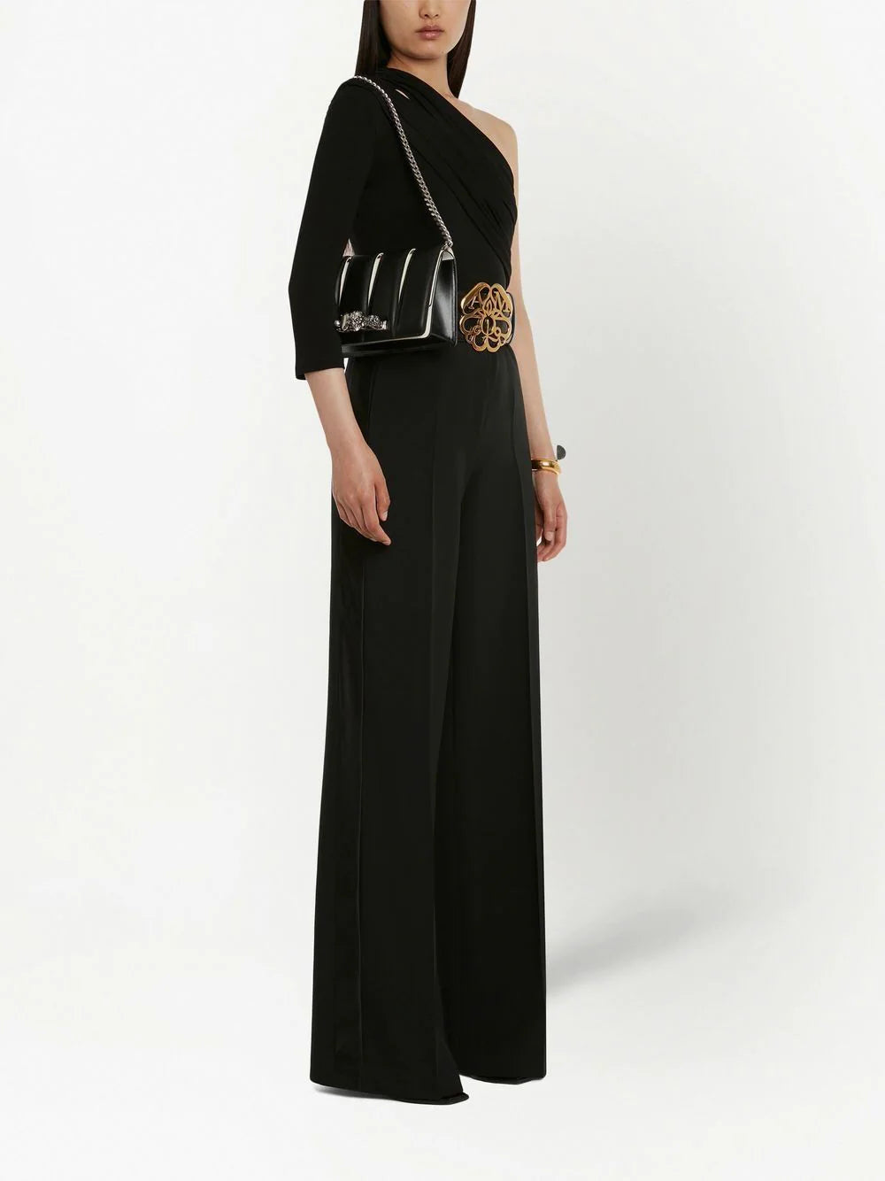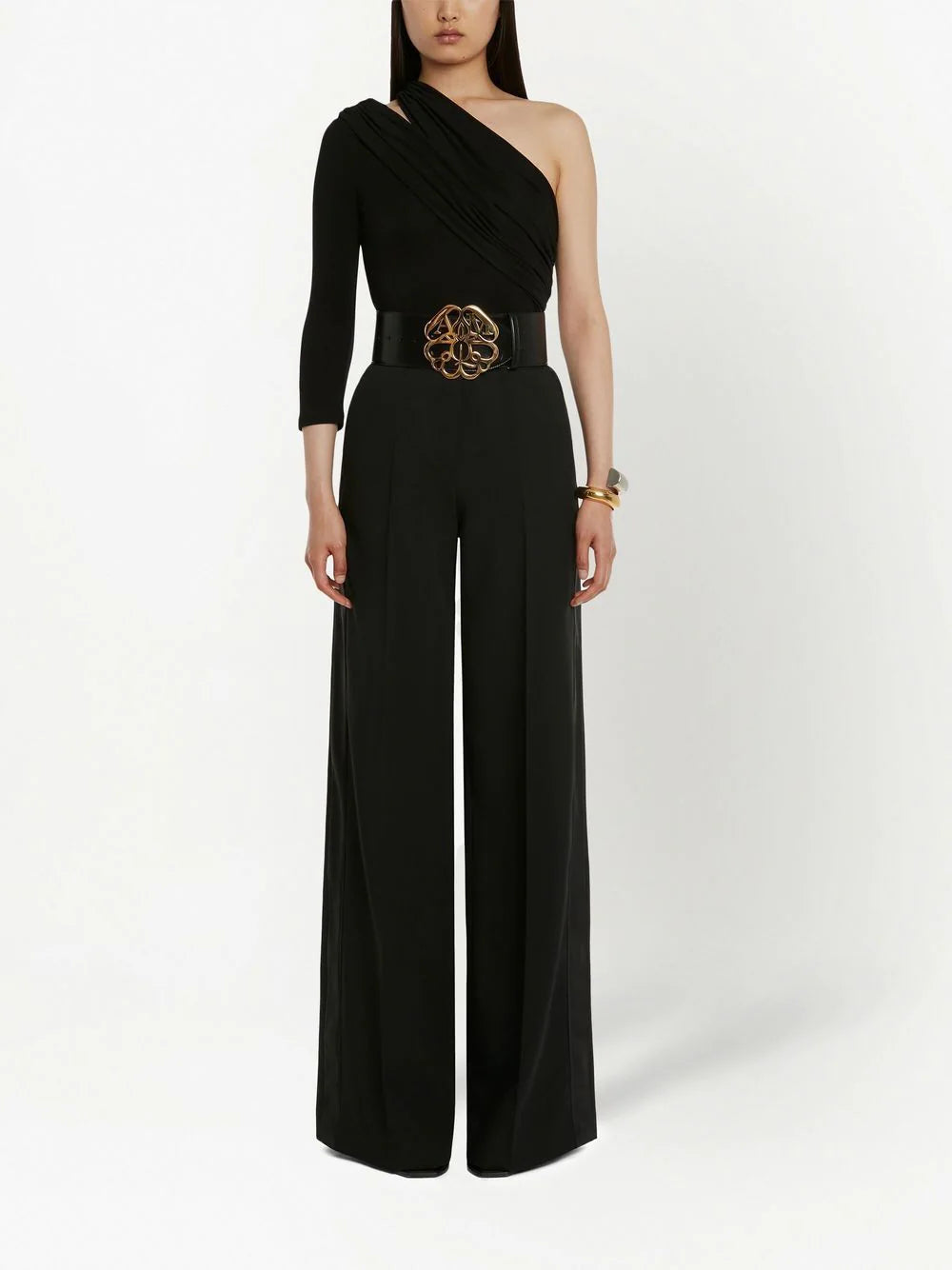 one-shoulder bodysuit from Alexander McQueen featuring black, stretch-design, one-shoulder, cut-out detailing and draped detailing. Just a reminder that this piece must be tried on over your own garments..