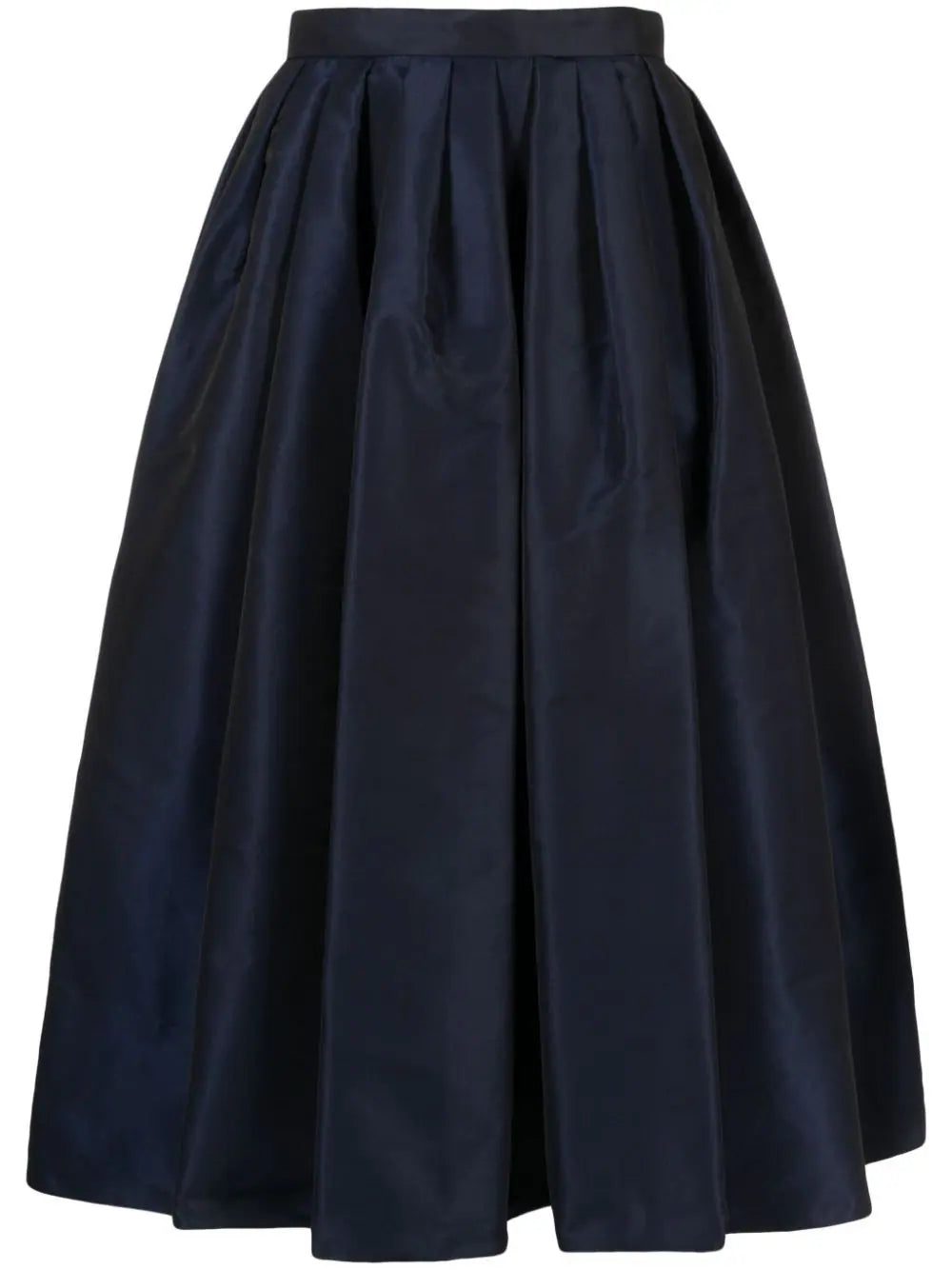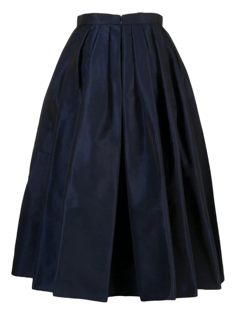 Celebrating Alexander McQueen's propensity for dramatic cuts, this navy-blue faille skirt is pleated at the waist to create a full silhouette that's reminiscent of the label’s runway pieces.