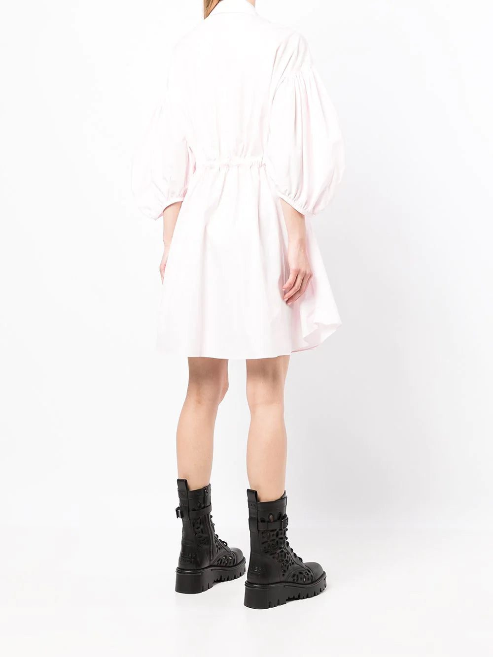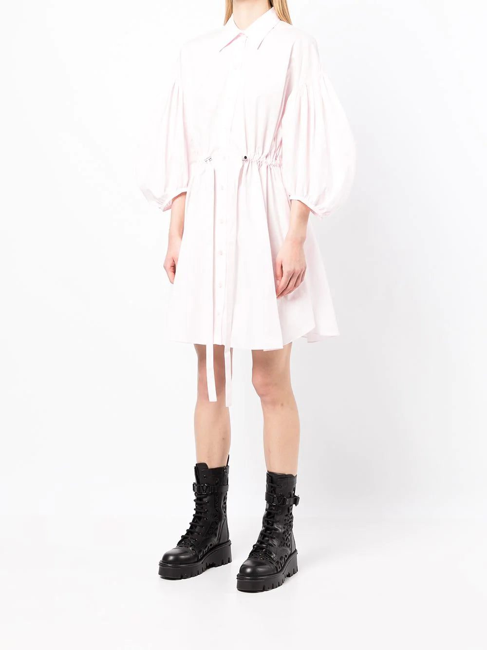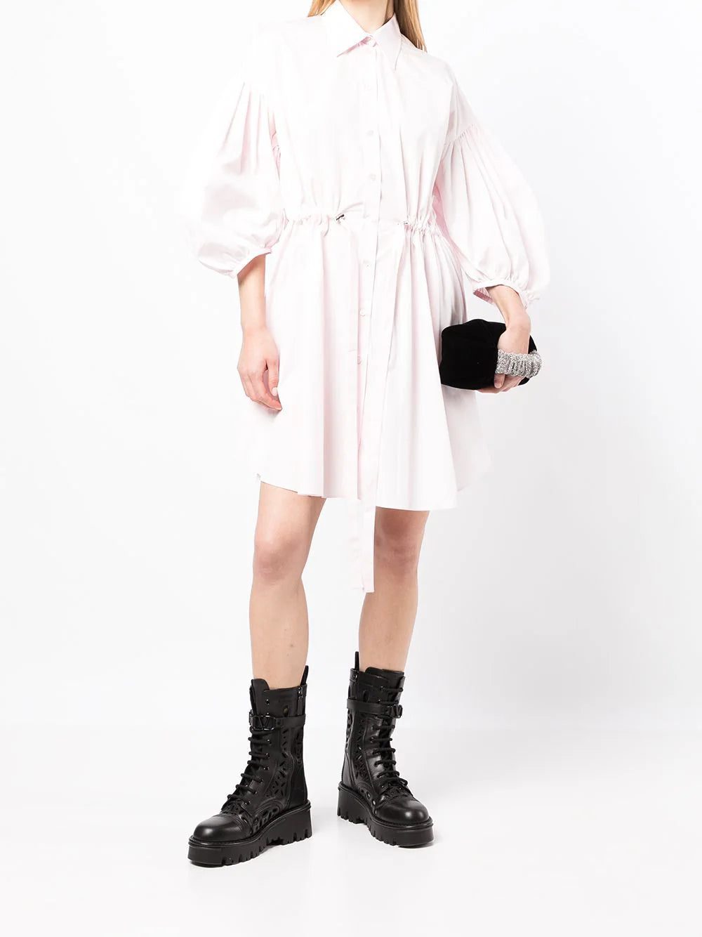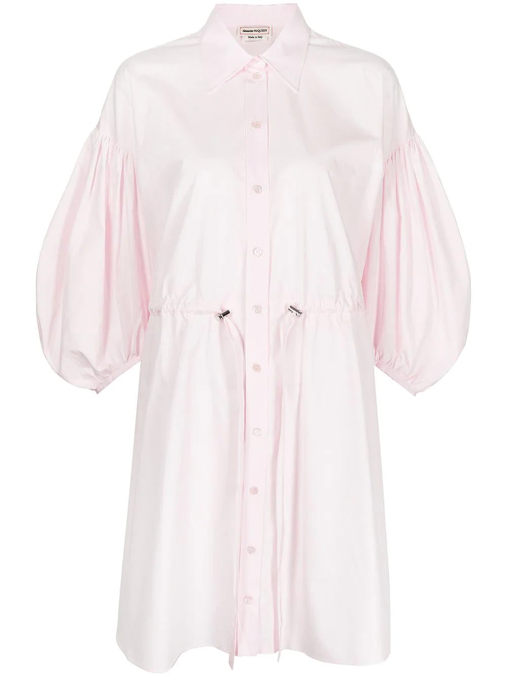 Alexander McQueen takes wardrobe staples and gives them a dramatic update. This ice-pink cotton shirt dress is refreshed with puff sleeves and a drawstring waist.