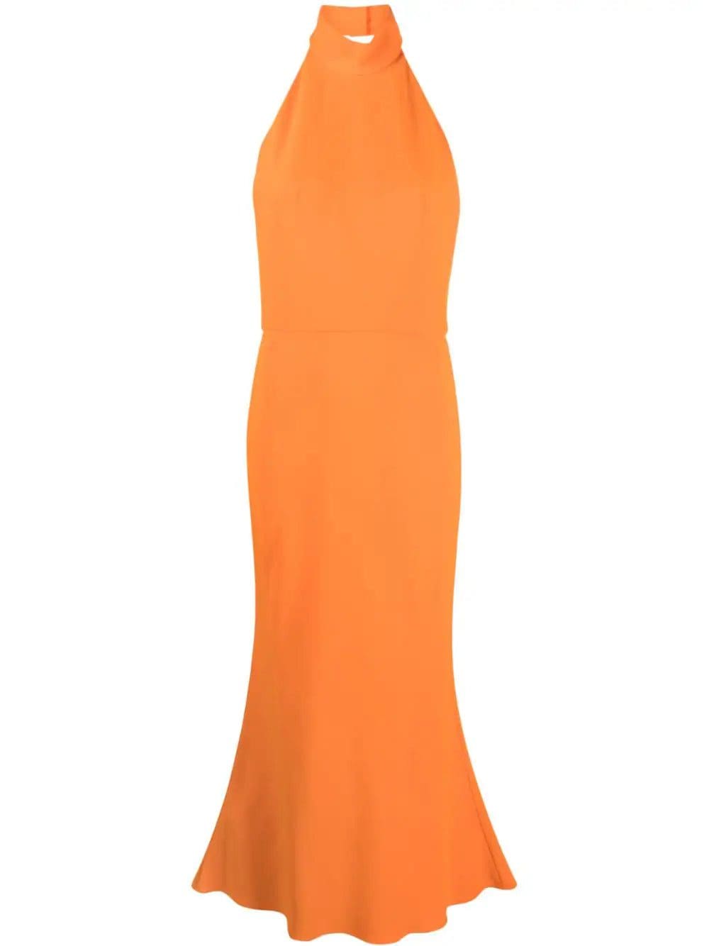 Alexander McQueen showcases the brand's signature use of impeccable construction on this SS23 collection dress. Here, a halterneck collar and sleeveless silhouette are presented in an orange hue.