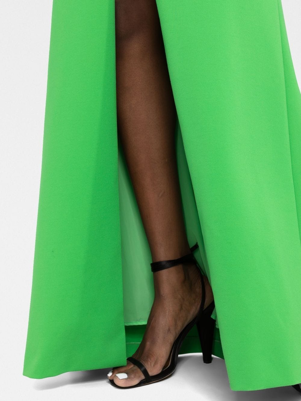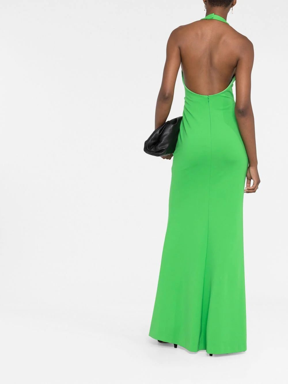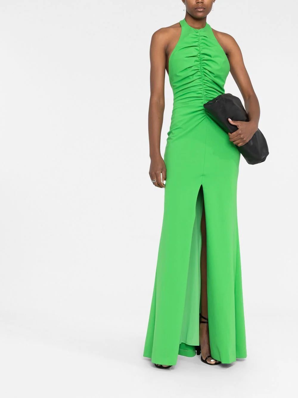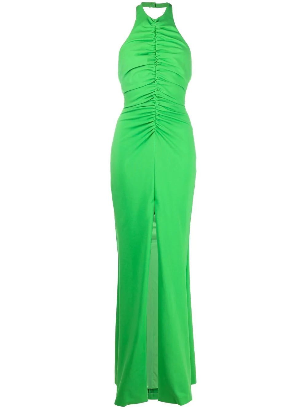Pioneering statement design, Alexander McQueen kicks each piece into high-octane level as this gown demonstrates. The ruched floor-length silhouette is further highlighted by a green hue and high front slit.