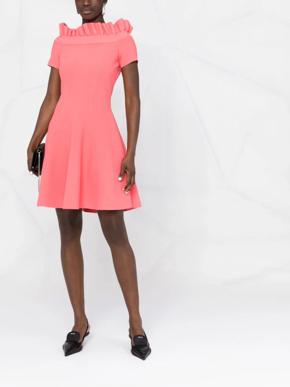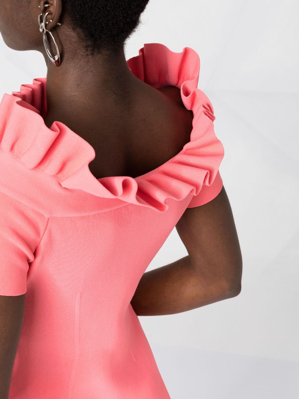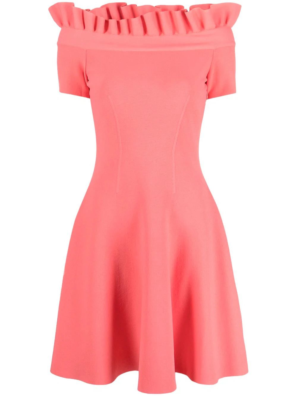 This Alexander McQueen off-the-shoulder knitted dress finds romanticism in elegant shaping. Realised in a pink hue, the dress is trimmed with engineered ruffles at the top and features a drop-waist flared skirt.