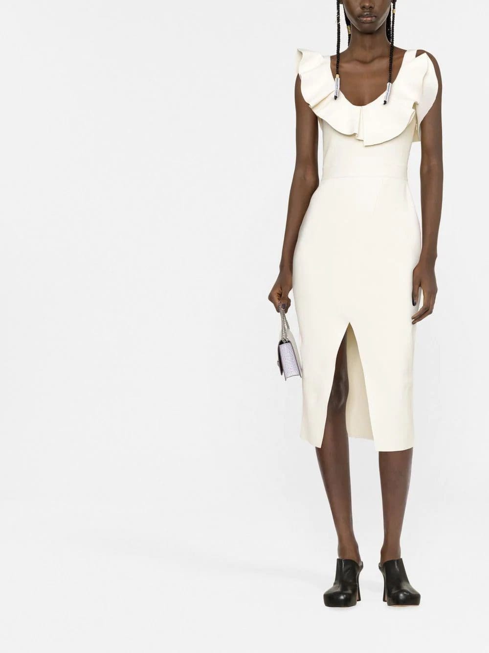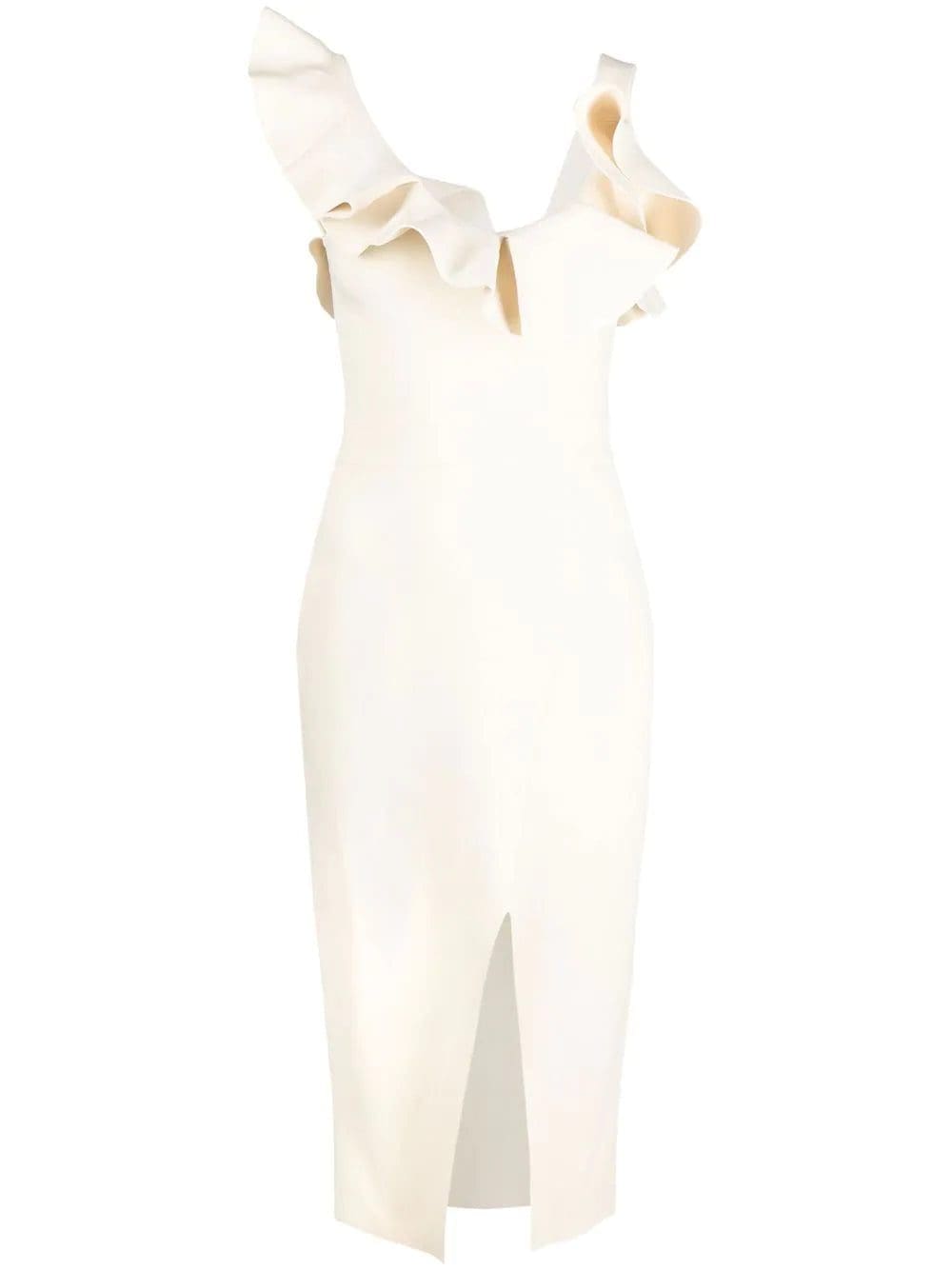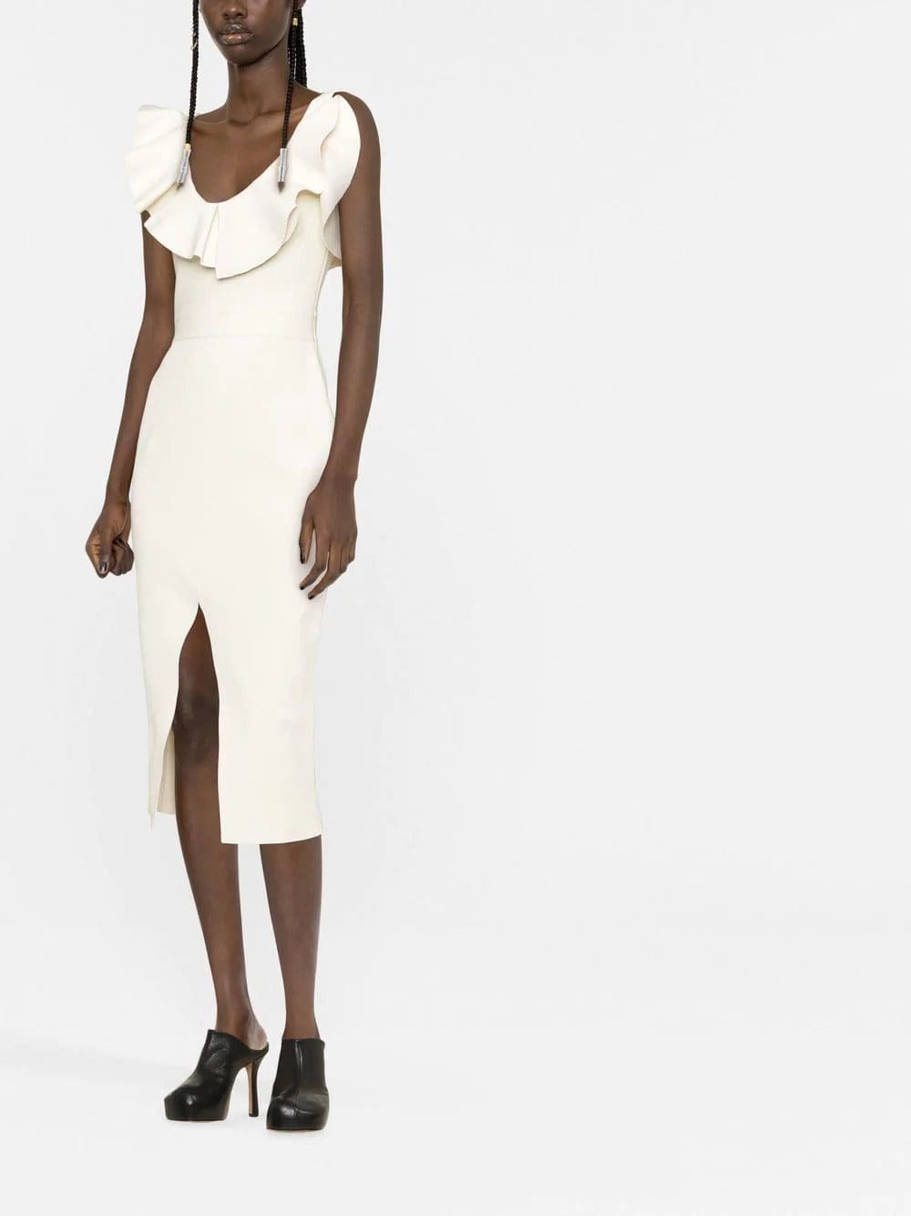 ruffled-neckline midi dress from Alexander McQueen featuring ruffle collar, front slit, scoop neck, sleeveless, mid-length and off-white.