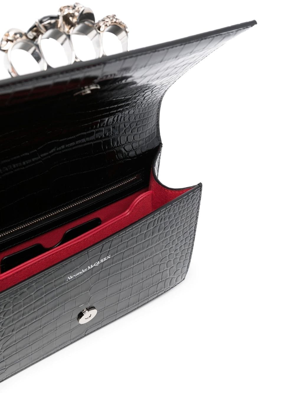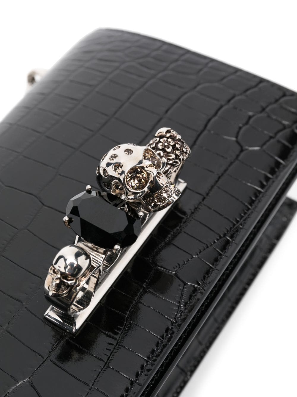 black calf leather silver-tone hardware embossed crocodile effect knuckleduster design foldover top with press-stud fastening chain-link shoulder strap main compartment