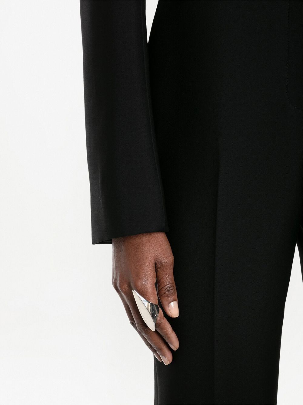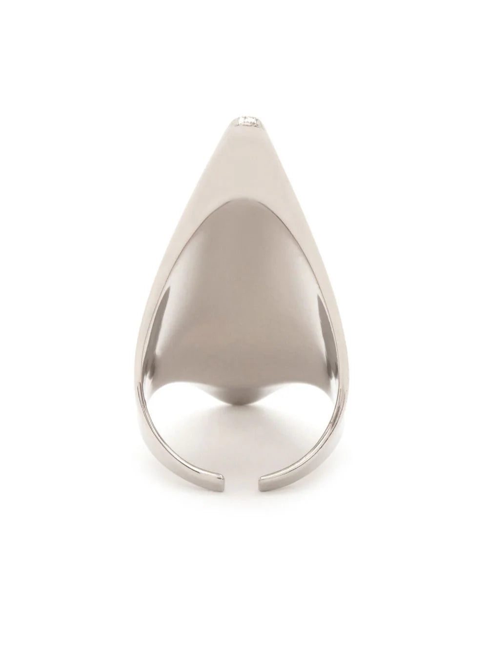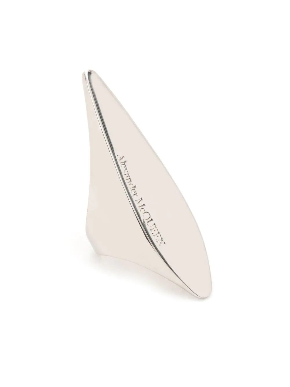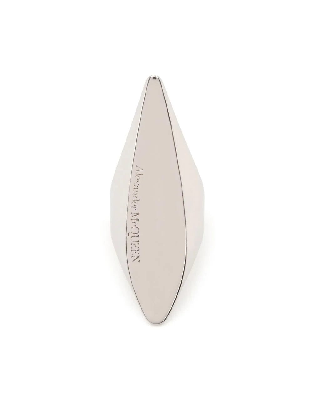 Shard-shaped logo ring from Alexander McQueen featuring silver-tone, brass, engraved logo, polished finish and adjustable fit.