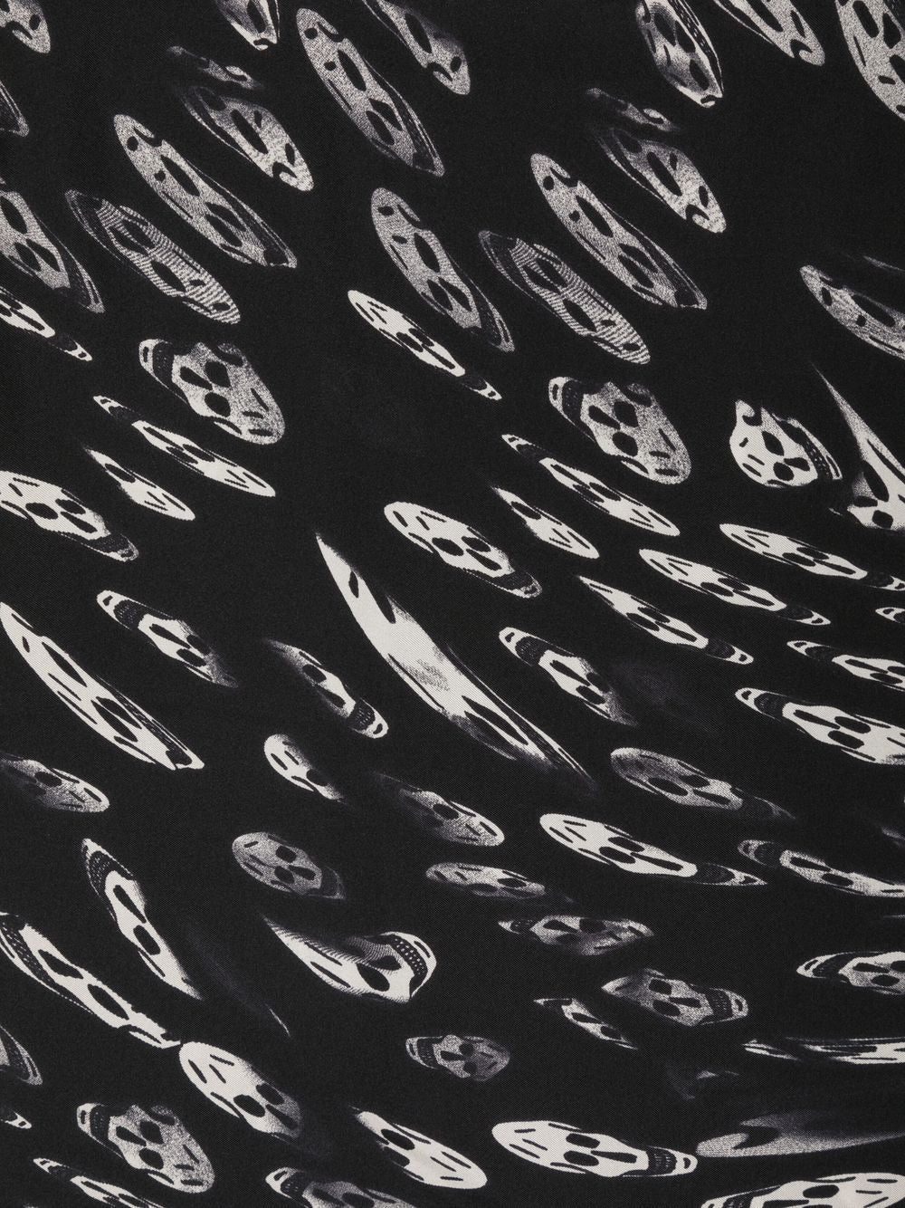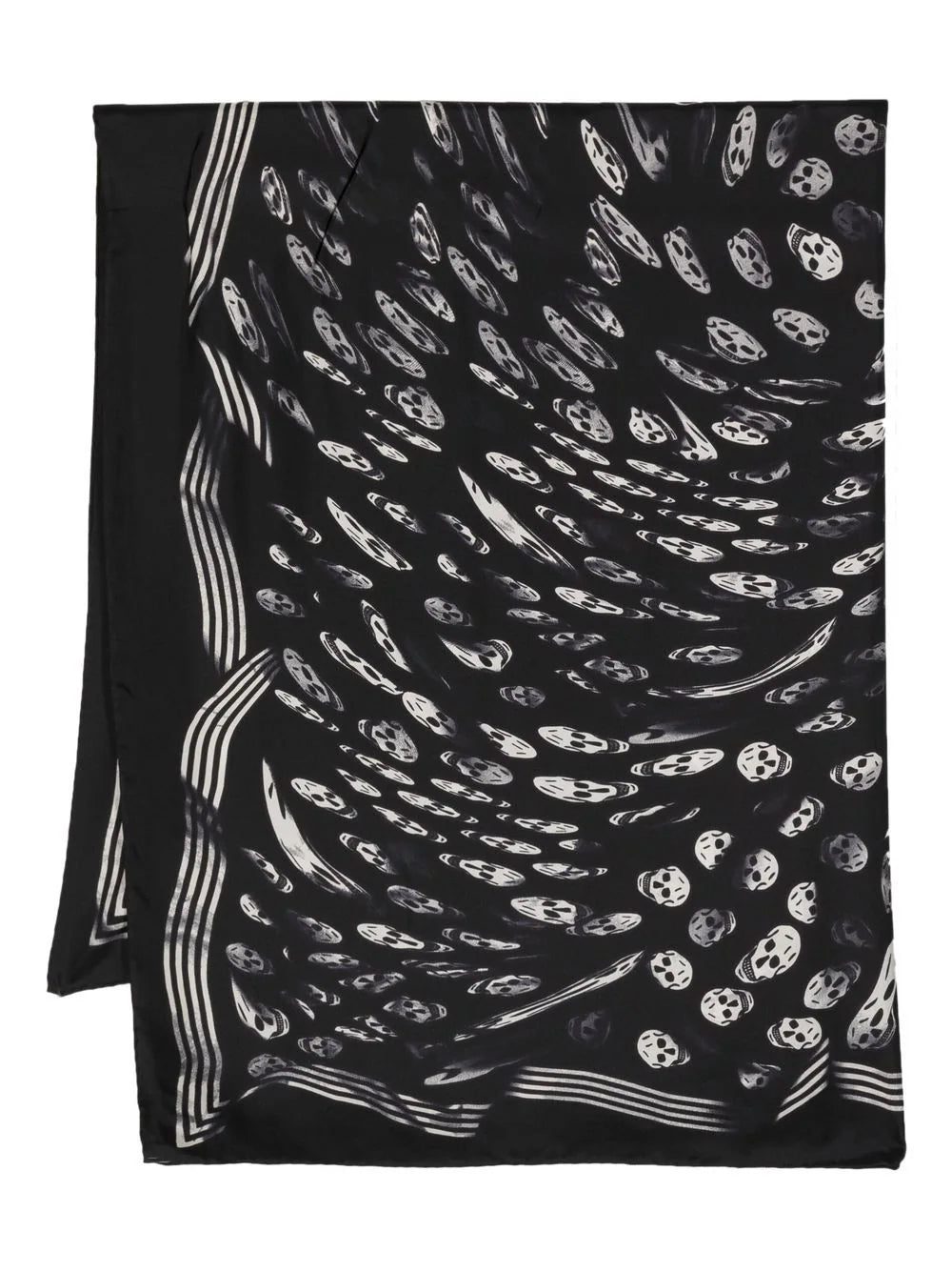 silk skull-print scarf from Alexander McQueen featuring black/white, silk, skull print, striped edge, lightweight construction and wraparound style.