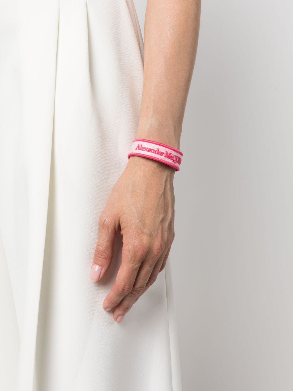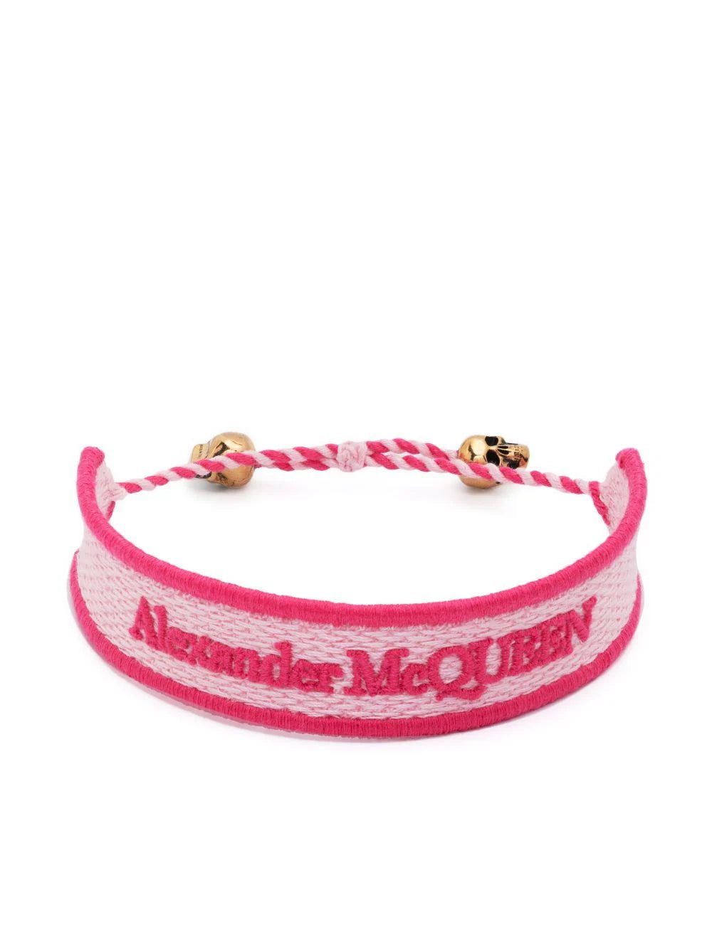 Expertly combining a fabric logo band with brass skull detailing, Alexander McQueen showcases its talent for designing dark and beautiful pieces with this bracelet.