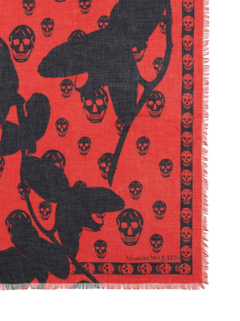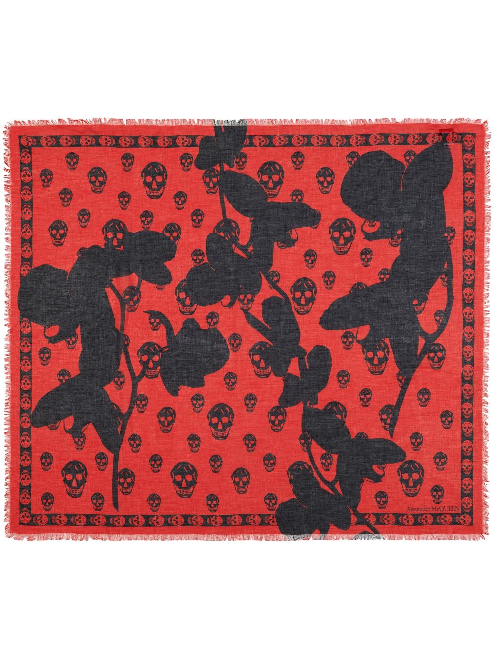 Equal parts theatrical and elegant, Alexander McQueen's gothic-inspired aesthetic is asserted with the use of its signature skull motif, found on this red and black scarf. The all-over orchid pattern adds a romantic touch.