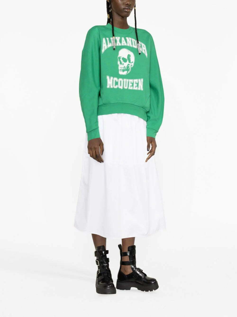 The iconic skull motif at the front of this green Alexander McQueen sweatshirt puts a subversive spin on the collegiate-inspired logo lettering surrounding it. It’s from cut from stretch cotton jersey to a relaxed silhouette.