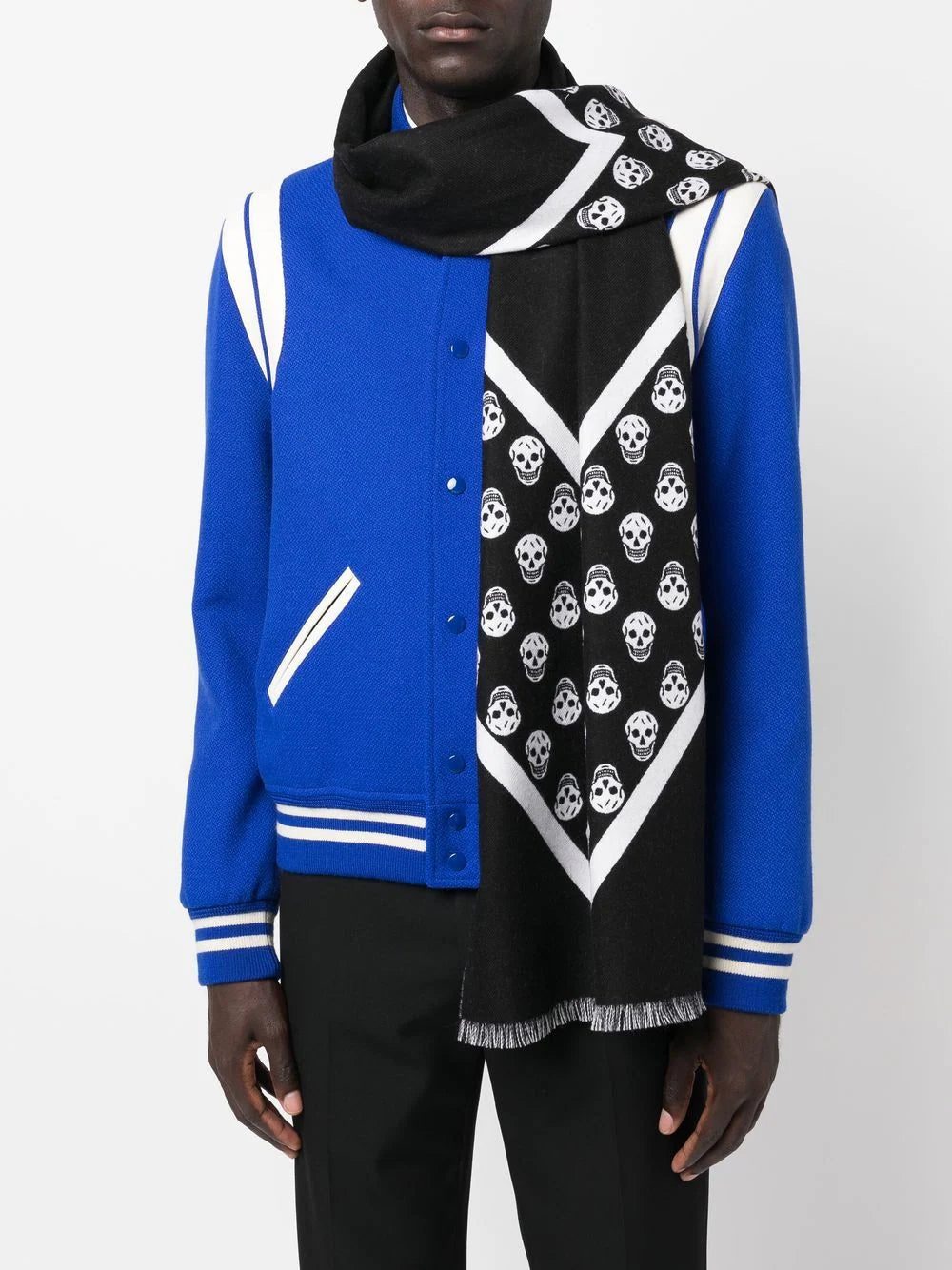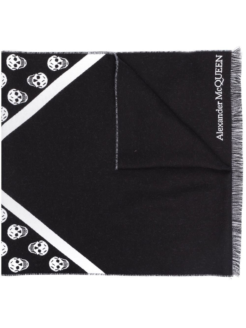 skull-print wool scarf from Alexander McQueen featuring skull print, logo-print edge, frayed detailing, black/white and wool.