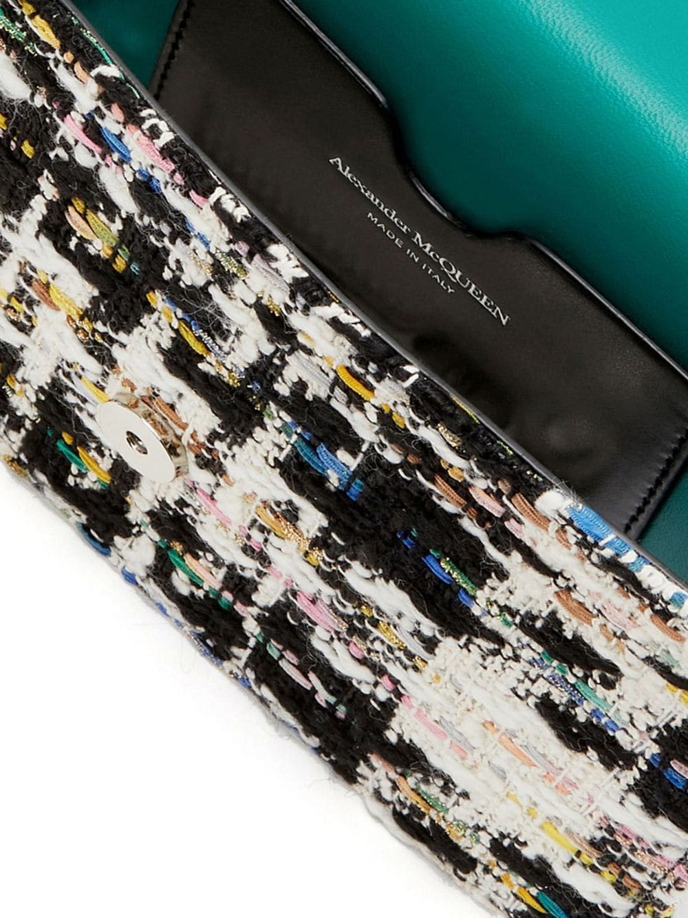 Alexander McQueen's small Skull Bag is crafted from leather and multicoloured tweed, for an elegant touch. It features a wide biker-inspired shoulder strap.
