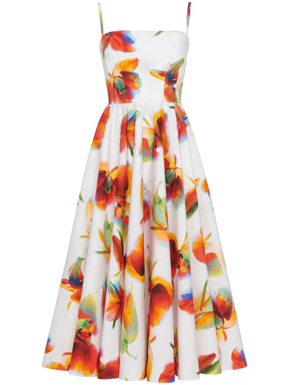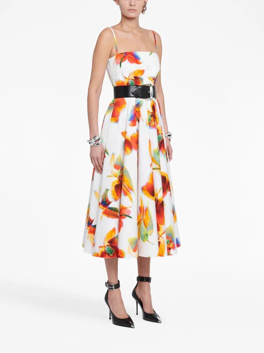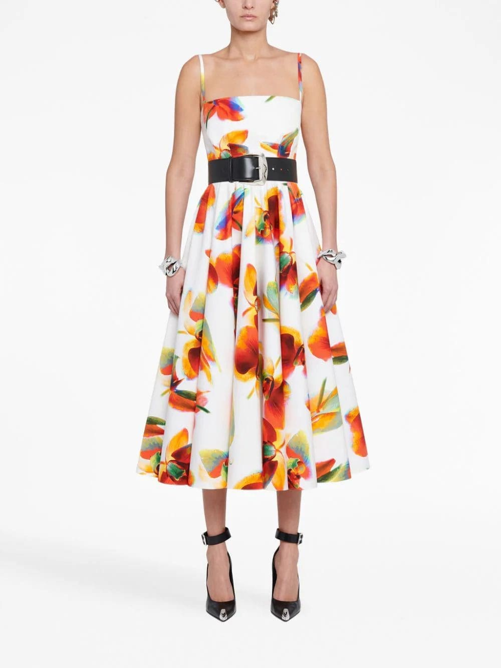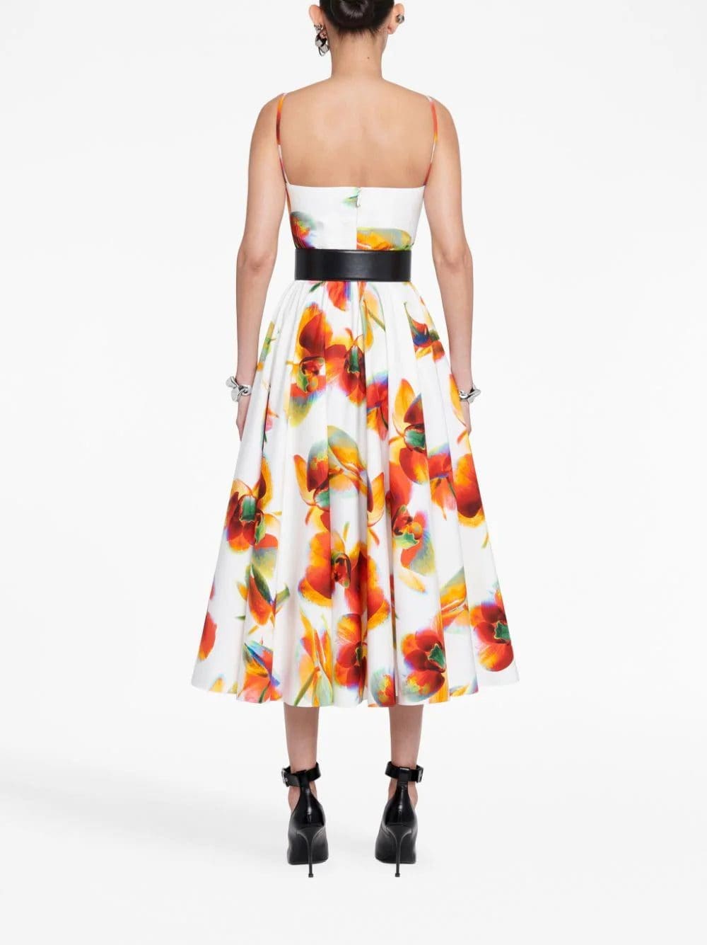 Nodding to the brand’s penchant for bold palettes and motifs, this midi dress from Alexander McQueen is elevated with the seasonal Solarised Orchid print. It features a square neckline and corset-inspired stitch detailing on the waist.