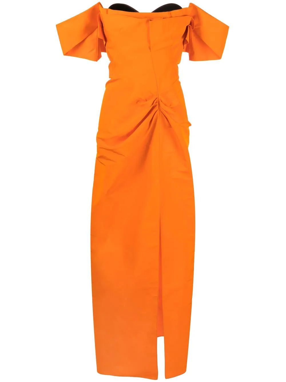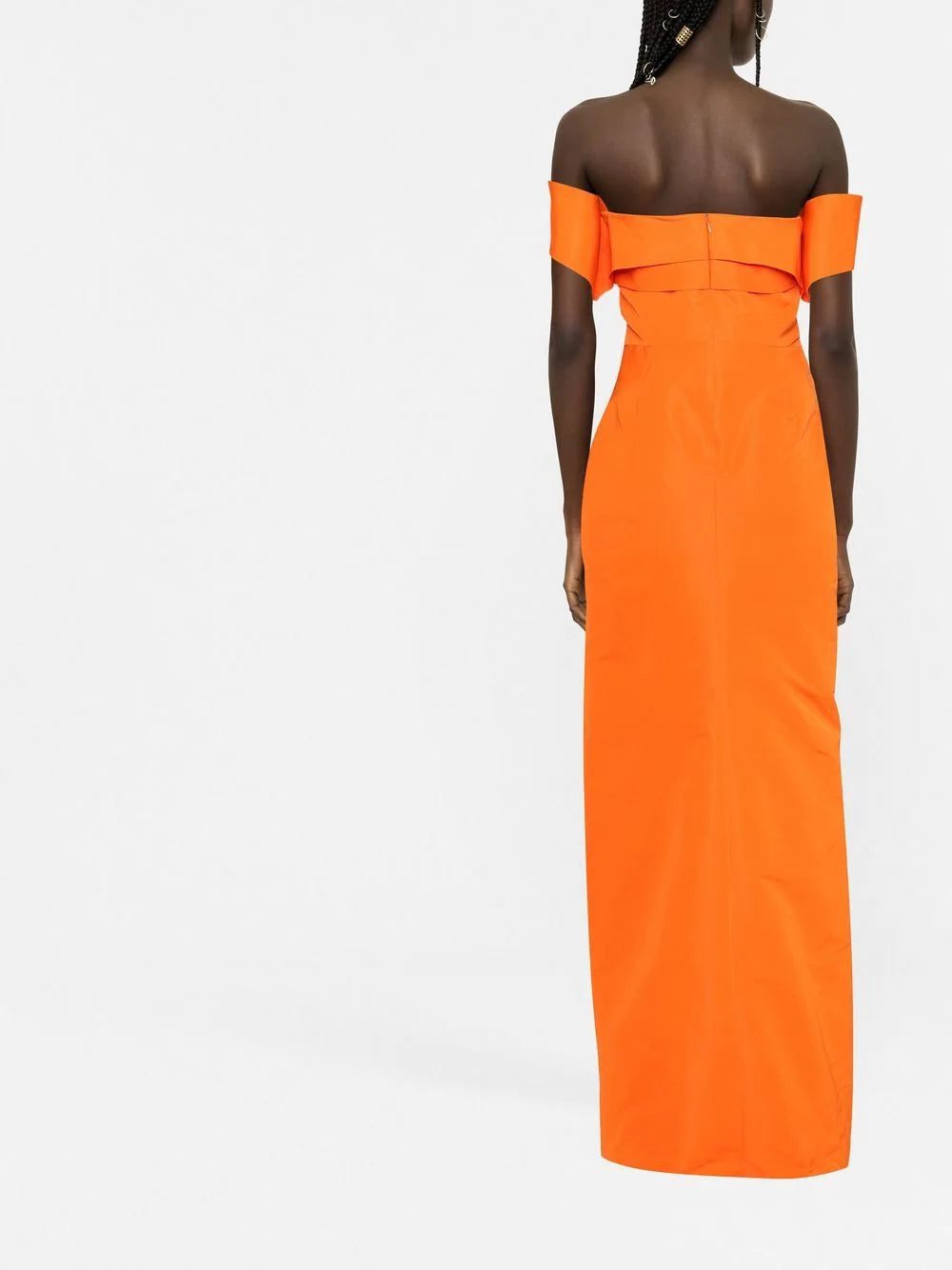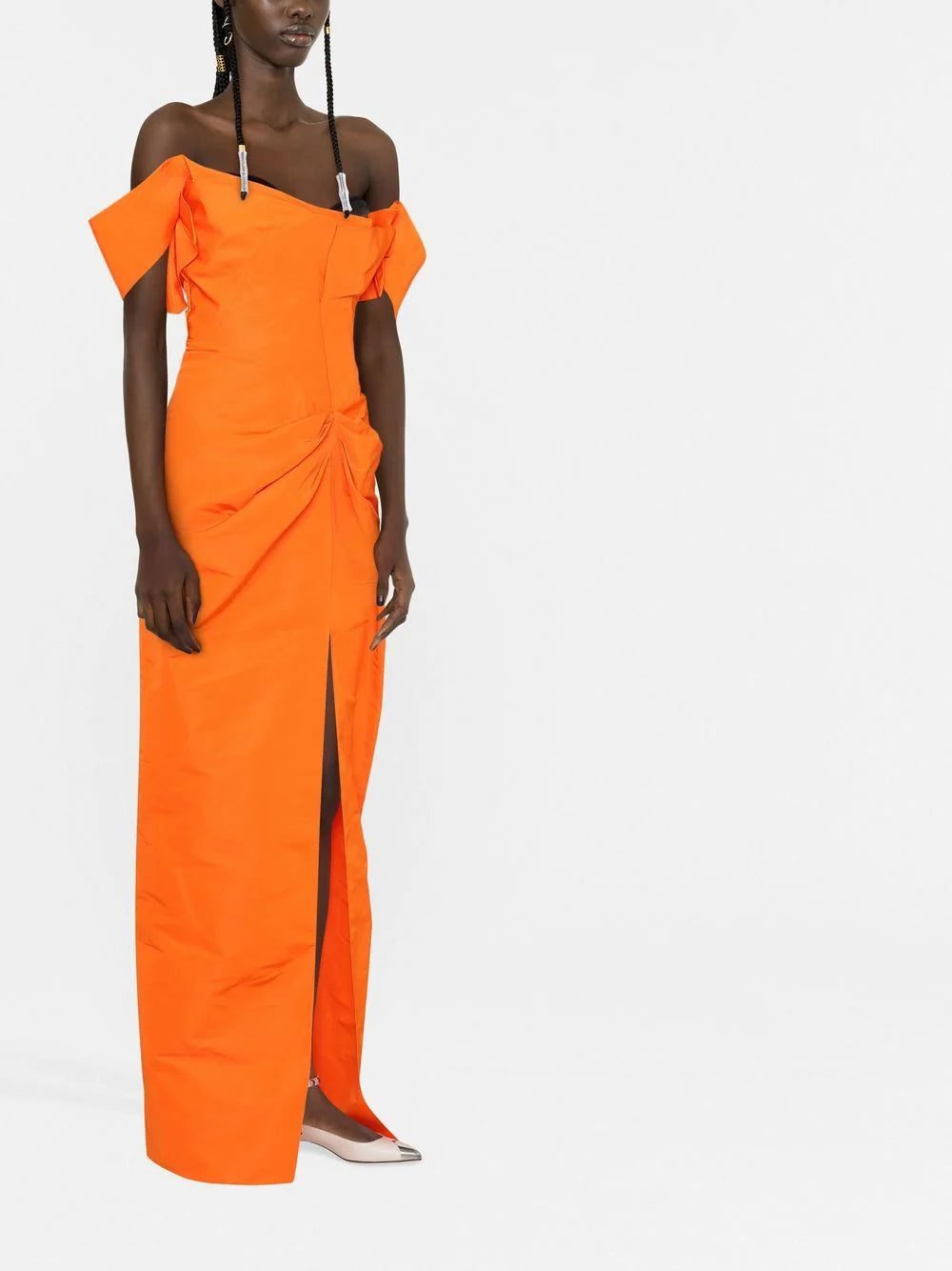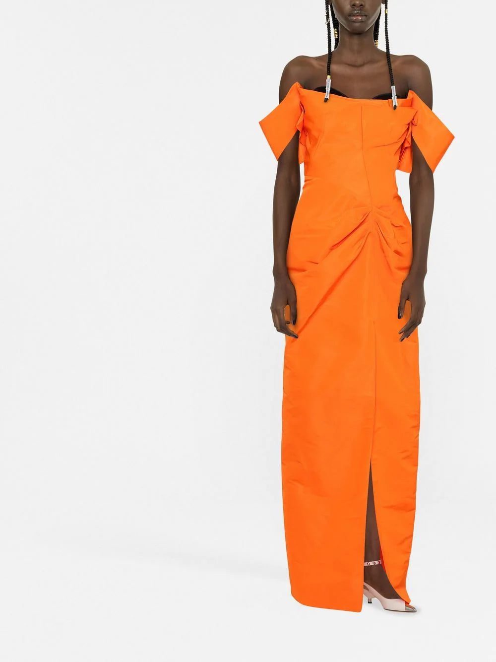 Alexander McQueen is known for pairing bold design with impeccable tailoring. Showcased on this strapless dress, the garment features a bright orange tonal colourway.