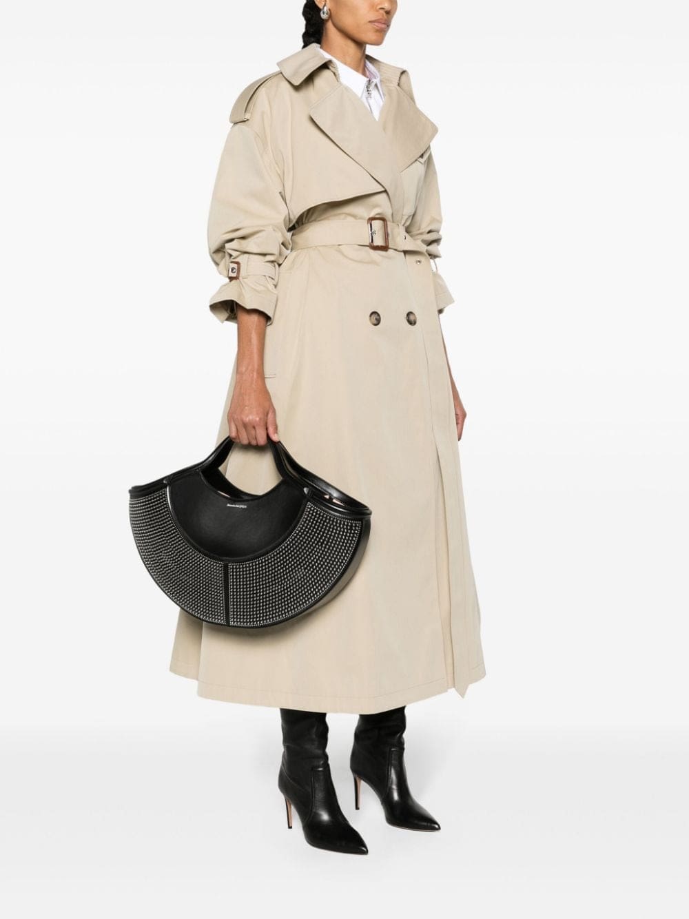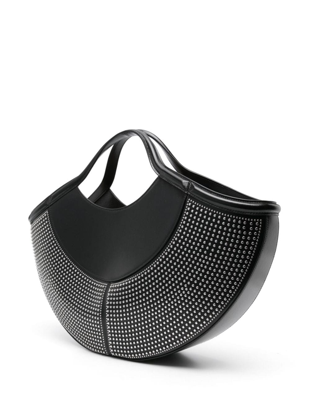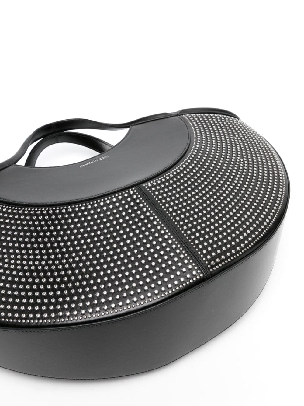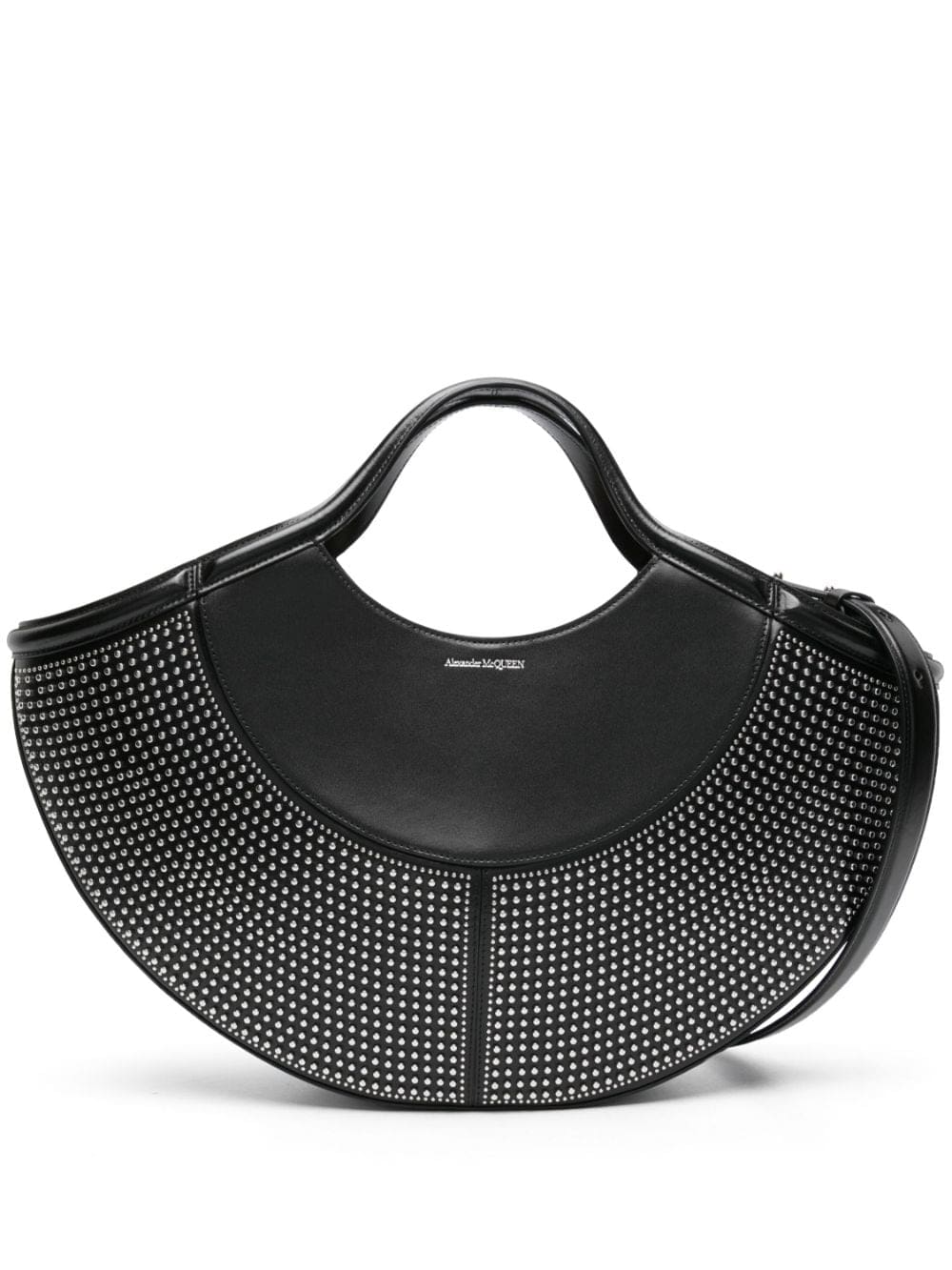 Alexander McQueen draws inspiration from 'the intricate spheres' of the human body to create pieces like this The Cove bag. It's made from black leather to an elliptical shape, accented by silver-tone studs and a logo print.