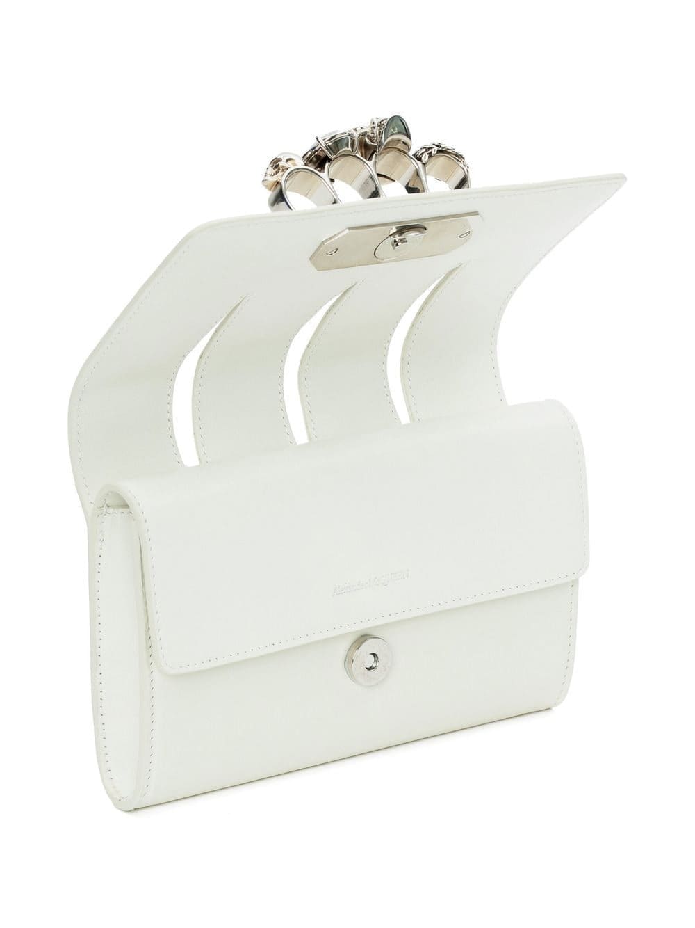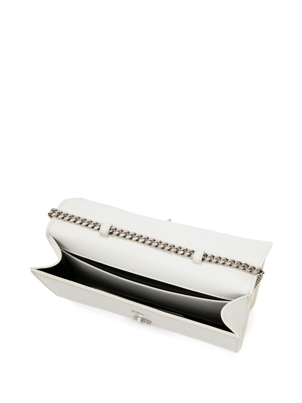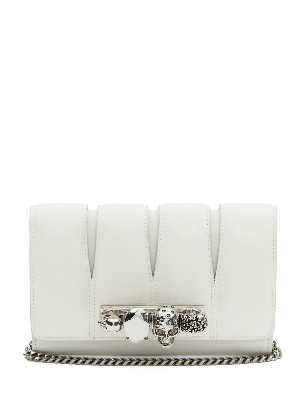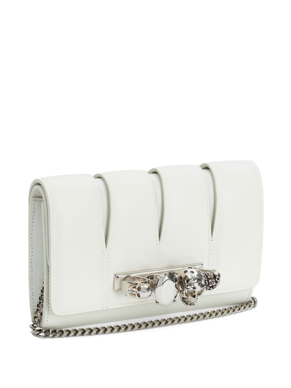 ivory white calf leather lambskin ring embellishment skull appliqué foldover top snap-fit fastening chain-link shoulder strap main compartment internal slip pocket