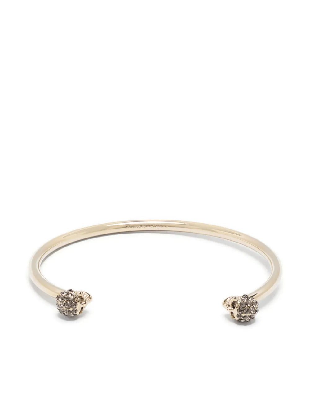Add a touch of Alexander McQueen's gothic edginess to your look with this gold-tone brass bracelet. It features two skull heads at either end and an embossed logo. Modern women will love Alexander McQueen's elegantly crafted accessories with an unconventional twist.