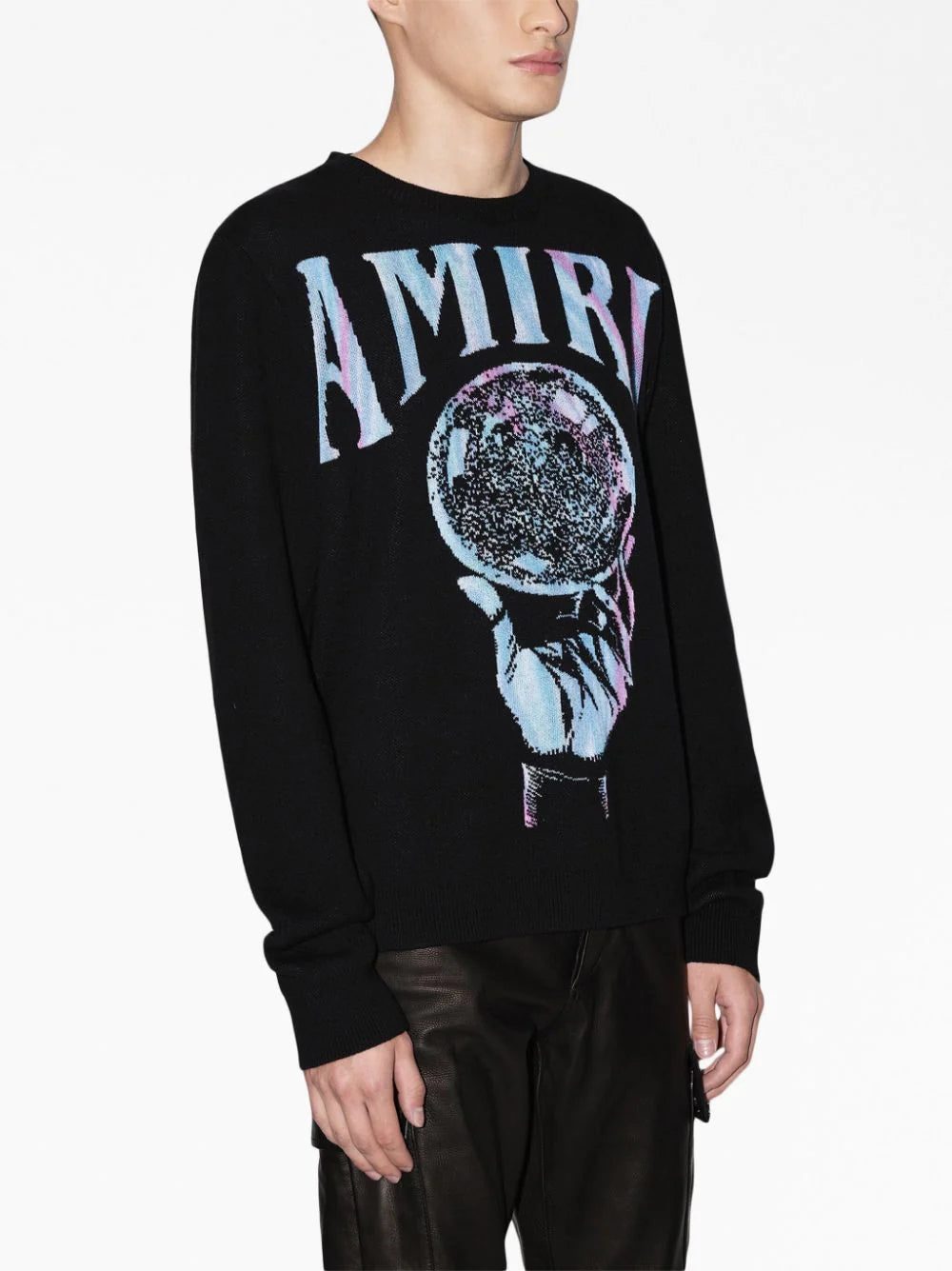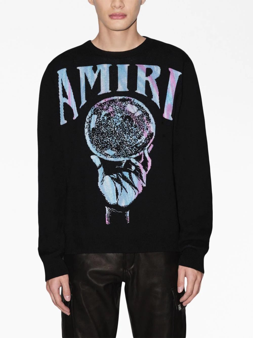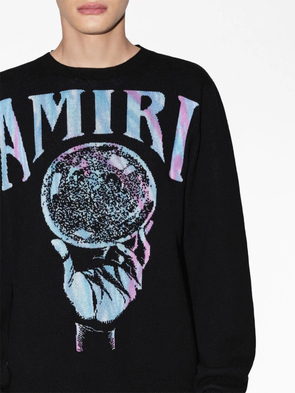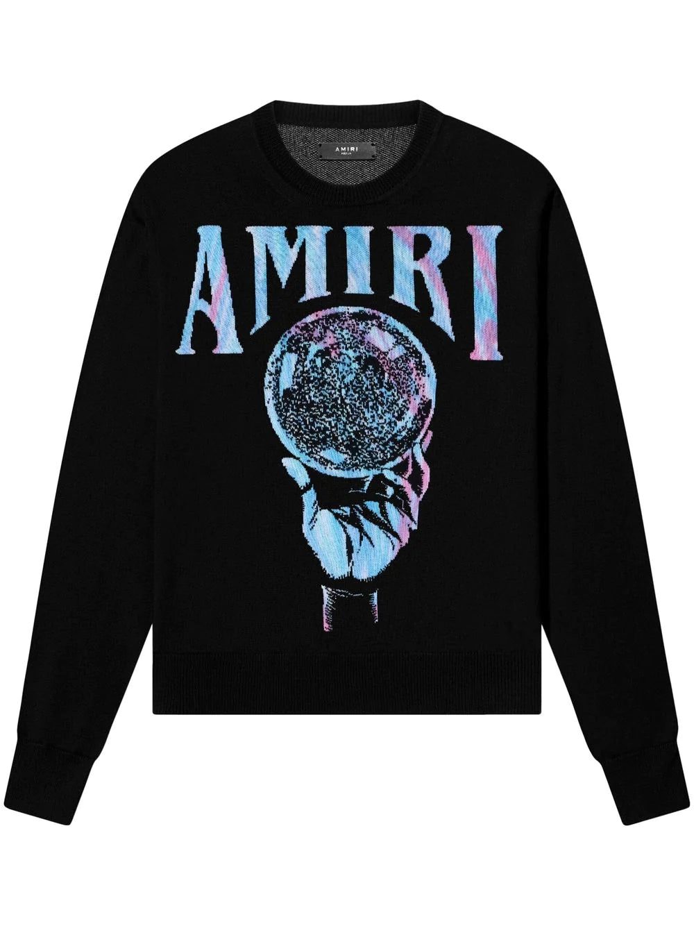 A blue and purple illustration of a crystal ball decorates this recycled cashmere long-sleeve sweatshirt, framed by their signature logo printed in bold capital lettering.