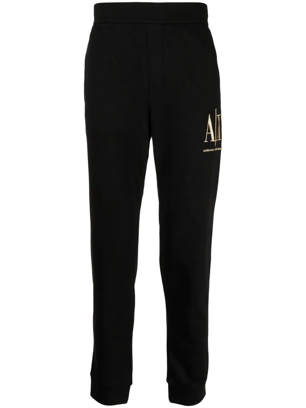 logo-embroidered track pants from ARMANI EXCHANGE featuring black, cotton, jersey knit, metallic threading, embroidered logo to the side, elasticated waistband, tapered leg, elasticated ankles, two side slit pockets and rear patch pocket.