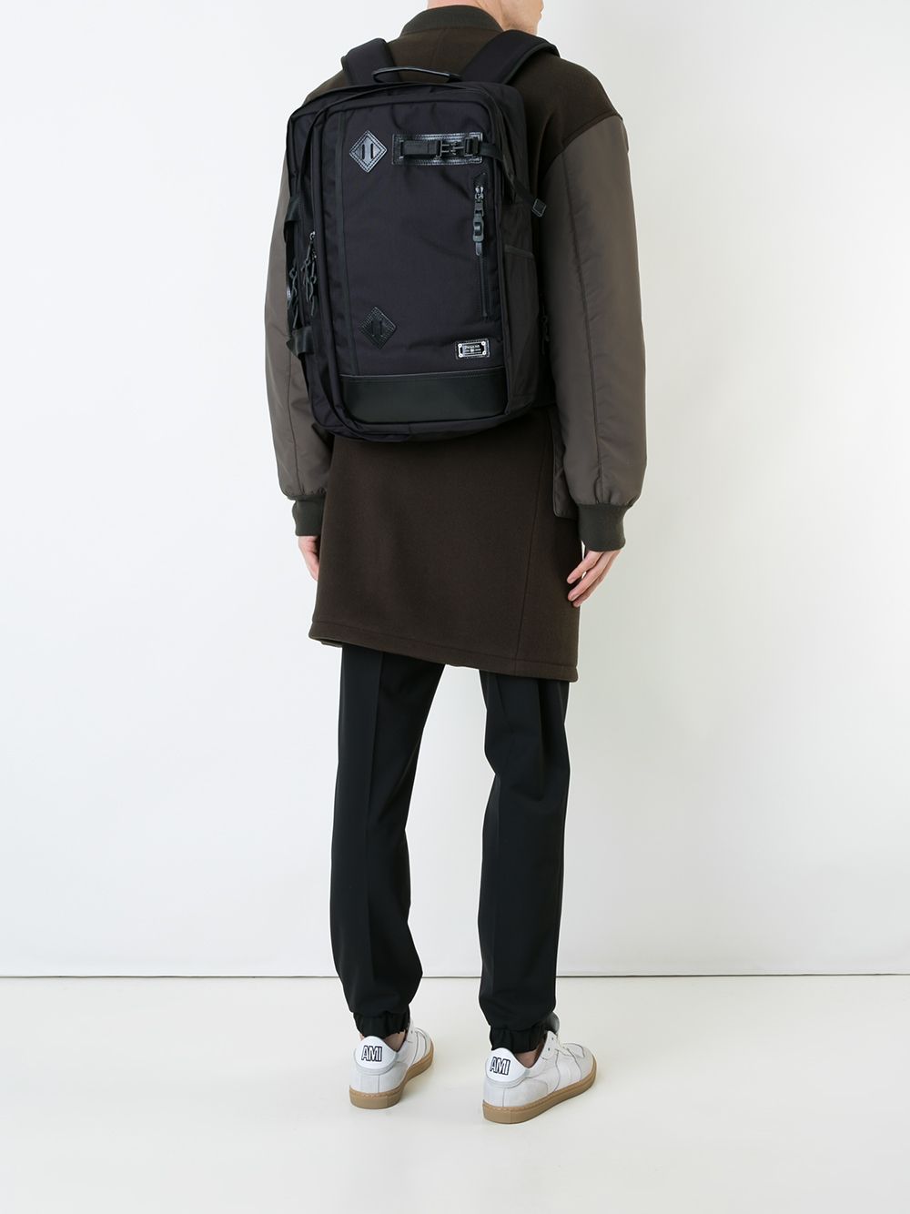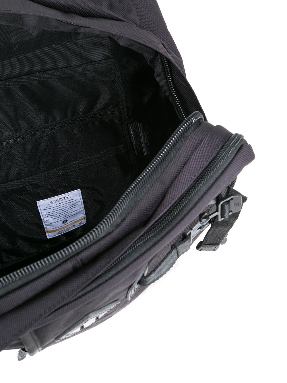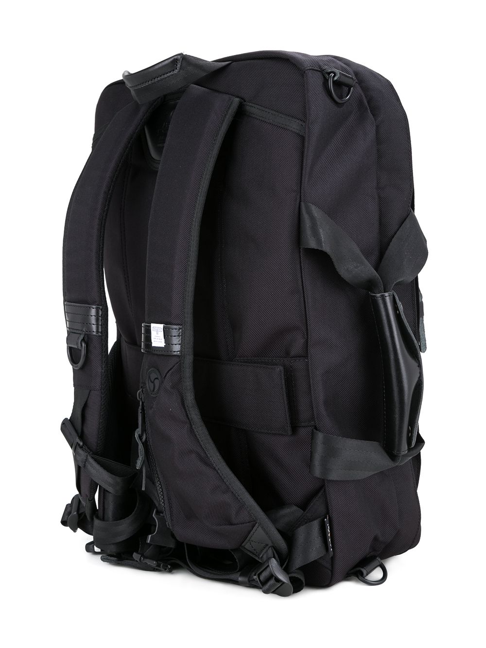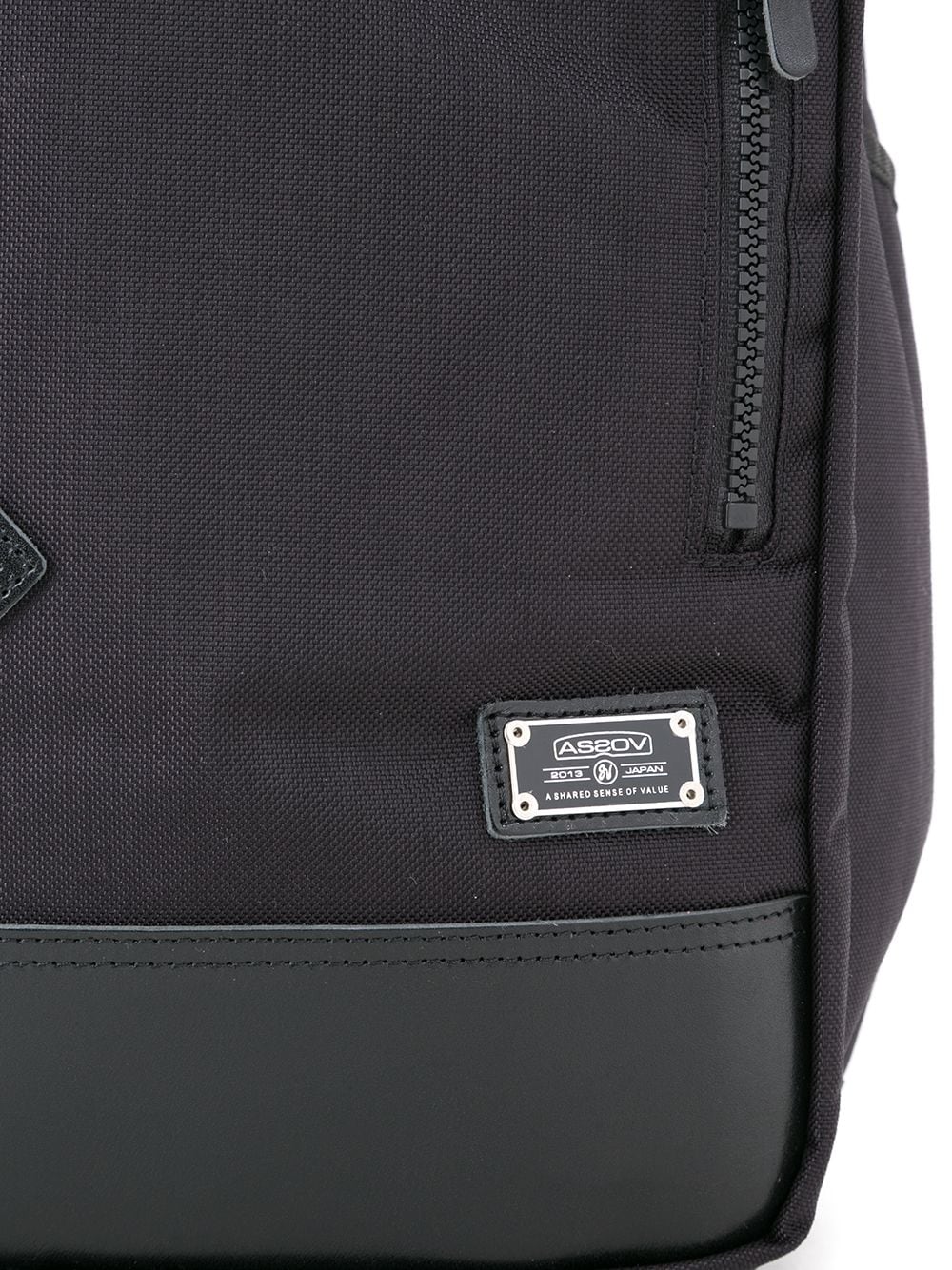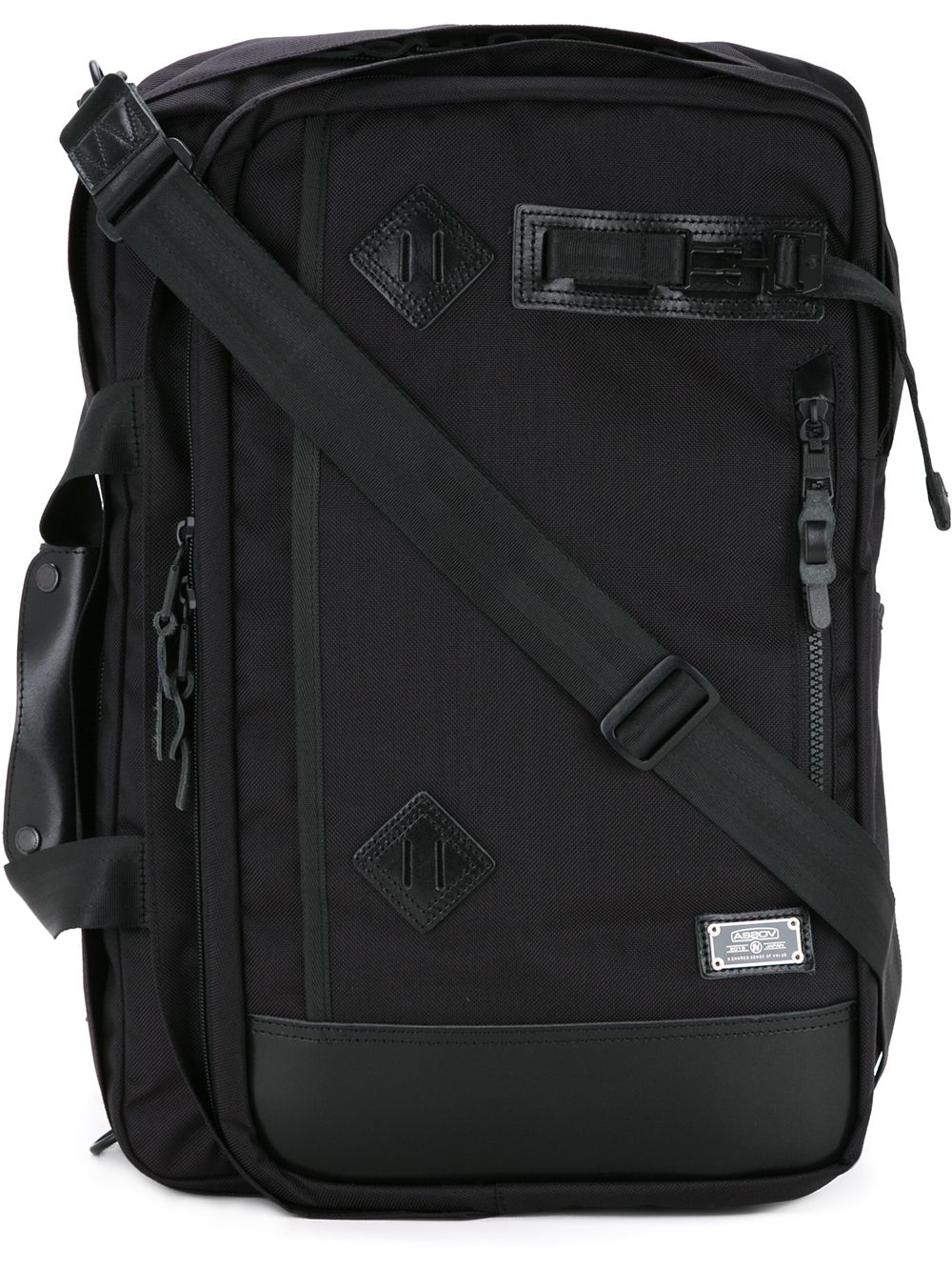 Black Ballistic nylon 3way backpack from AS2OV featuring adjustable shoulder straps, a front logo patch, a round top handle and a zip fastening.